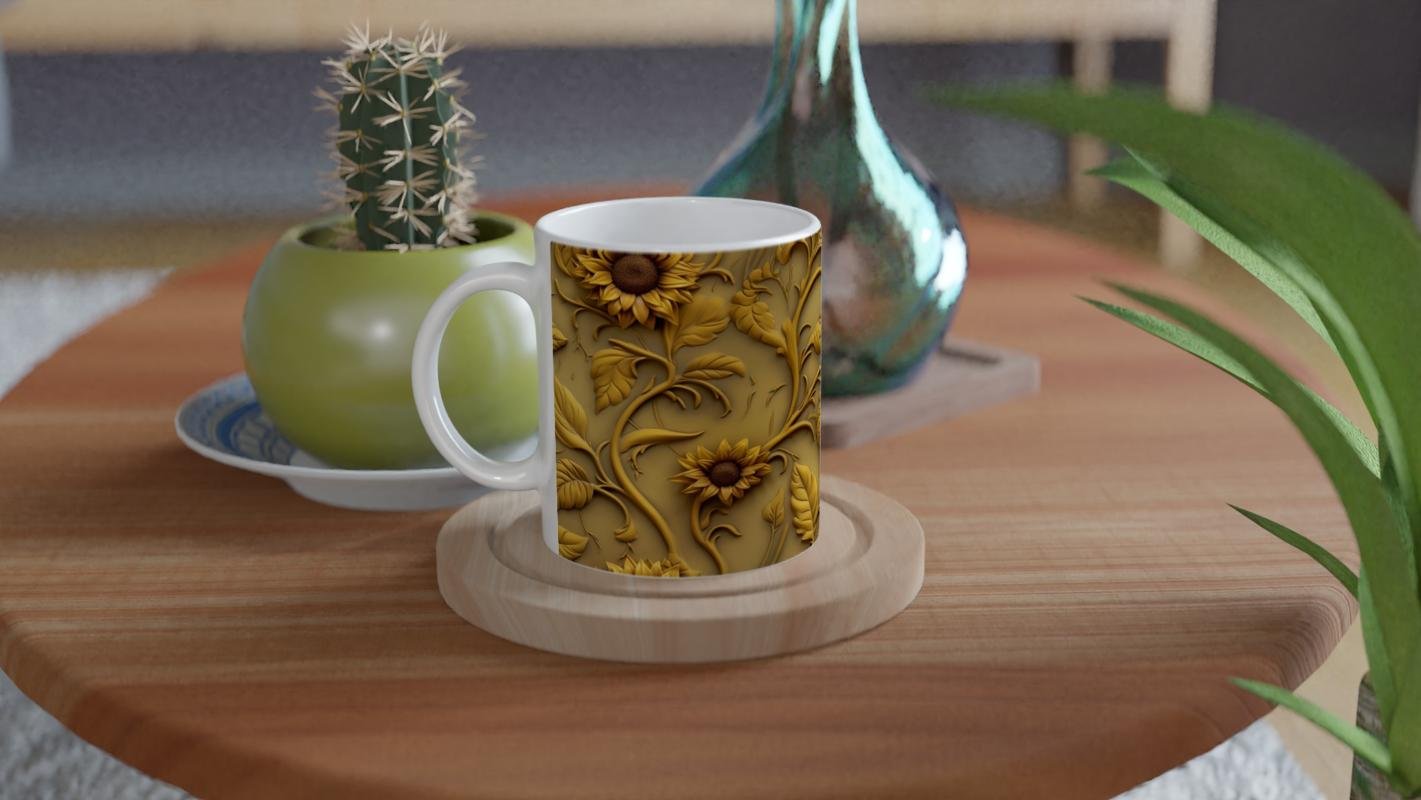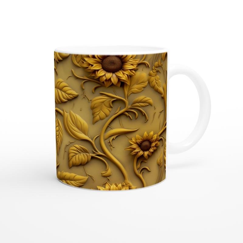 Zengin altın tonlarında, rölyef görünümlü ayçiçeği desenleriyle bezenmiş bu özel kupa bardak, klasik ve lüks tasarımlardan hoşlananlar için eşsiz bir tercih sunuyor.