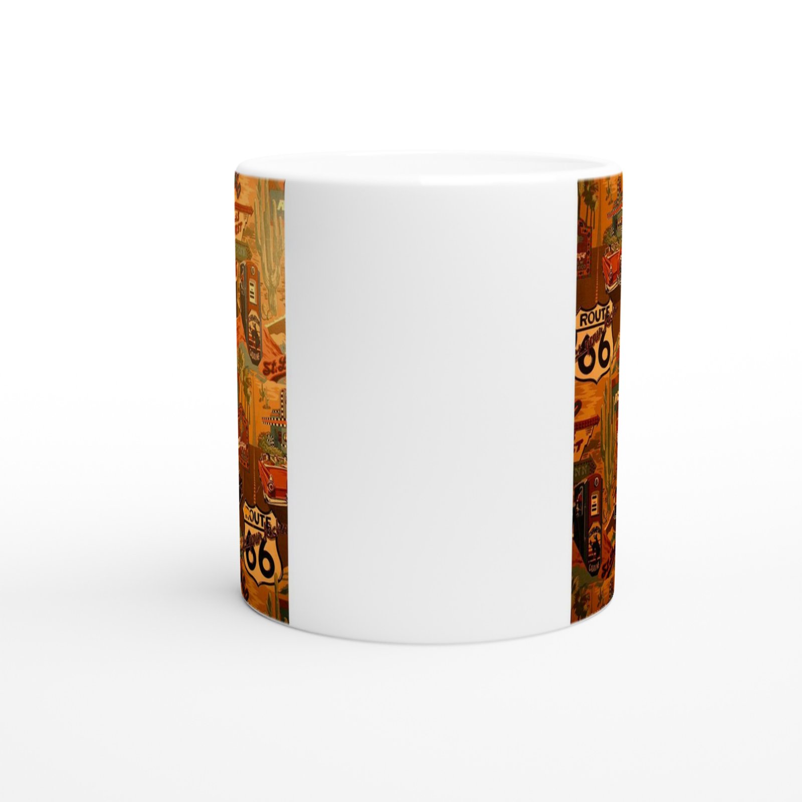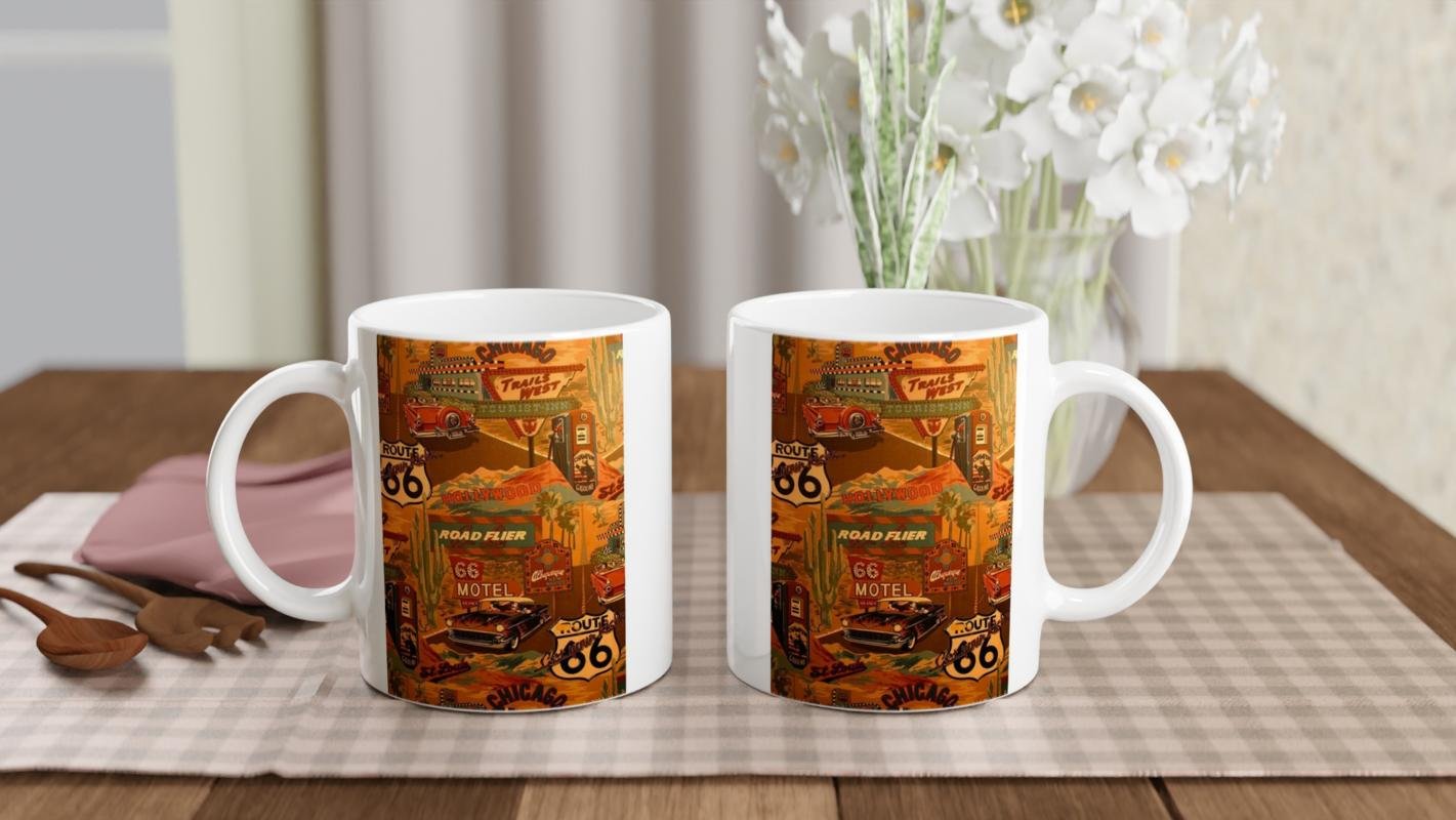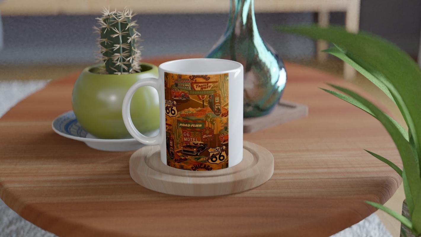 Palmiye ağaçları, benzin pompaları, eski arabalar ve neon motel tabelalarıyla dolu bu tasarım, yol hikayelerini sevenler için ideal bir hediye alternatifi.
