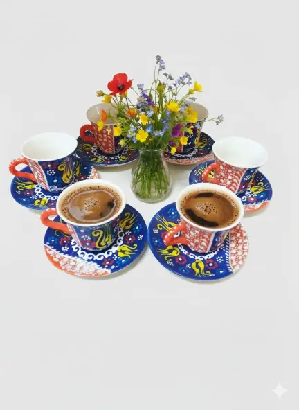 Anadolu Motifli El Yapımı Seramik Kahve Fincan Takımı – Geleneksel Çini Desenli