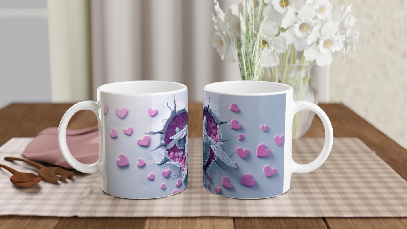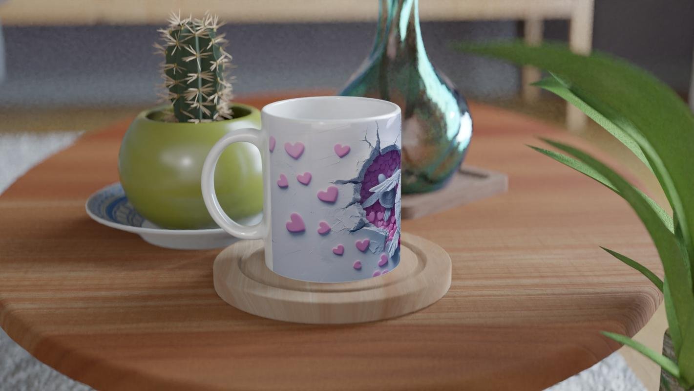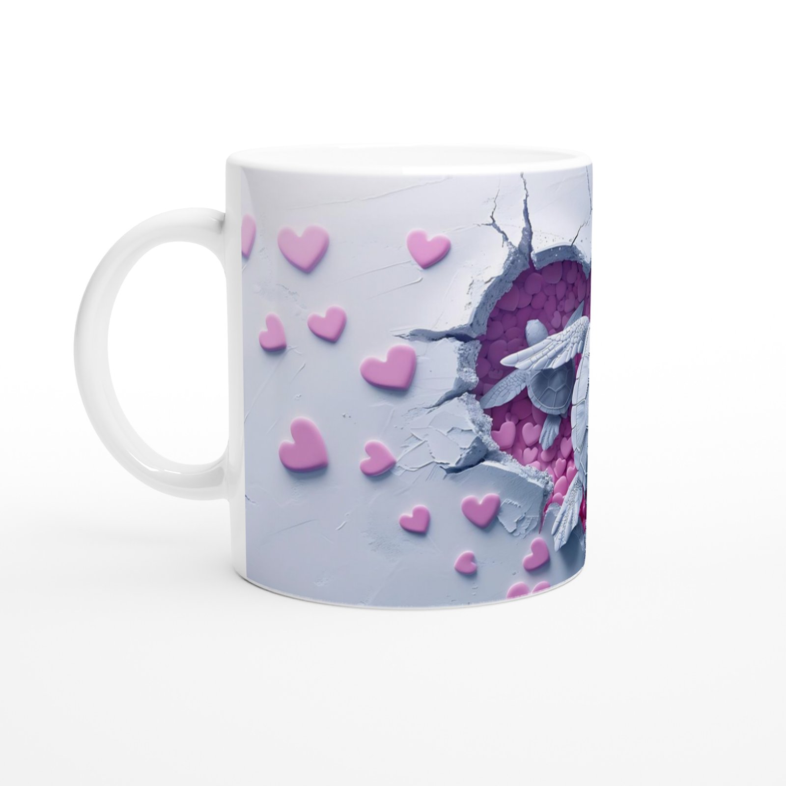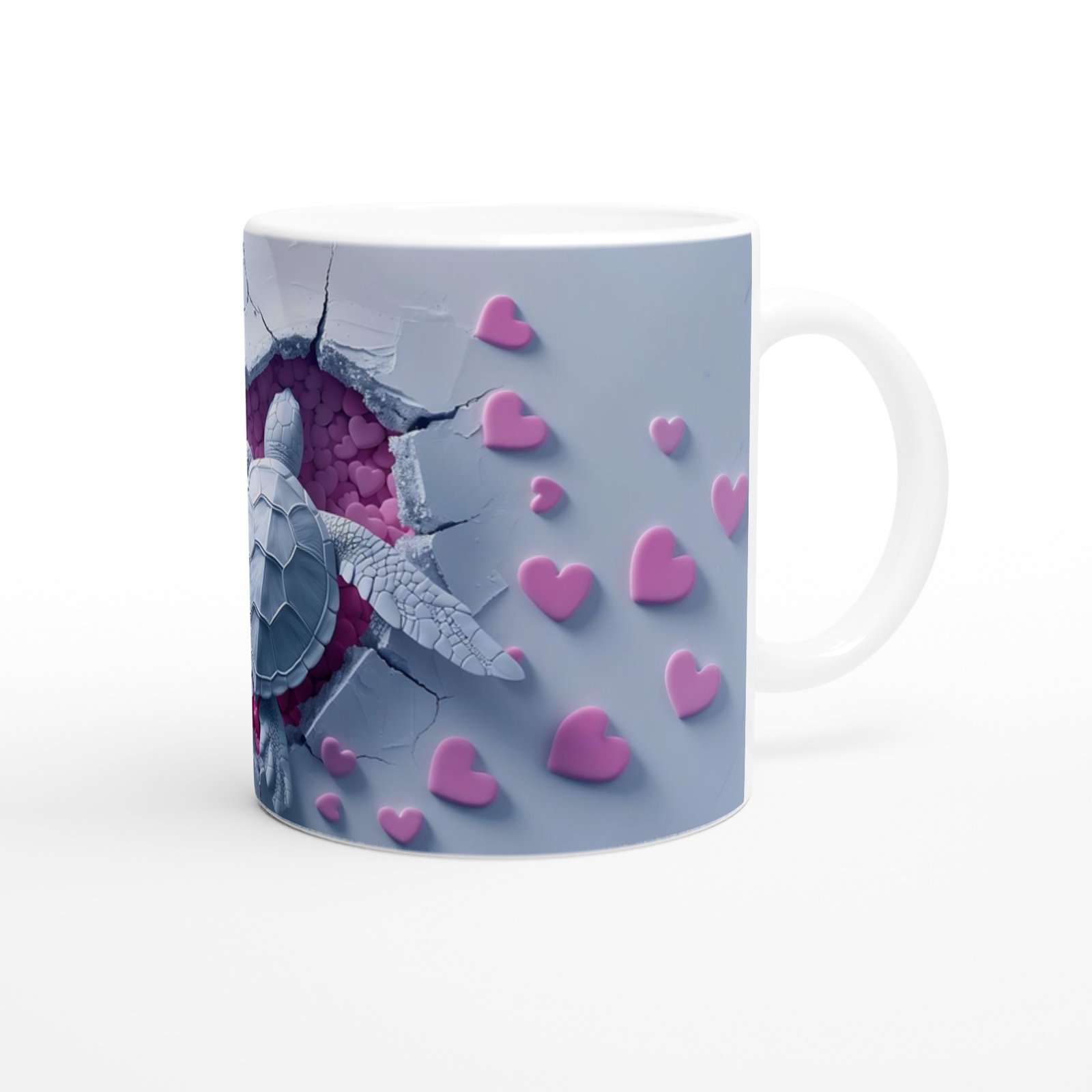 Kalp Dolu Zeminde Yüzen Aşık Kaplumbağalar Temalı Baskılı Kupa Bardak, kırık zeminden bakıldığında ortaya çıkan pembe kalp denizi ve birlikte yüzen iki kaplumbağa ile aşkın sakinliğini ve zarafetini anlatıyor. Sevgililer Günü'ne özel anlamlı bir hediye.