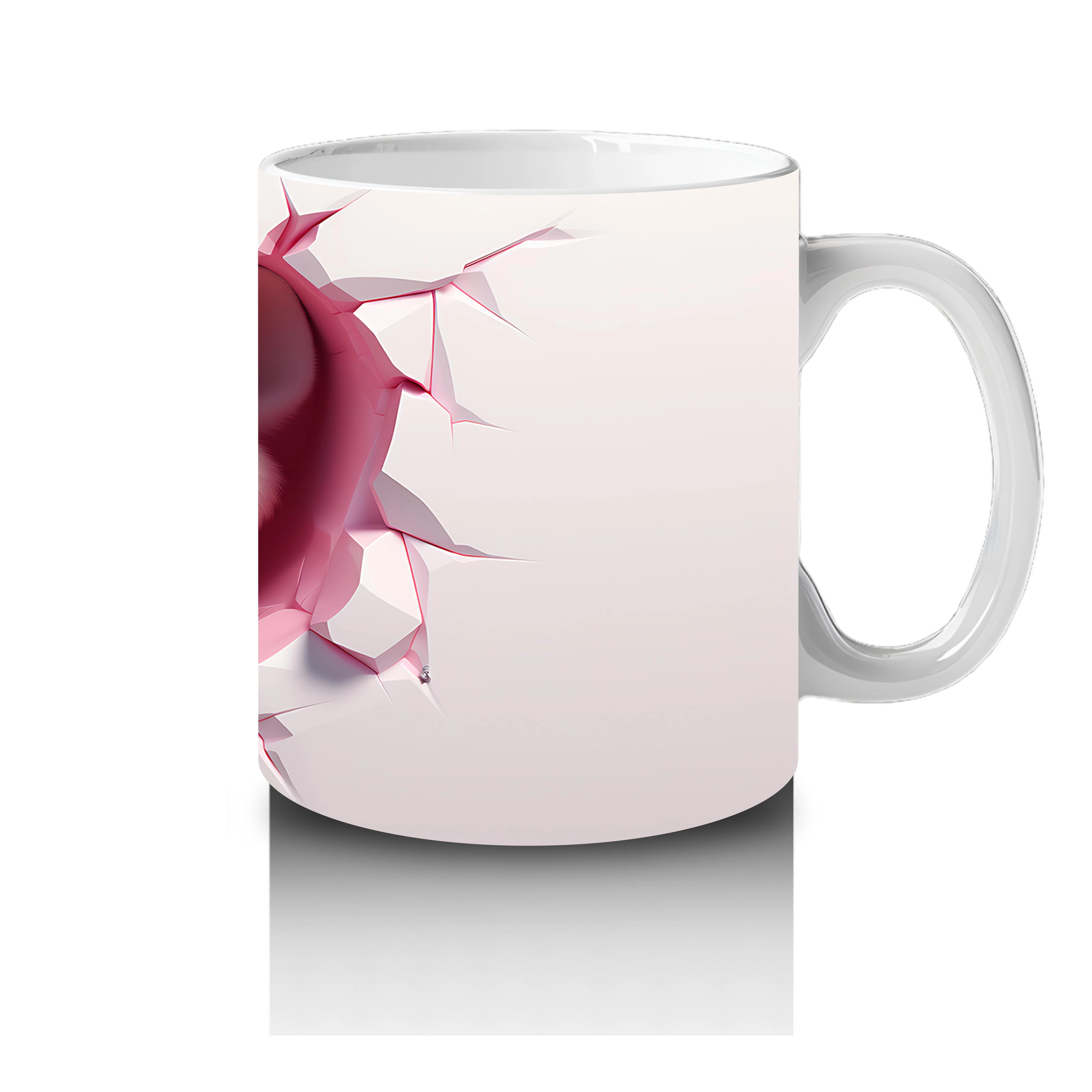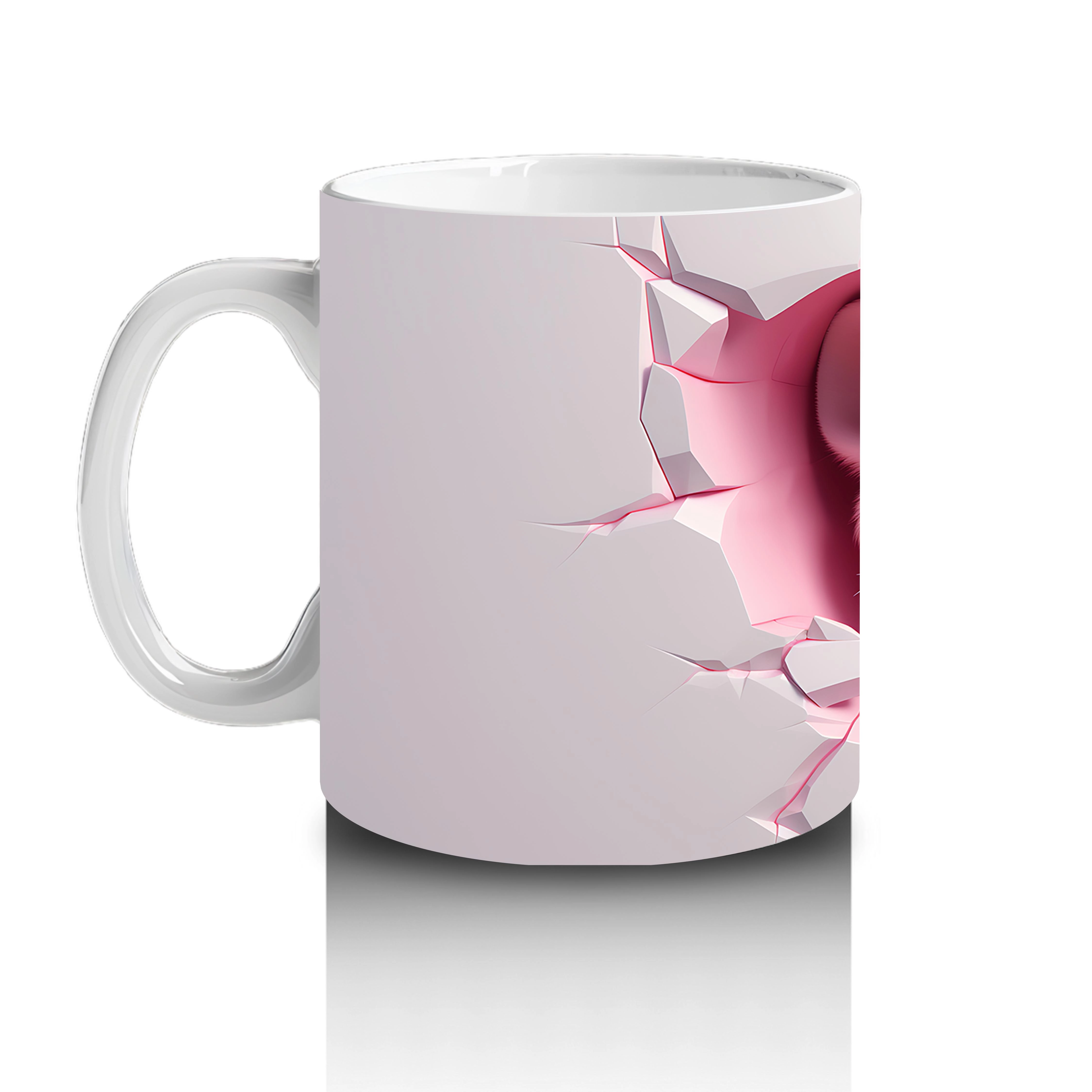 Çatlamış pembe duvarın kalp figürleriyle birleştiği bu tasarım, aşkın içtenliğini simgeliyor. Romantik detayları sevenler için sade ama duygusal bir kupa seçeneği.