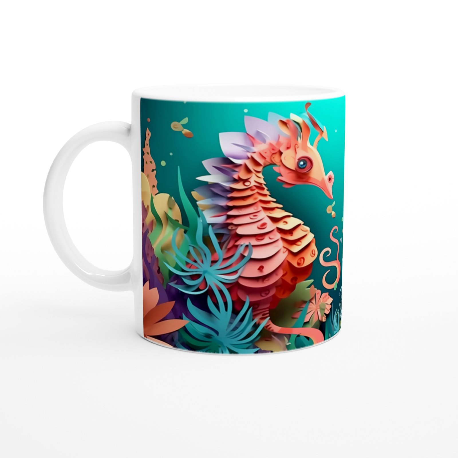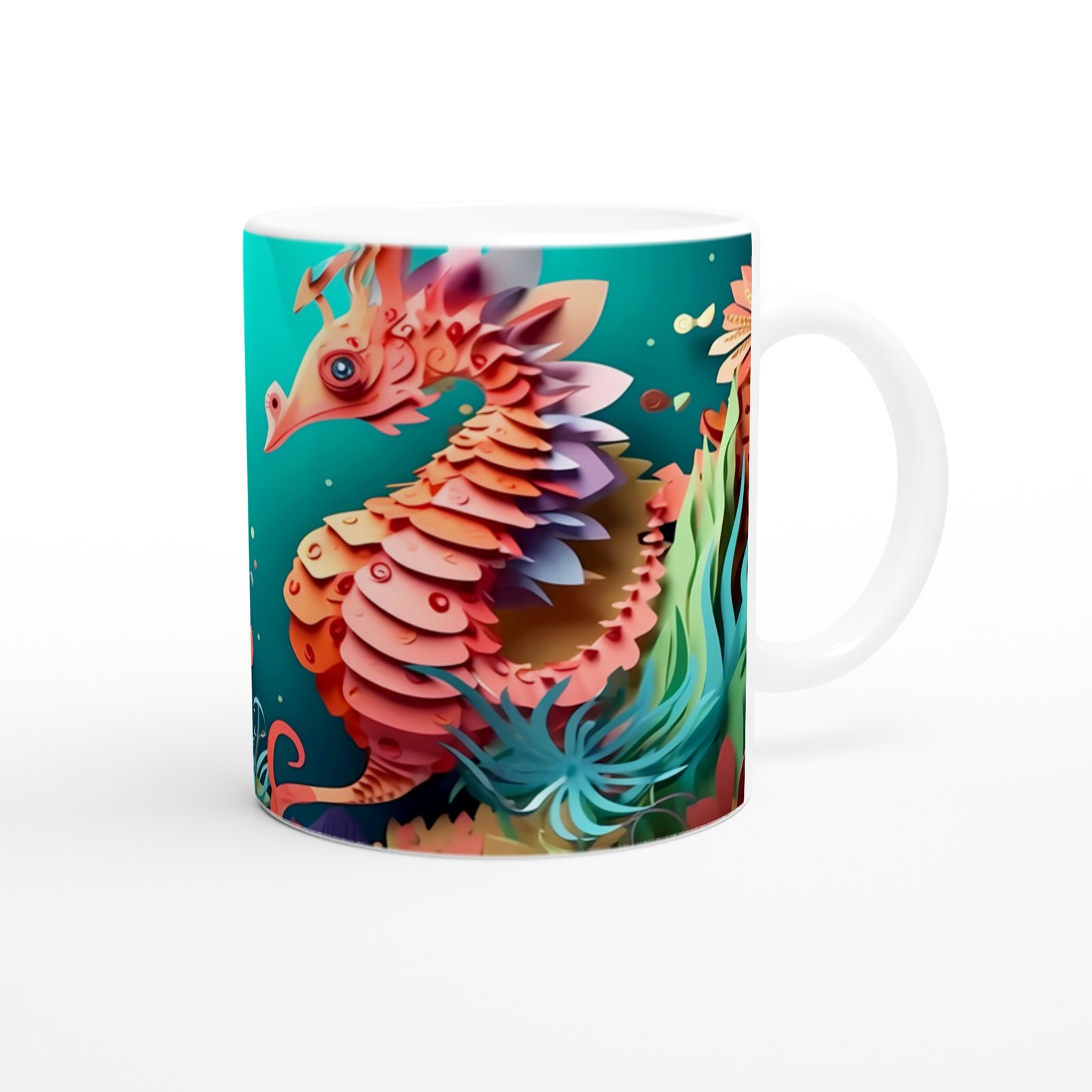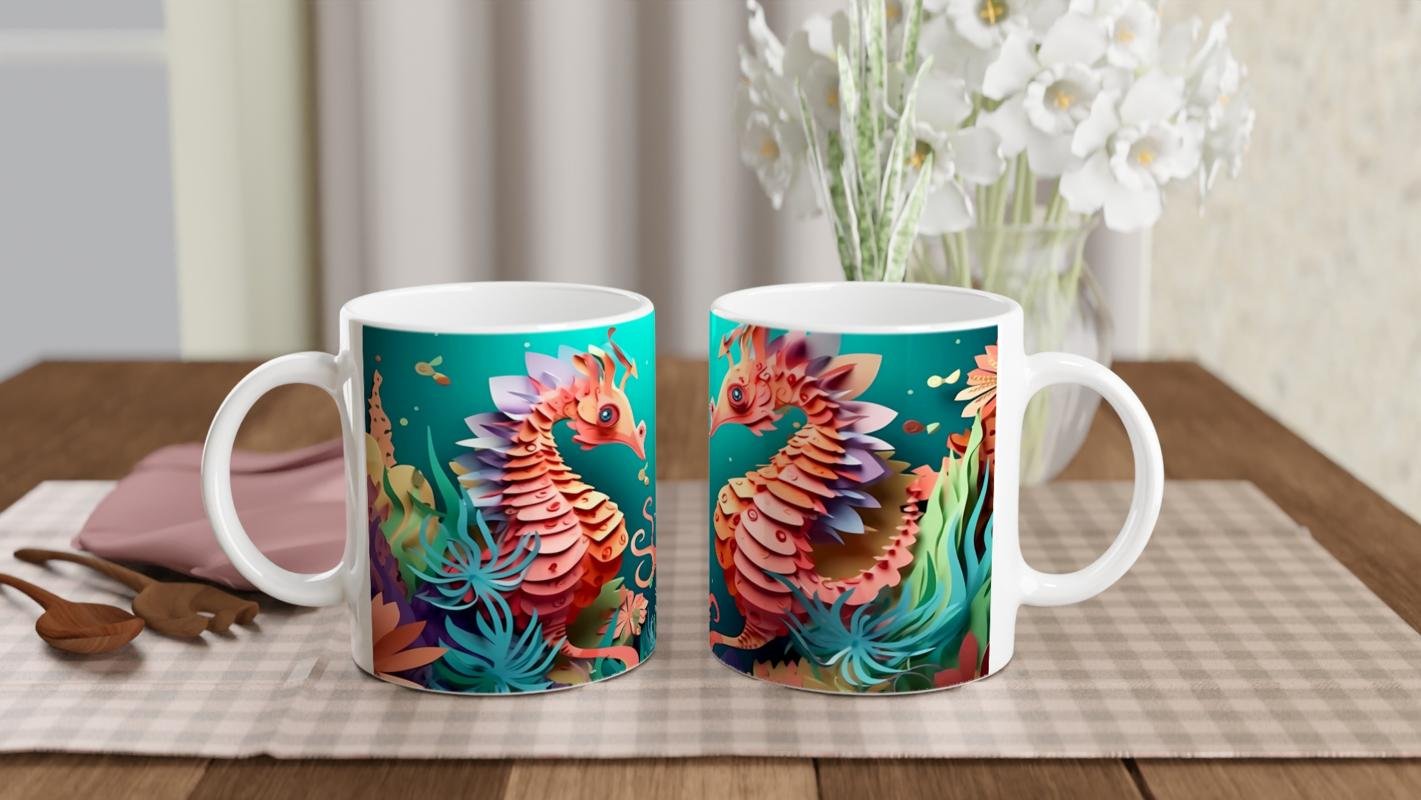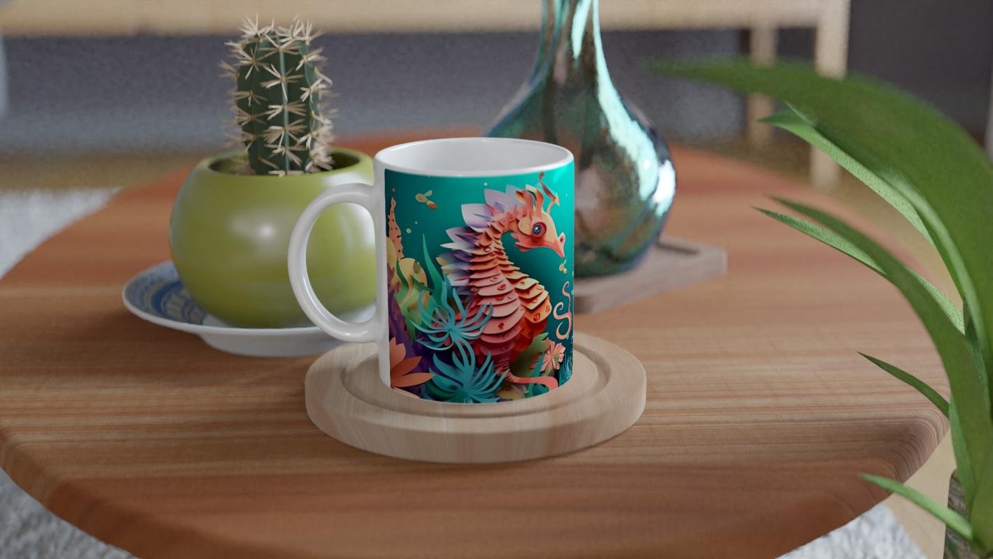 Karşılıklı bakan iki denizatının renkli dünyasını yansıtan bu kupa bardak, romantik ve eğlenceli bir tasarım sunar.