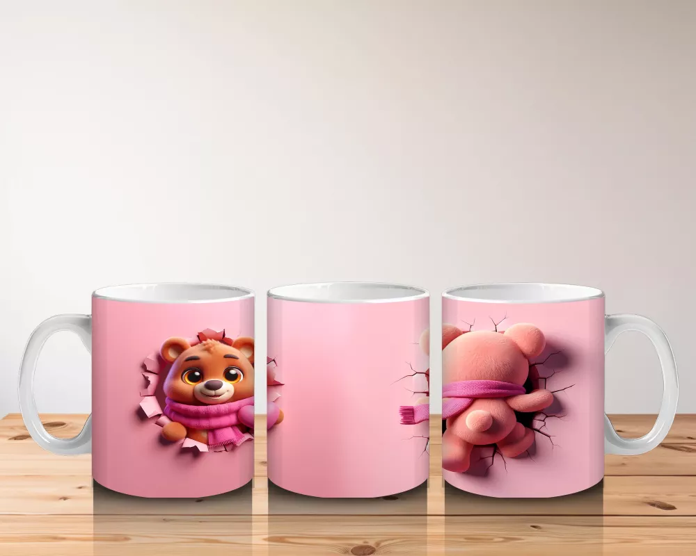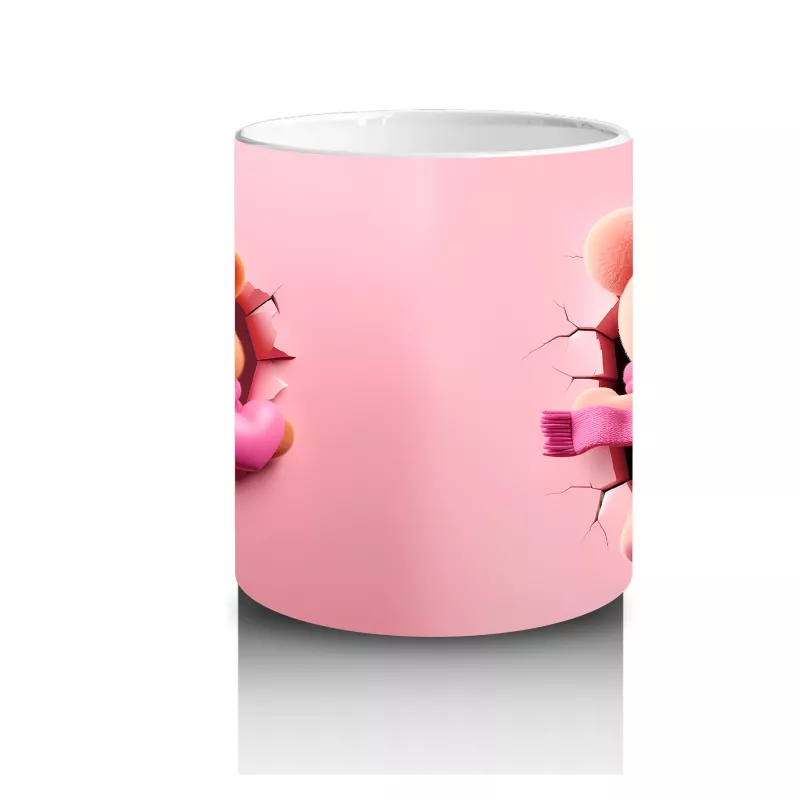 Pembe şal detaylı kalpli figür tutan sevimli ayıcık karakteri, romantik ve içten bir görünüm sunuyor. Romantik ve pozitif tasarımlar arayanlara hitap eden özel bir kupa.