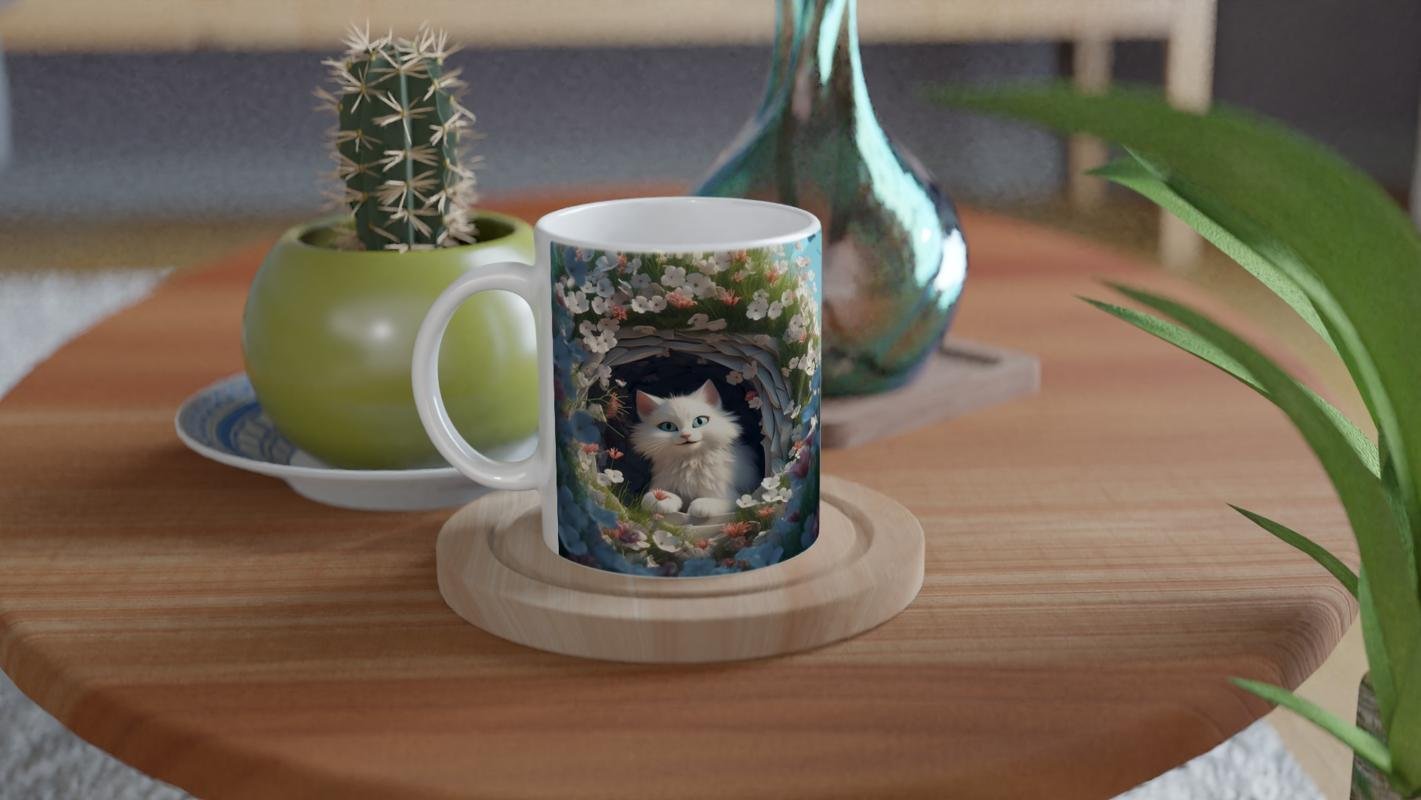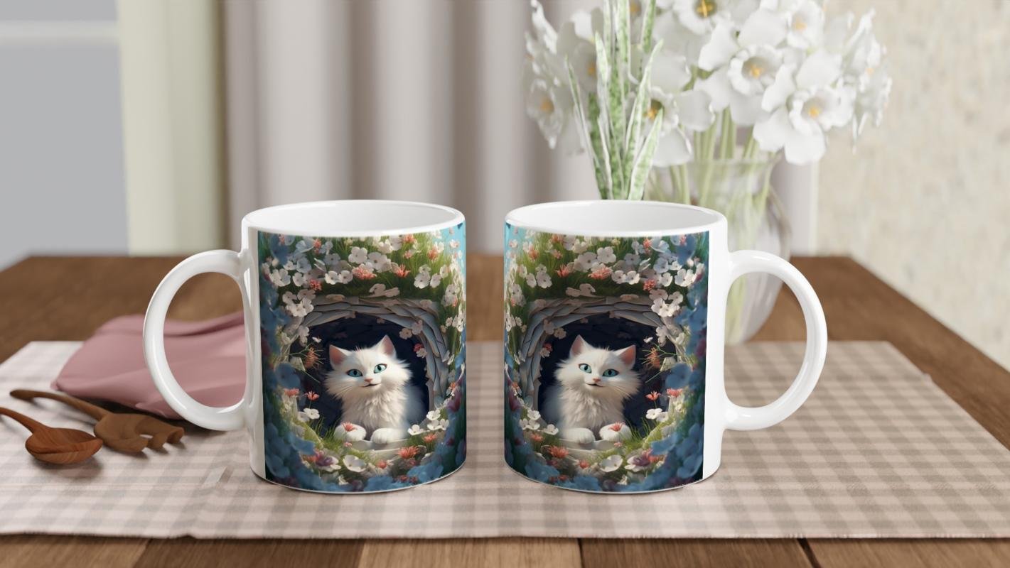 Bahar çiçekleriyle dolu bir yuva içinde parlayan mavi gözlü beyaz kediyle tasarlanmış bu çiçekli kedi kupa bardak, neşe ve zarafeti bir araya getiriyor.