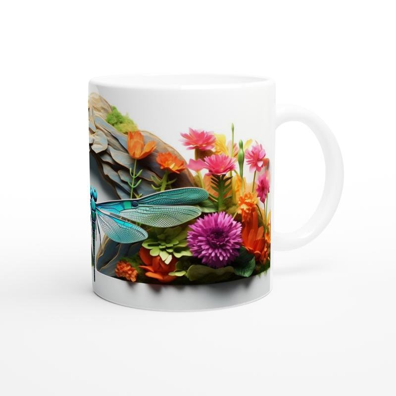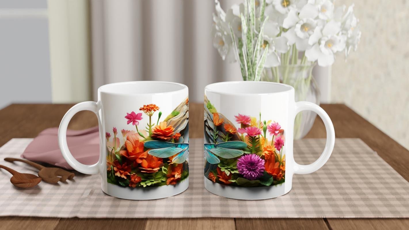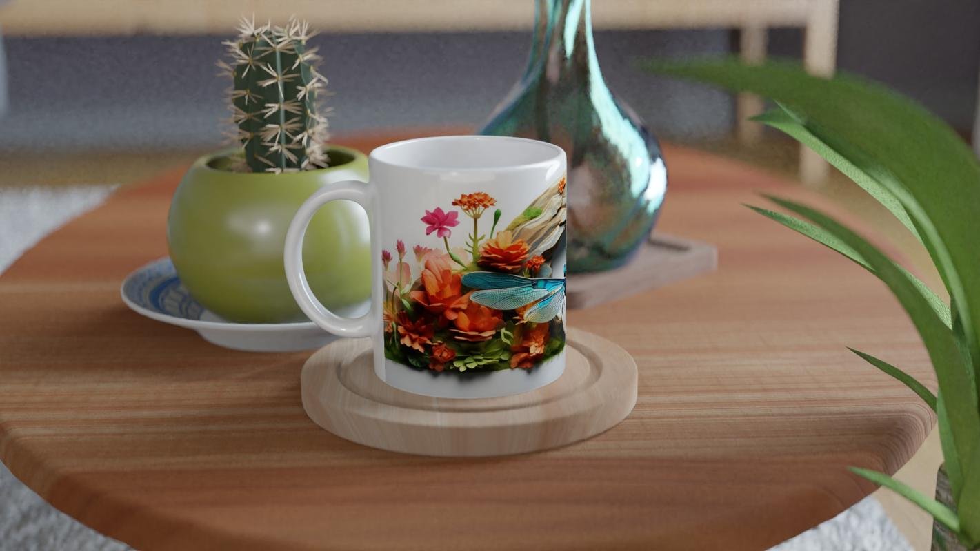 Çiçek Bahçesinde Yüzünü Gösteren Yusufçuk Temalı Baskılı Kupa Bardak, rengarenk çiçekler ve taş formundaki yuvasıyla baharın enerjisini ve zarif bir dengeyi buluşturuyor.
