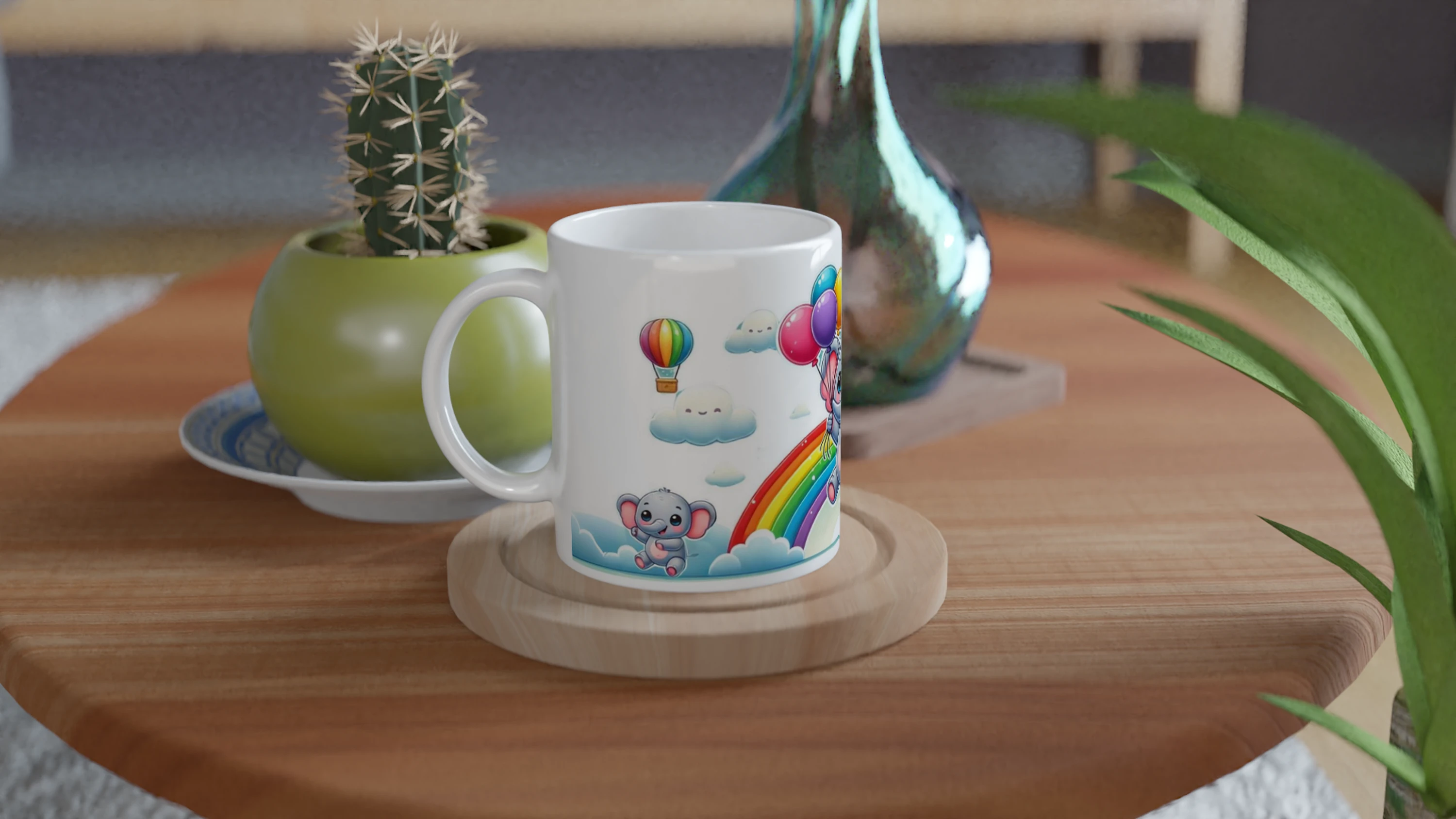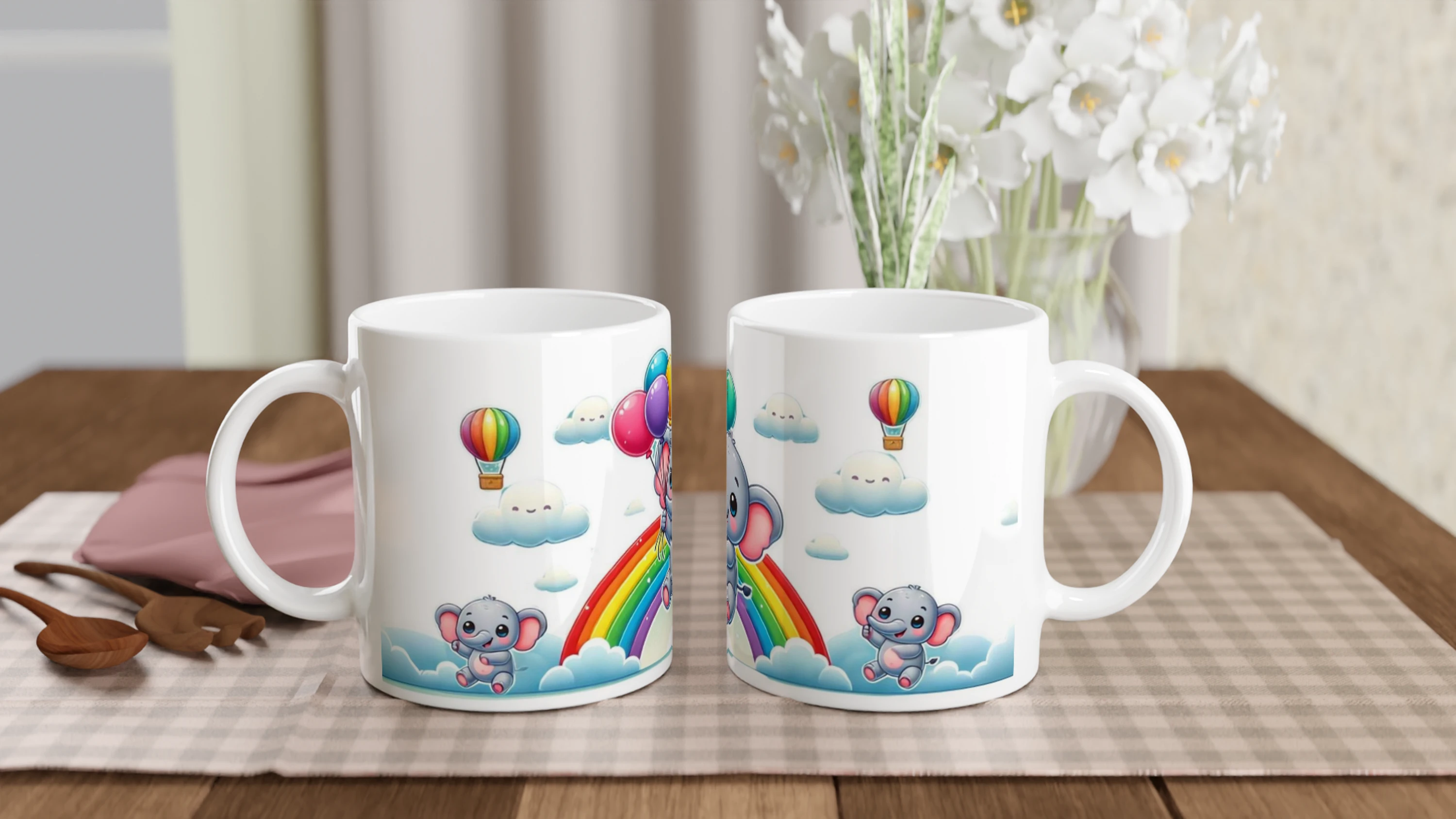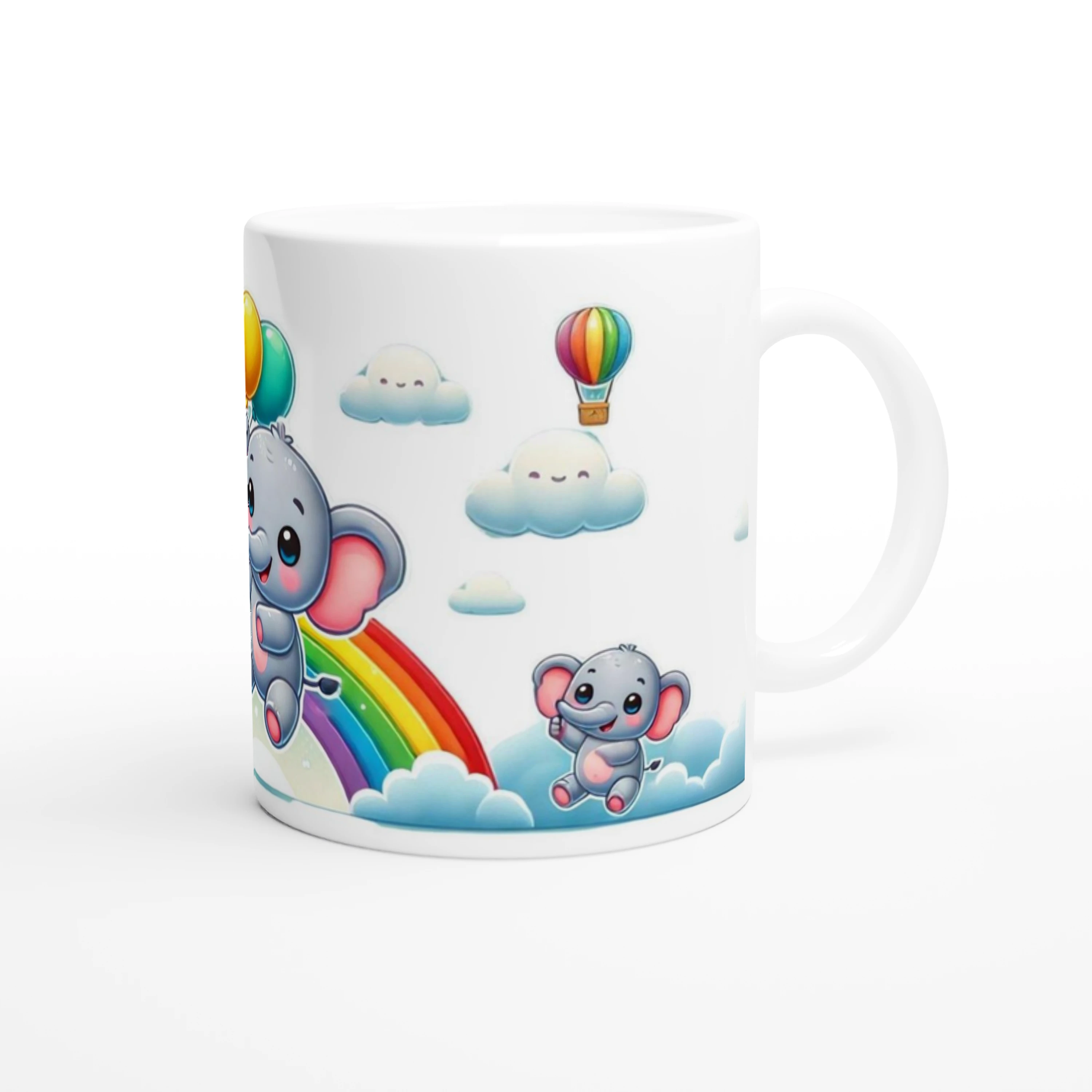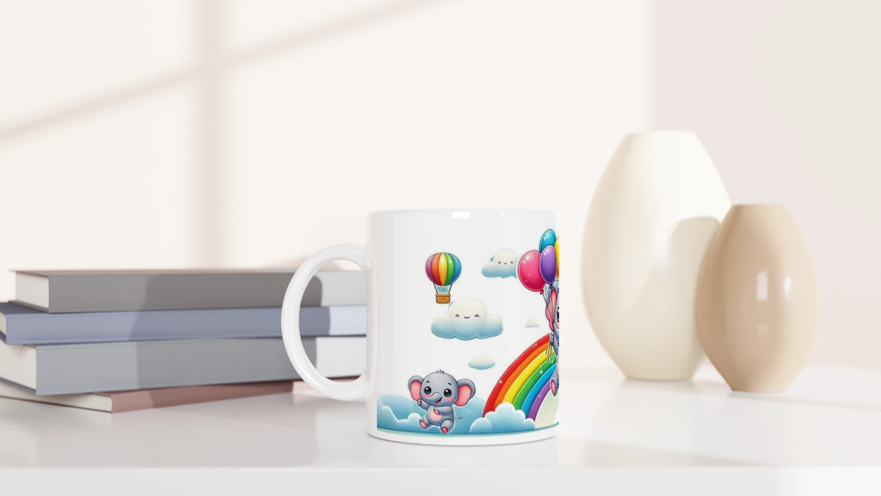 Balonlarla uçan sevimli fil ve gökkuşağı tasarımlı çocuk kupası. Renkli ve eğlenceli detaylarıyla minikler için mükemmel hediye!