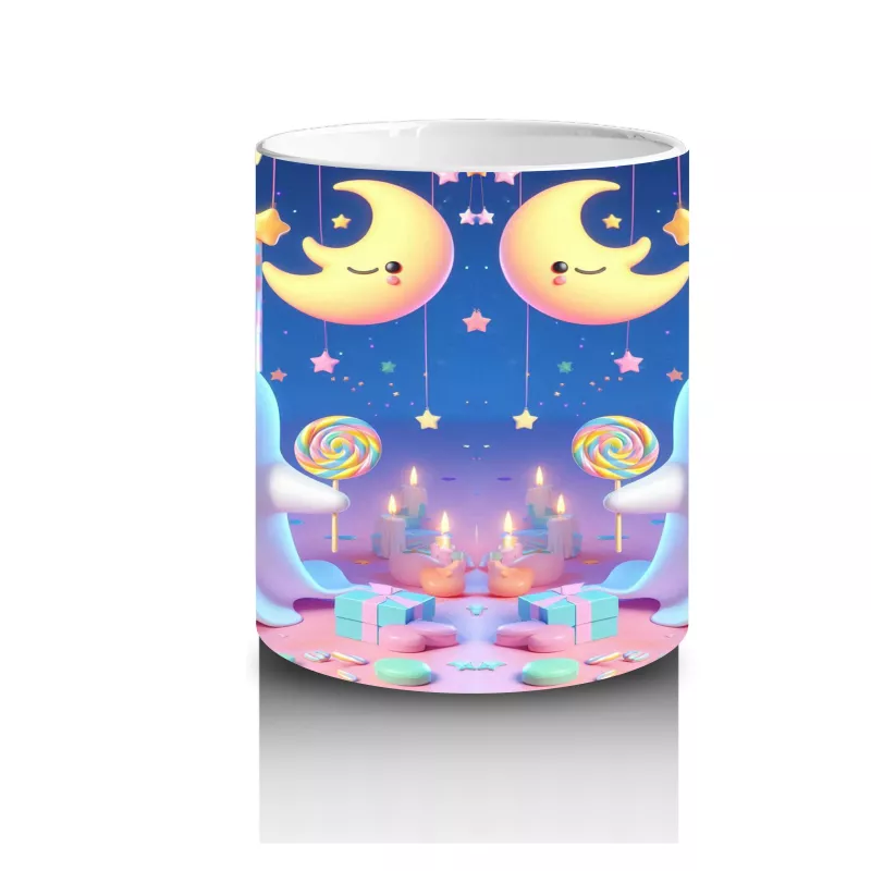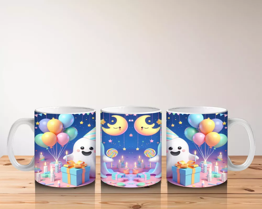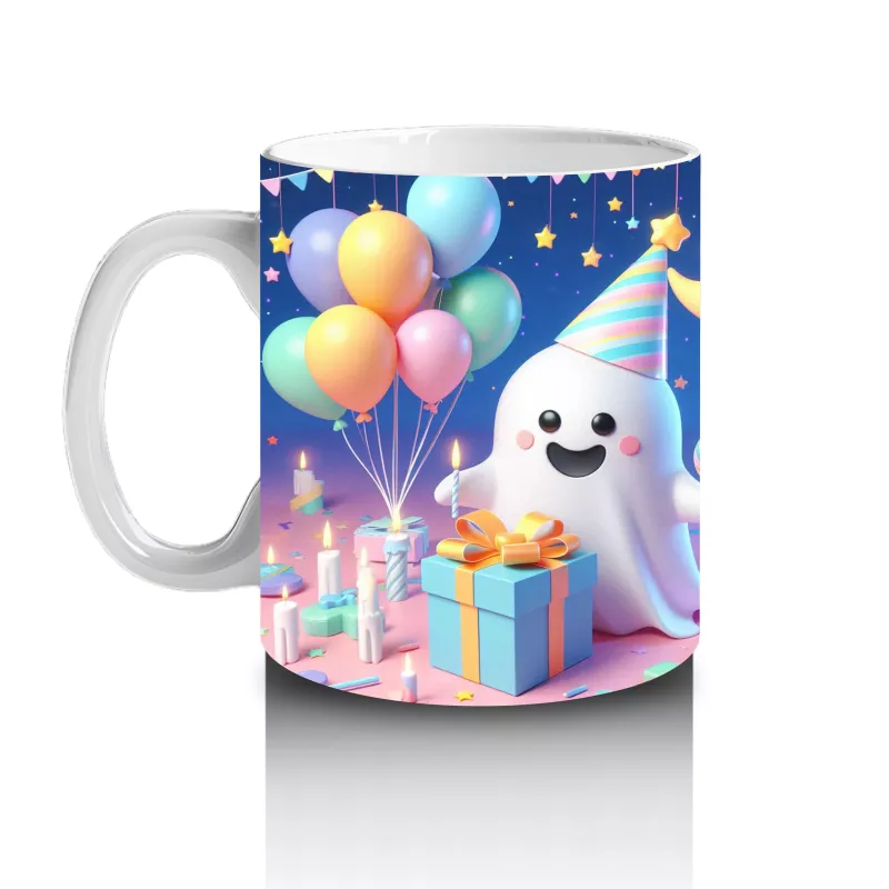 Balonlar ve ay figürleriyle tasarlanan sevimli hayalet temalı bu kupa, Halloween kutlamalarınıza tatlı ve neşeli bir hava ekler.