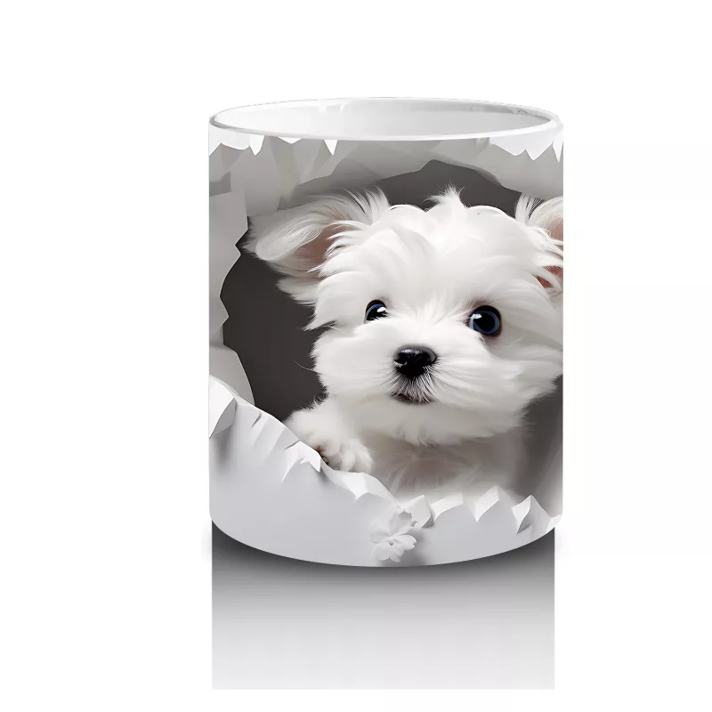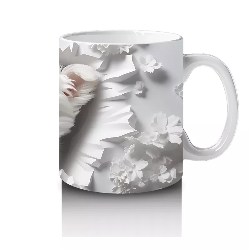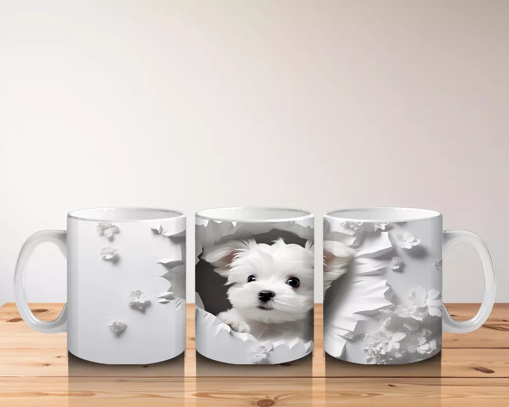 Beyaz Çiçekler Önünde Sevimli Yavru Köpek – Baskılı Kahve Kupası