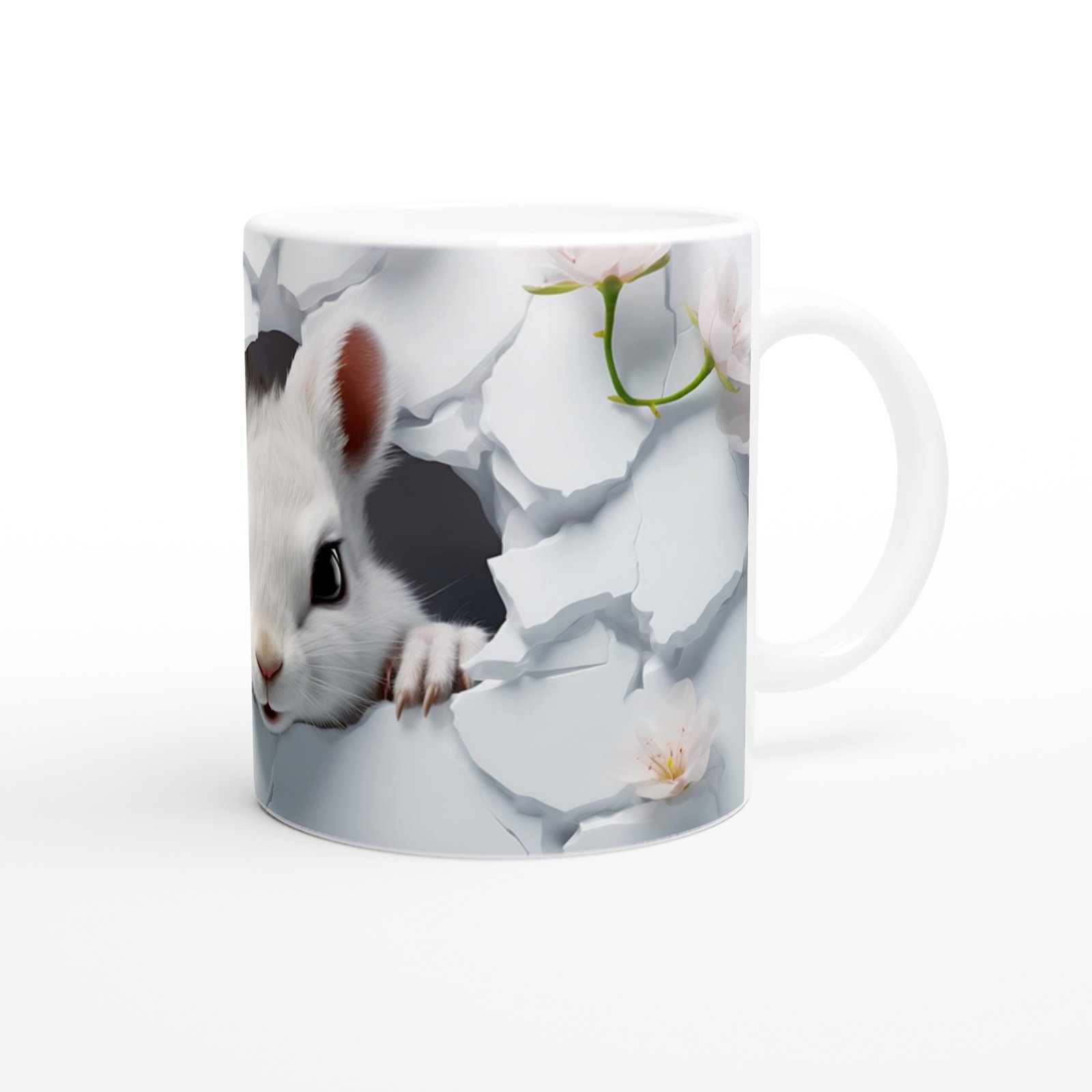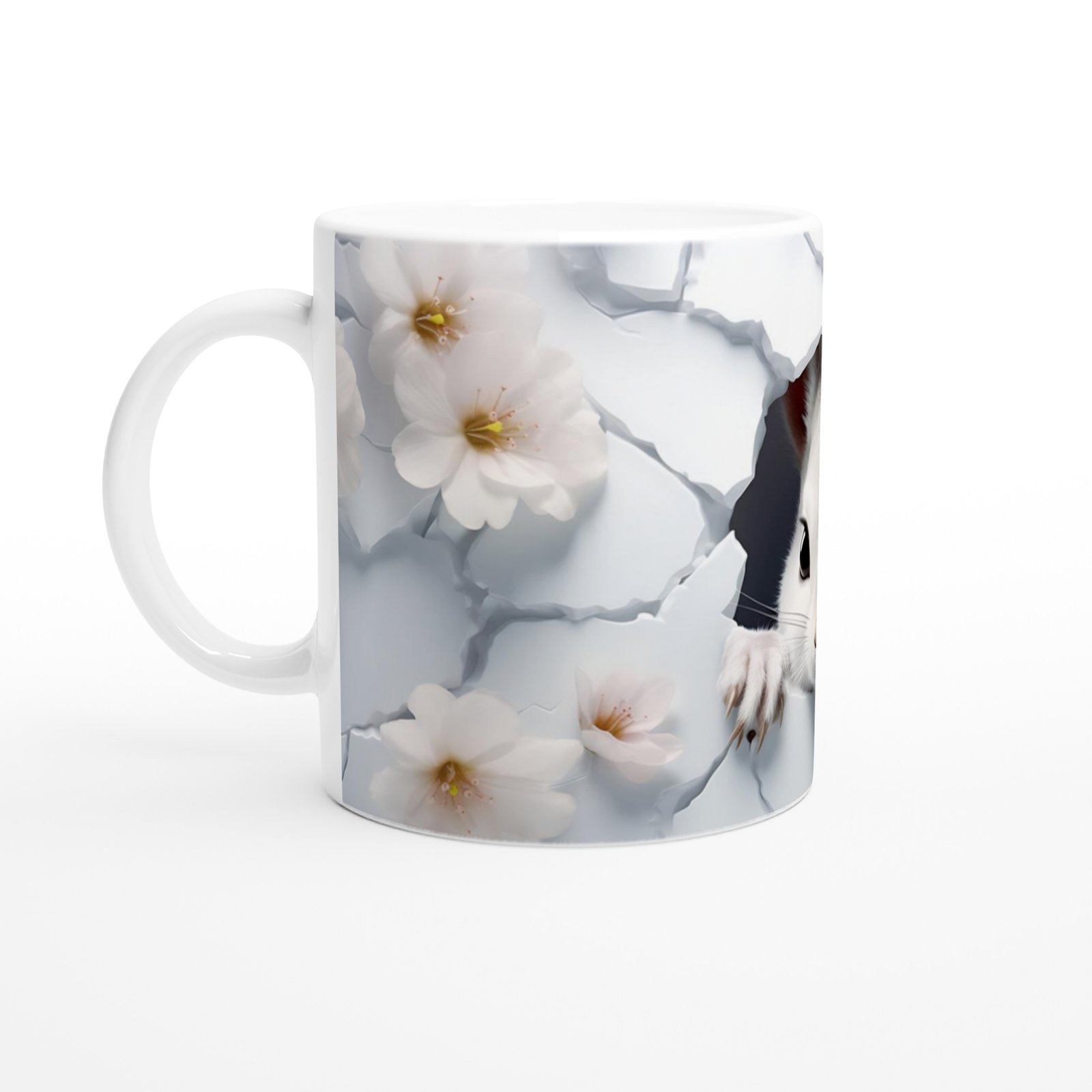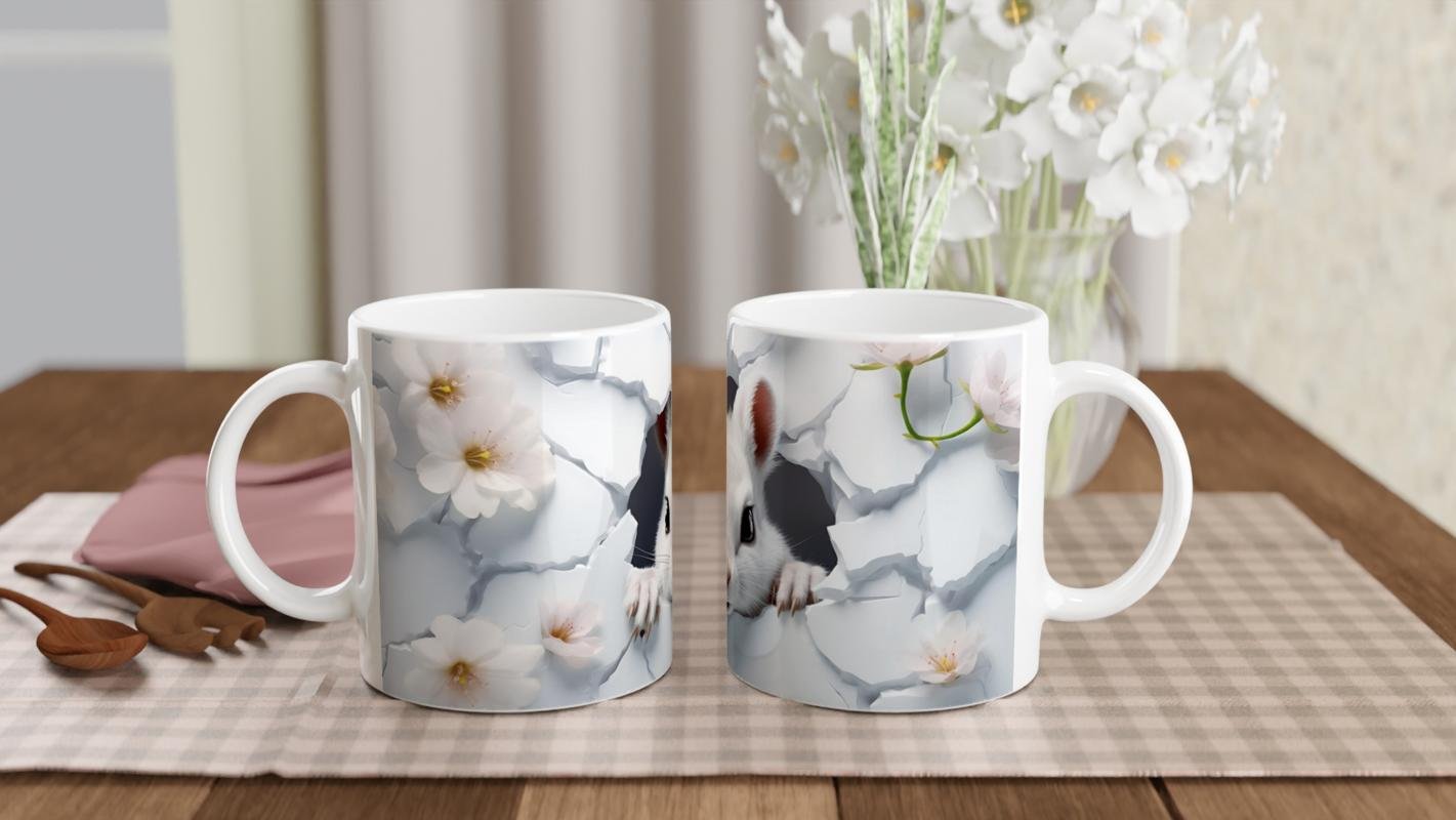 Çatlak Duvardan Bakan Beyaz Fare ve Bahar Çiçekleri Temalı Baskılı Kupa Bardak, zarif beyaz çiçeklerle süslenmiş arka plan ve çatlamış duvarın ardından çıkan fare figürüyle baharın tazeliğini ve doğanın canlılığını yansıtır.