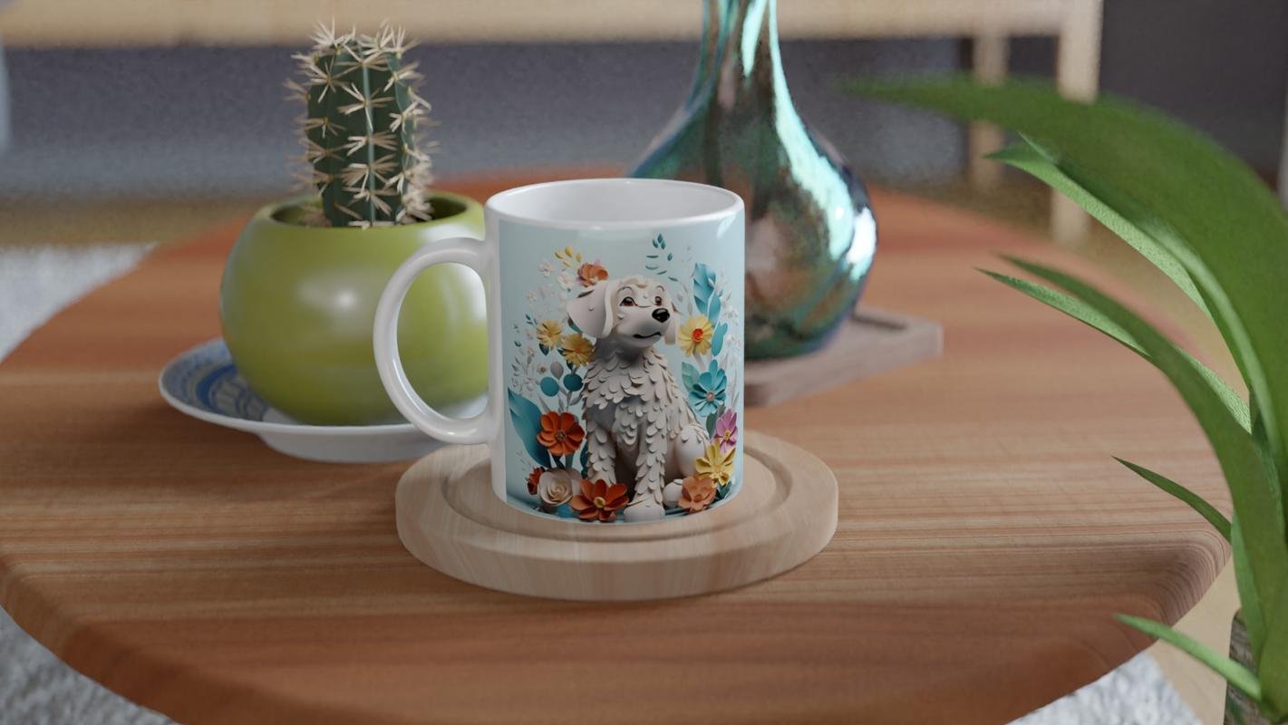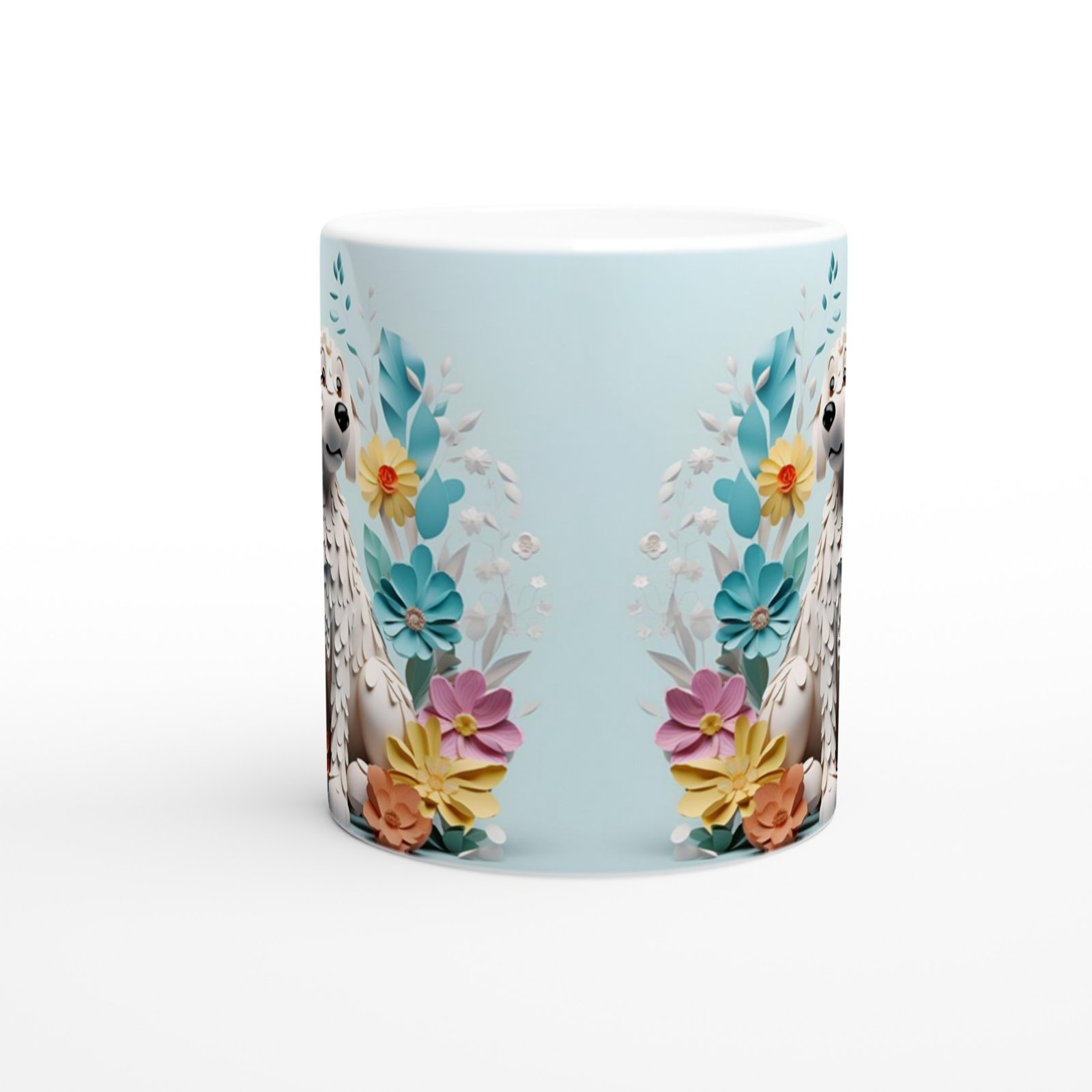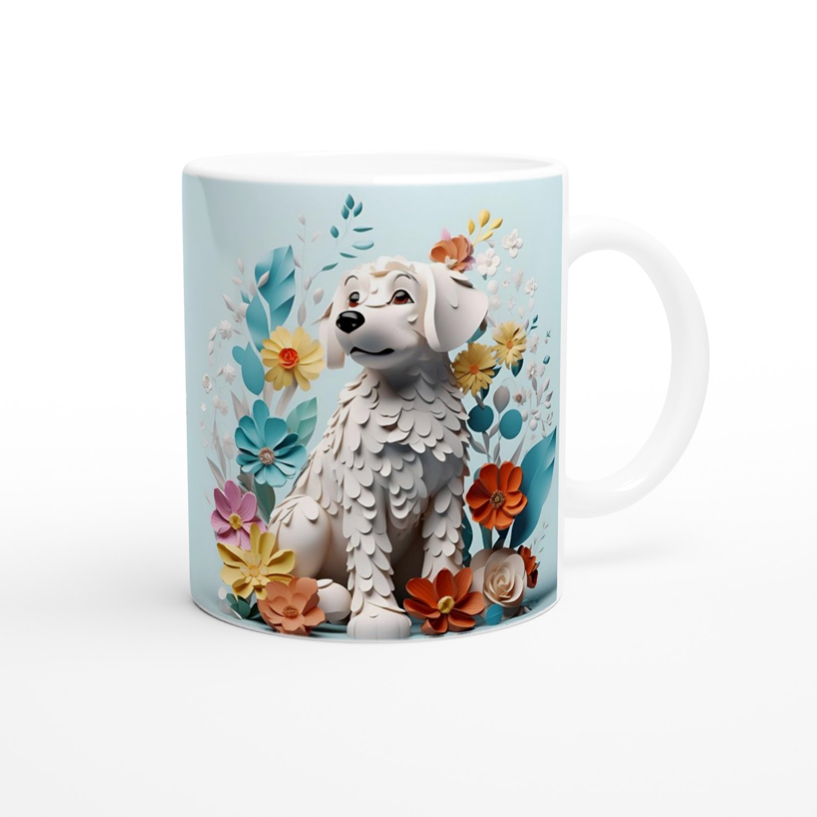 Sevimli, huzurlu ve stil sahibi! Bu beyaz köpek temalı kupa bardak, pastel renklerdeki çiçeklerle çevrelenmiş zarif bir tasarıma sahip.