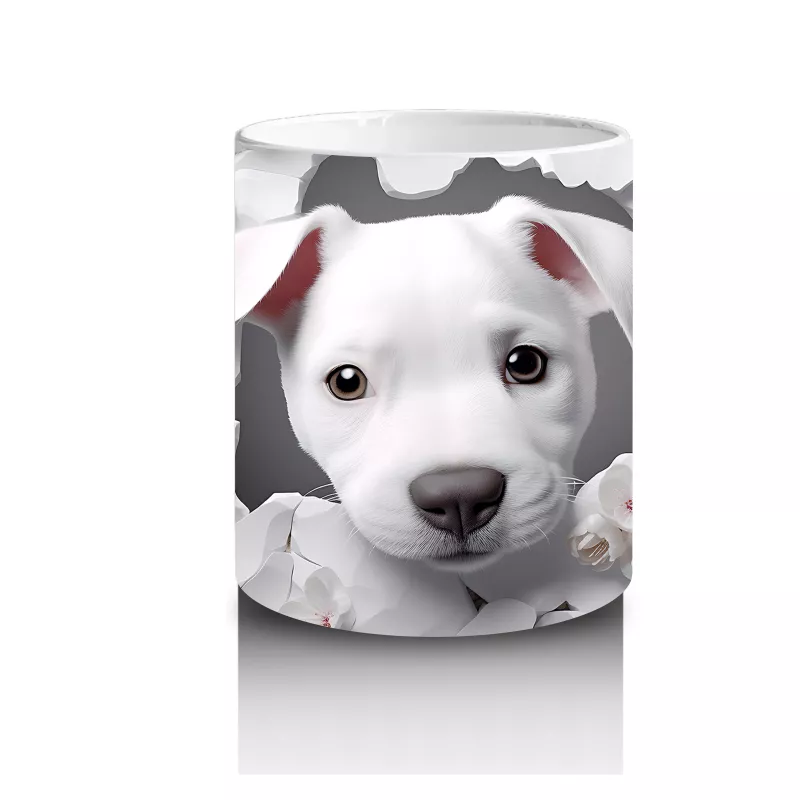 Çiçek desenli fonda duran sevimli beyaz köpek figürü, zarafet ve samimiyeti bir araya getiriyor. Romantik ve estetik tasarımlar arayanlar için özel bir alternatif.