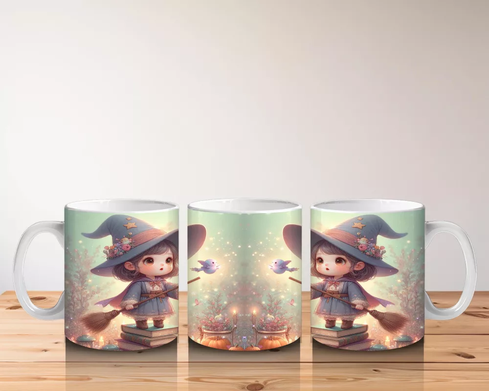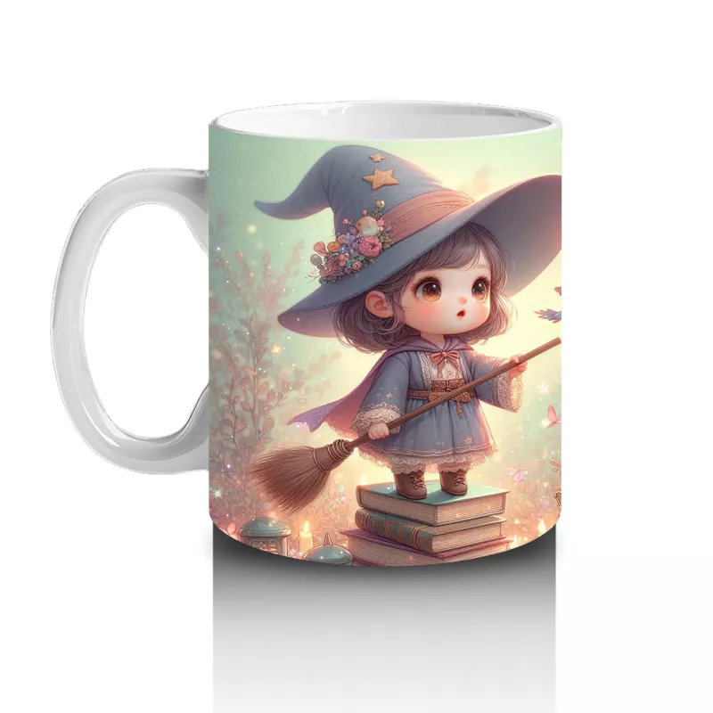 Büyü kitabı tutan sevimli cadı kız figürüyle hazırlanan bu çocuklara özel kupa bardak, Cadılar Bayramı’na neşeli ve büyülü bir atmosfer ekler.