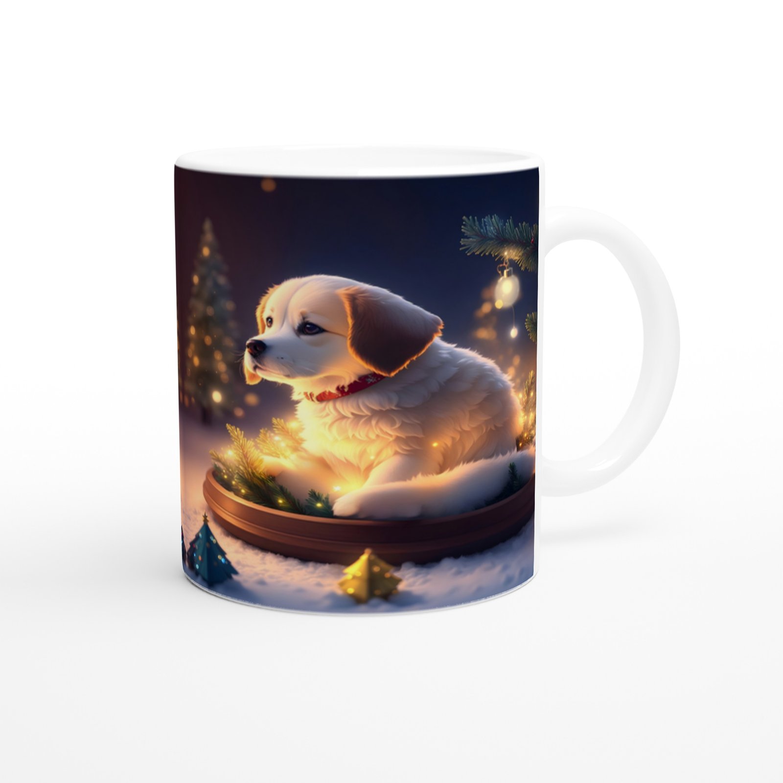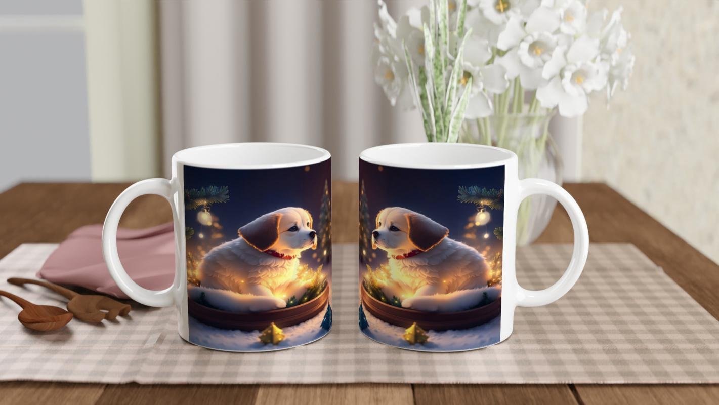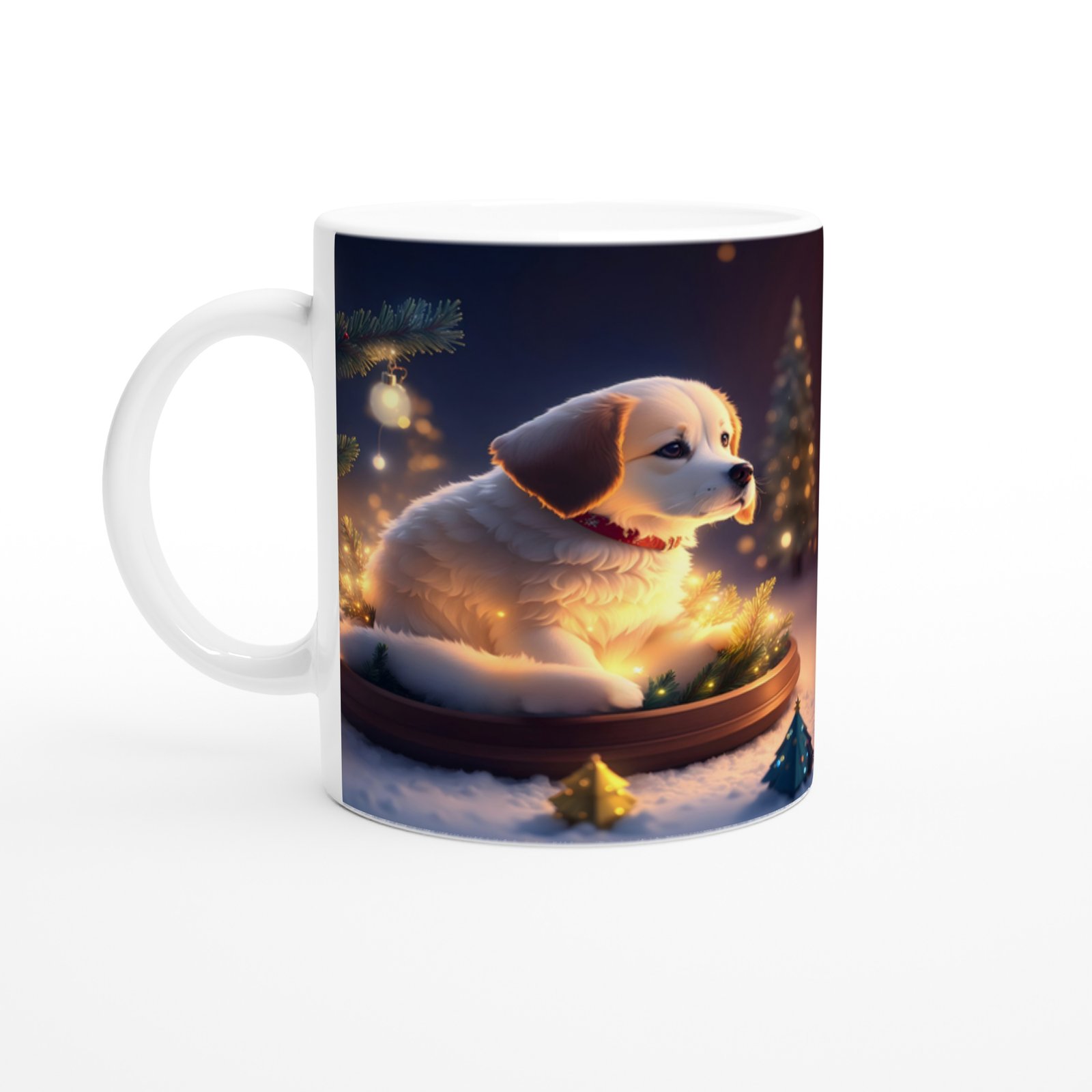 Çam Dallarına Sarınmış Işıl Işıl Köpekçik Baskılı Kupa Bardak, yumuşak detayları ve nostaljik atmosferiyle yılbaşı hediyesi olarak öne çıkan özel bir parçadır.