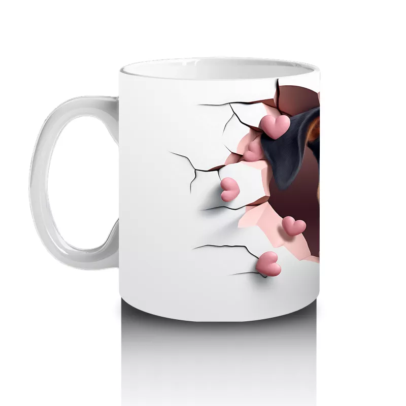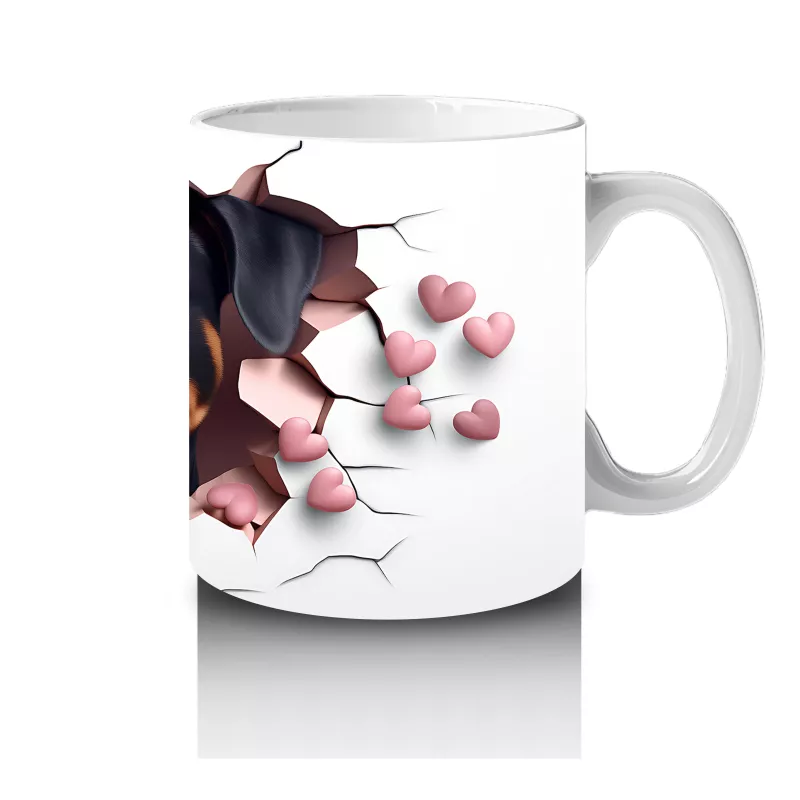 Çatlak duvarın ardından dikkatle bakan sevimli siyah köpek, meraklı ve korumacı ifadesiyle bu kupaya karakter katıyor. Sadık dostların enerjisi hep sizinle.