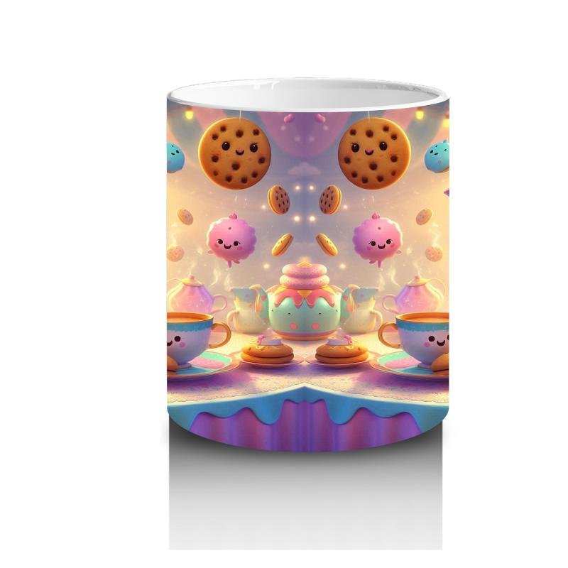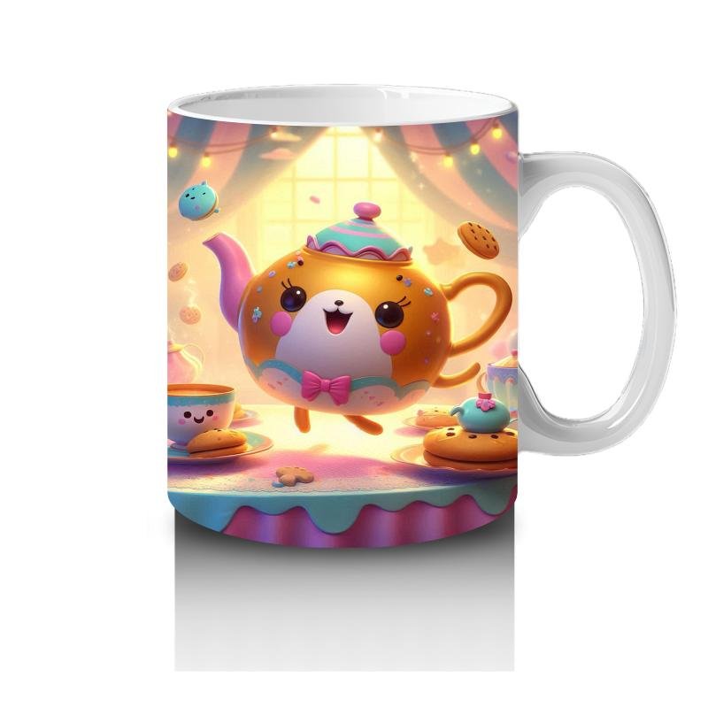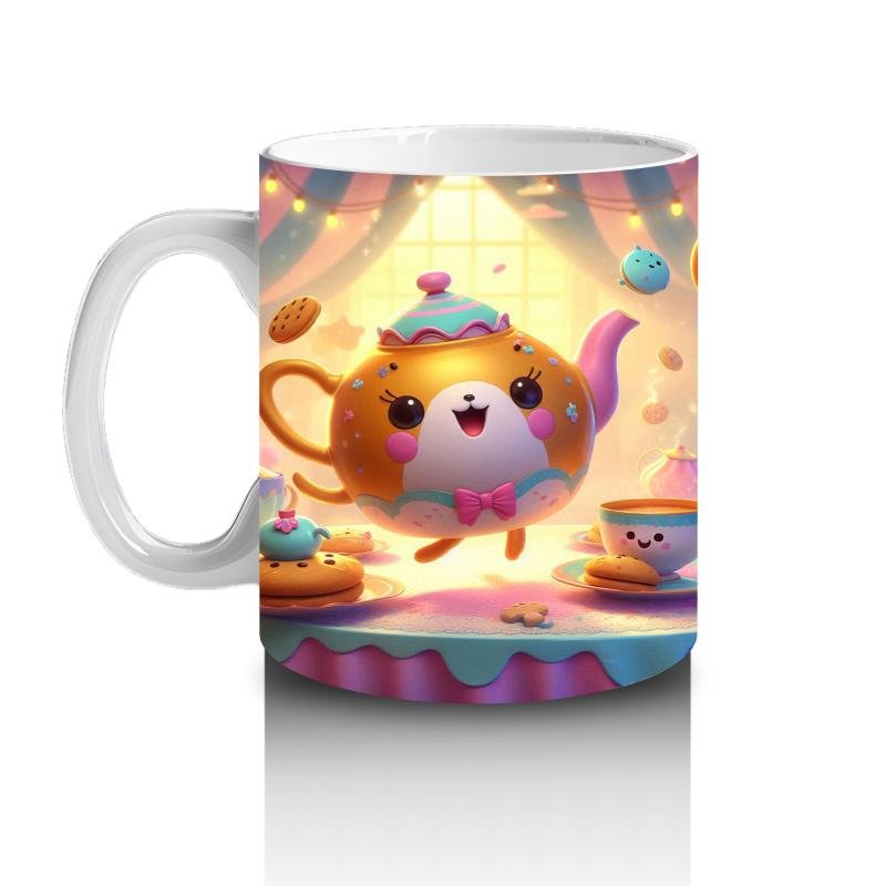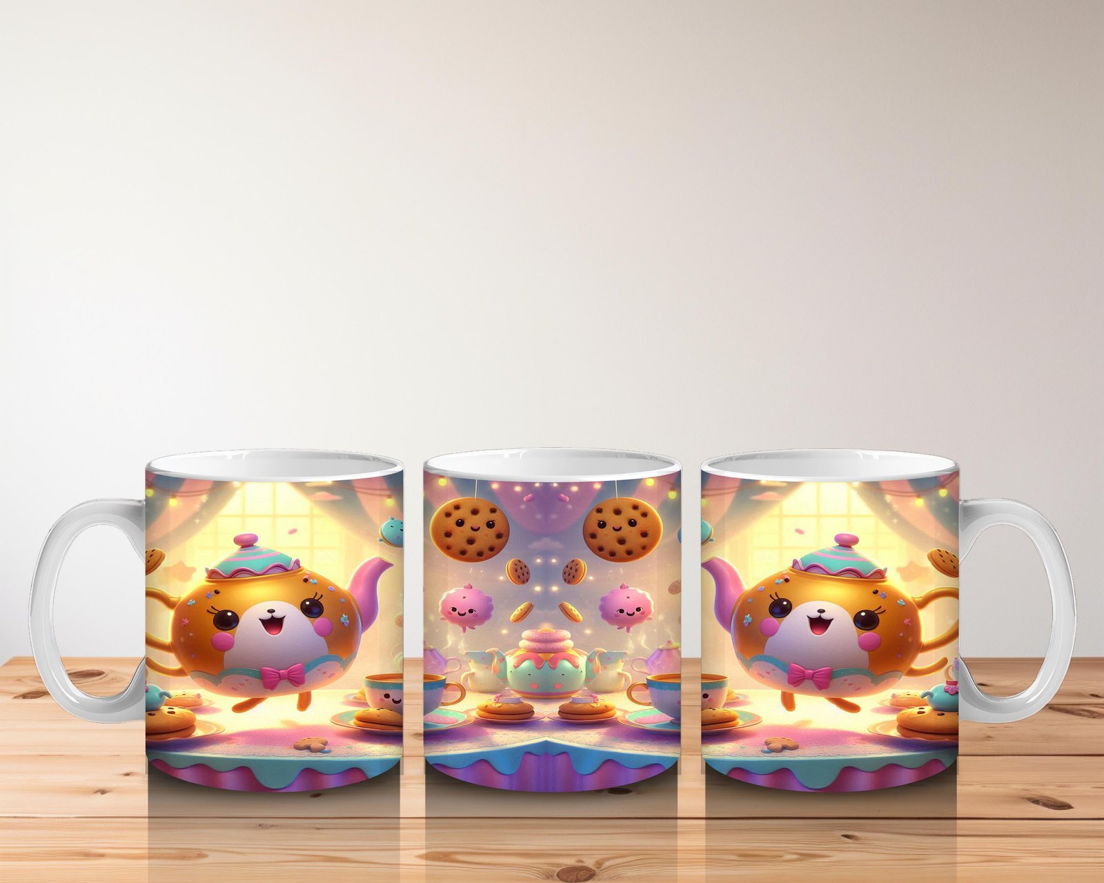 Gülümseyen çay fincanları ve mis gibi kurabiyelerle süslü tatlı bir sofra… Bu eğlenceli kupa, süt molasını miniklere sıcak bir davet gibi sunuyor.