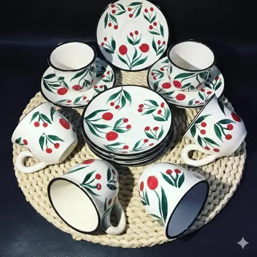 • Set İçeriği: 6 adet el yapımı fincan ve 6 adet tam uyumlu kiraz desenli tabak.