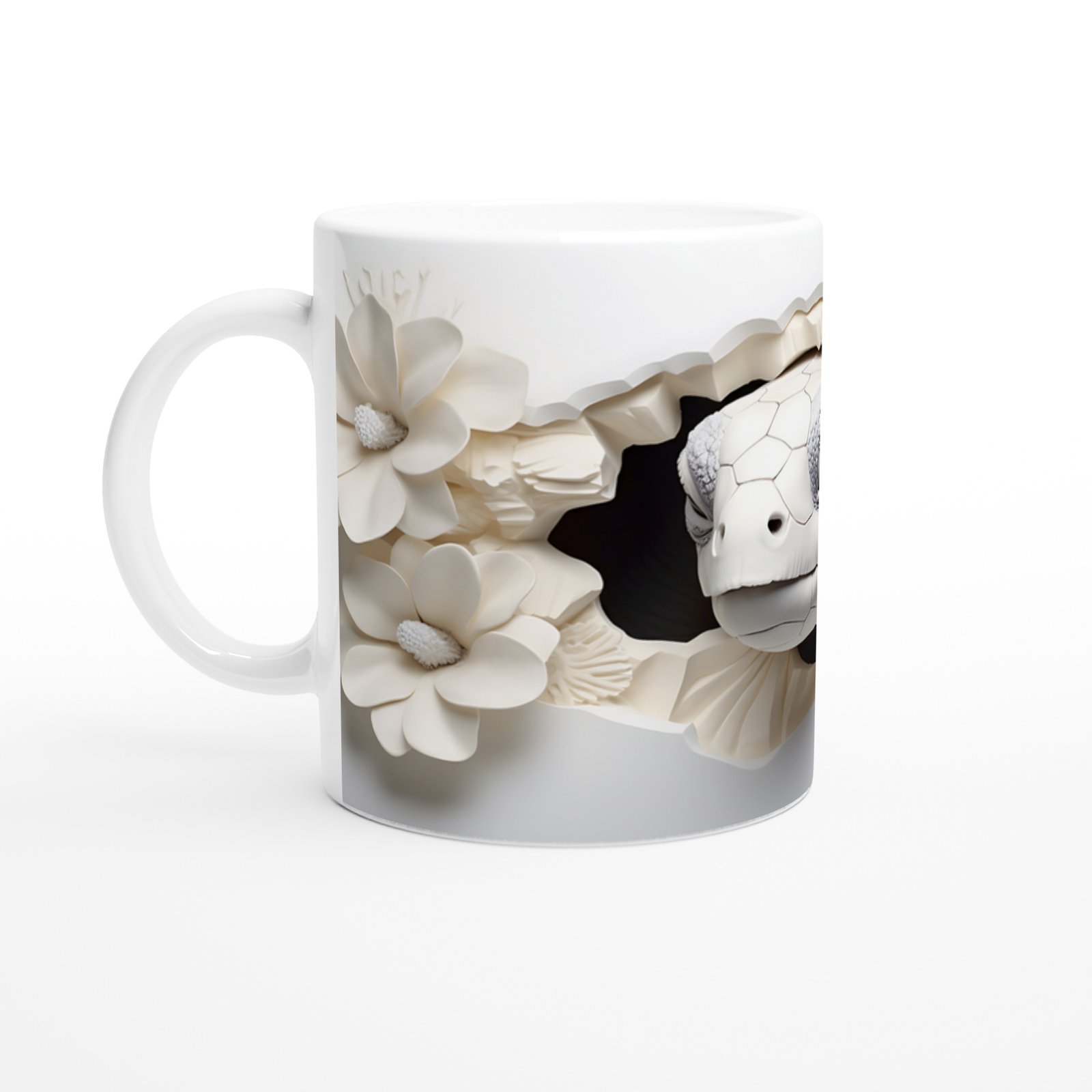Beyaz çiçeklerin arasında nazlı nazlı bakan bir deniz kaplumbağasıyla süslenen bu özel kupa bardak, doğanın huzurunu ve su altının büyüsünü her an yaşatır.