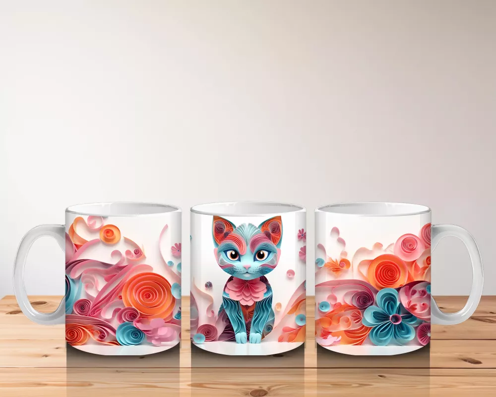 Canlı çiçek desenleri arasında parlayan mavi gözlü kedi, zarif ve etkileyici bir görünüm sunuyor. Renkli ve şık tasarımlardan hoşlananlar için sofistike bir kupa tercihi.