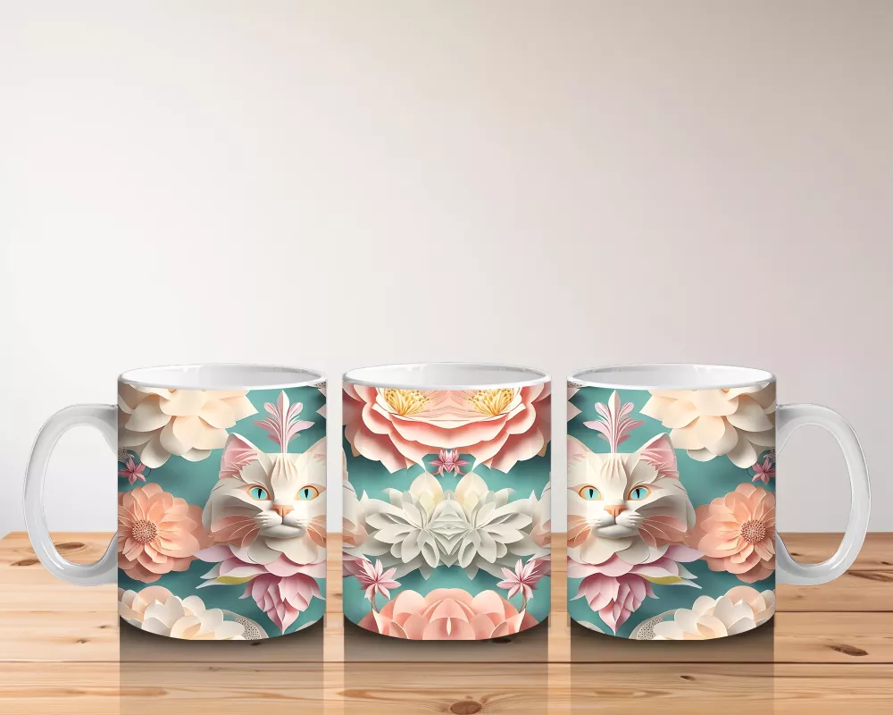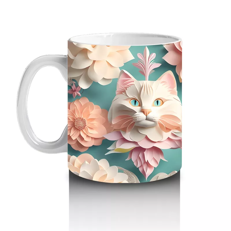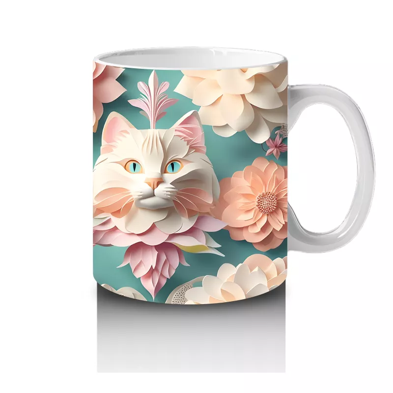 Renkli Çiçekler Arasında İkili Kedi Figürü – Baskılı Kupa
