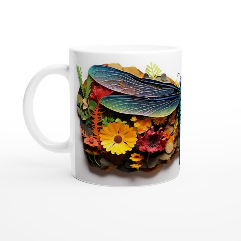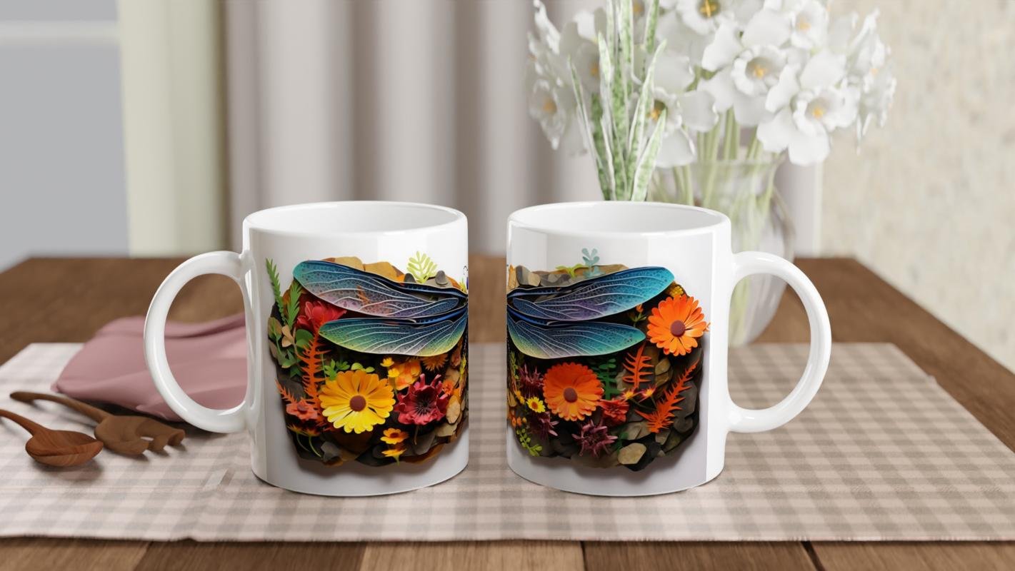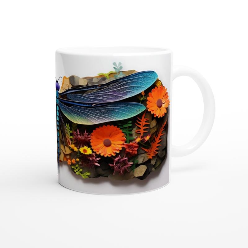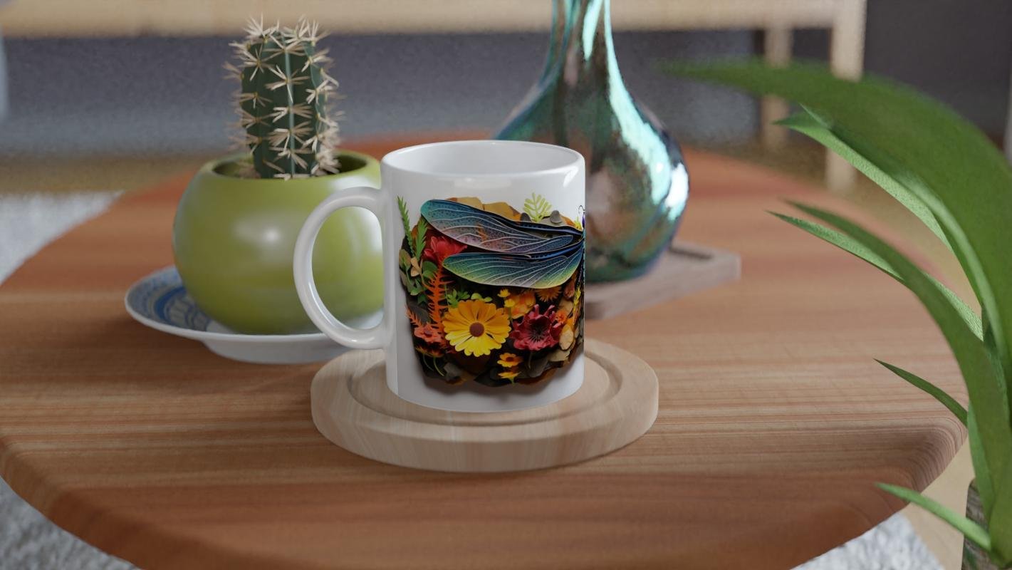 Renkli Çiçekler Arasında Yusufçuk Temalı Baskılı Kupa Bardak, turuncu ve sarı çiçeklerle çevrili mavi-mor tonlardaki yusufçuk tasarımıyla dikkat çeker. Sanatsal doğa illüstrasyonlarını sevenler için ideal bir tercih.