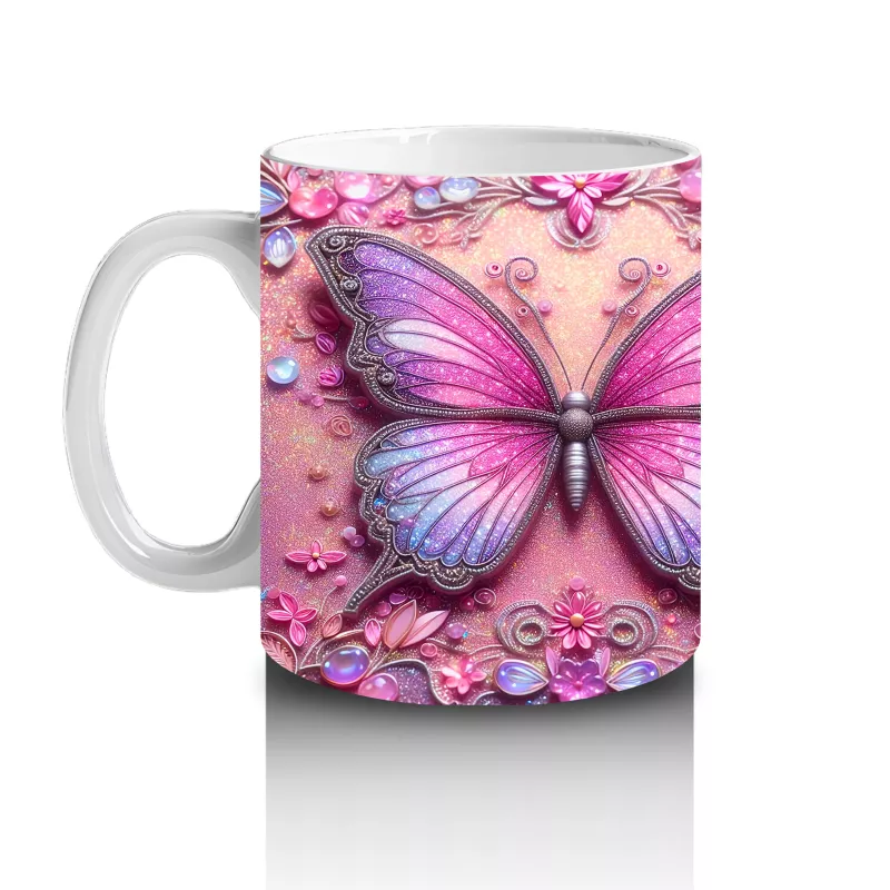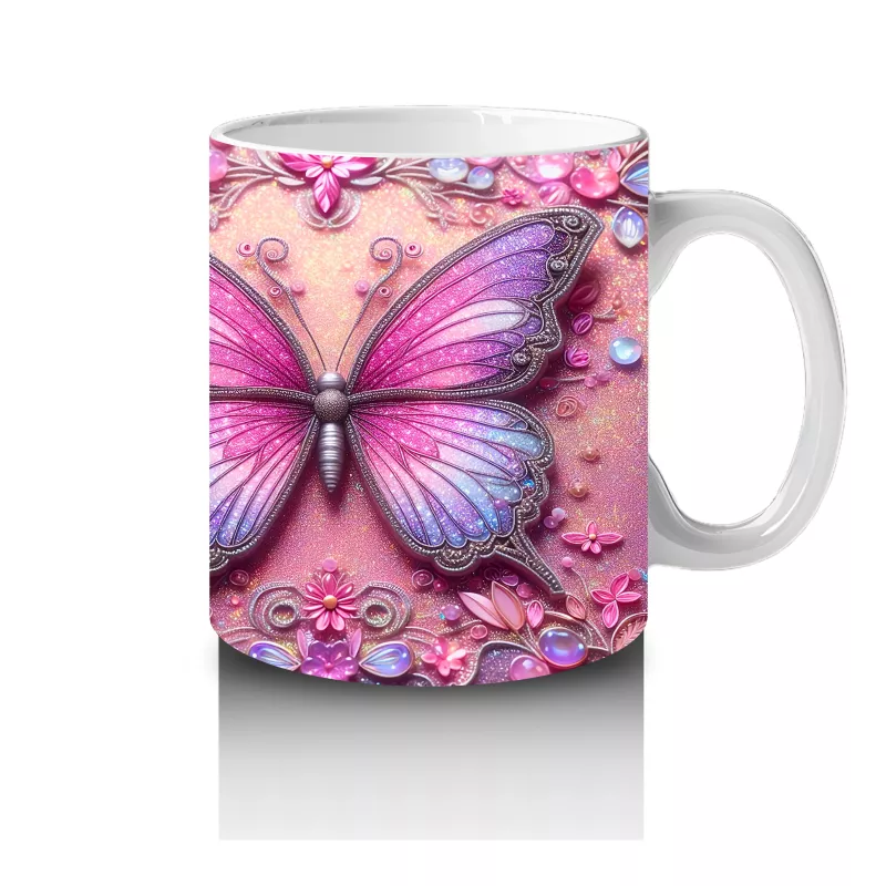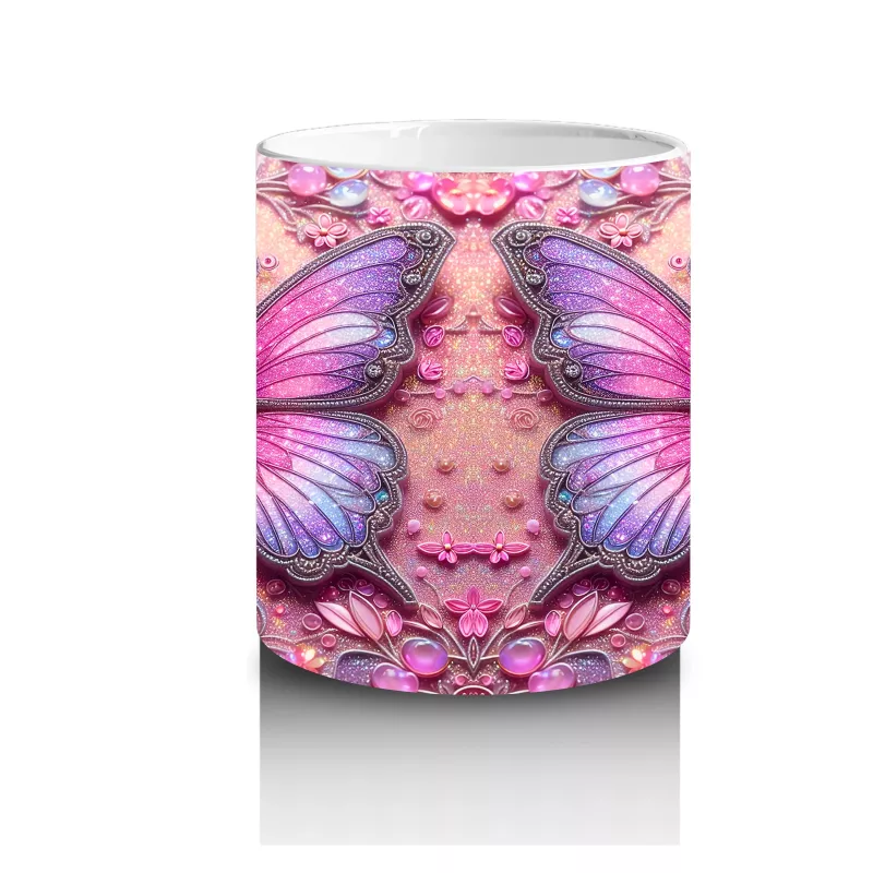 Pembe Arka Planlı Çift Mor Kelebek Deseni – Baskılı Kahve Kupası