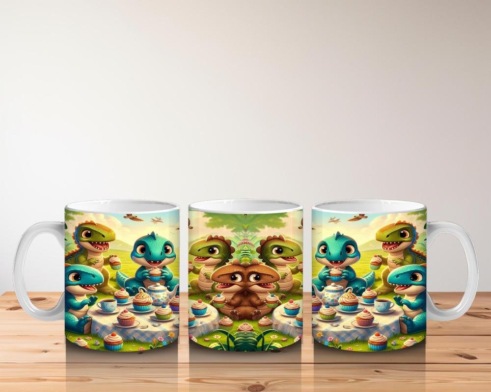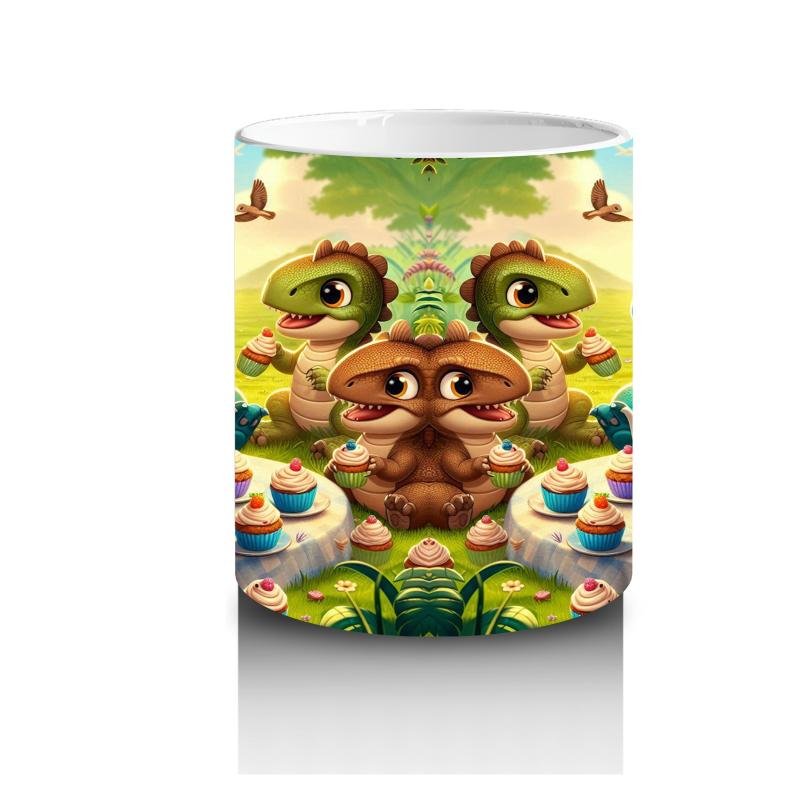 Çocuklara Sütü Sevdiren Cupcake Partisi Yapan Sevimli Dinozorlar Desenli Kupa Bardak
