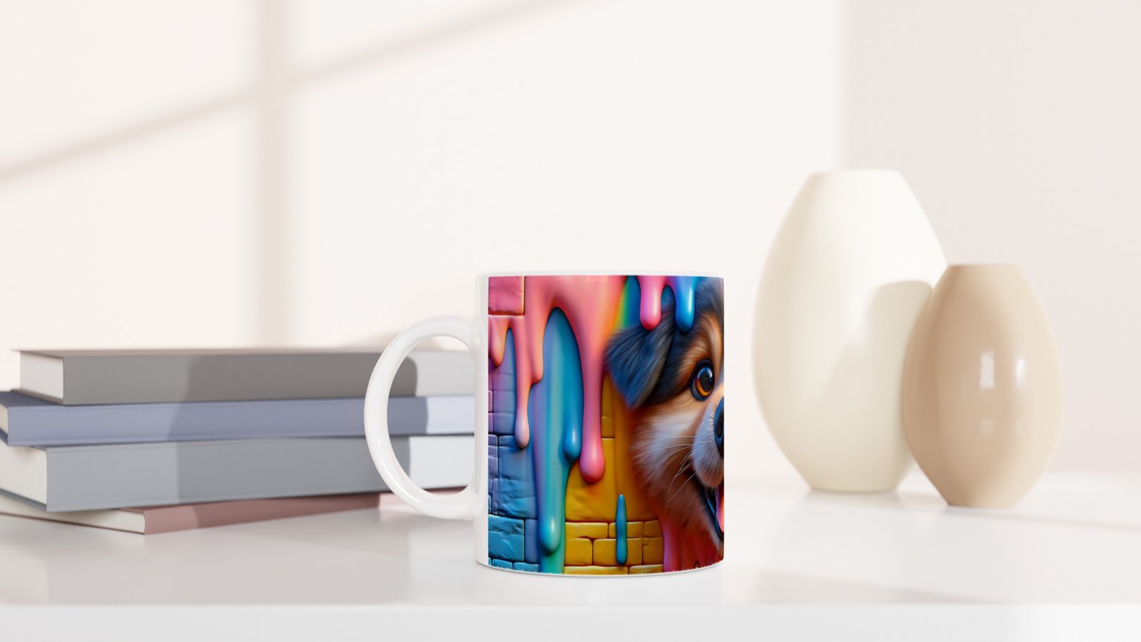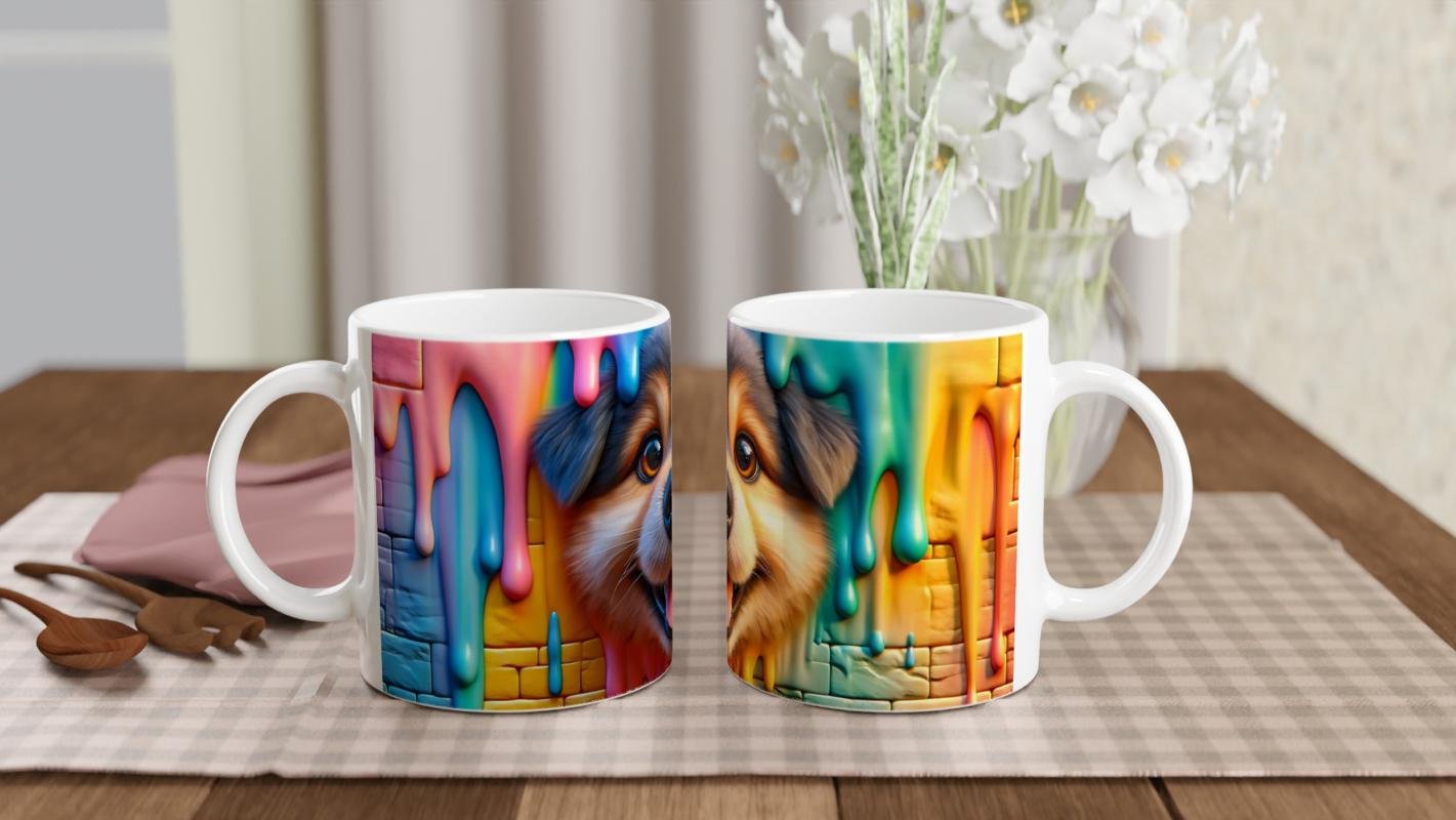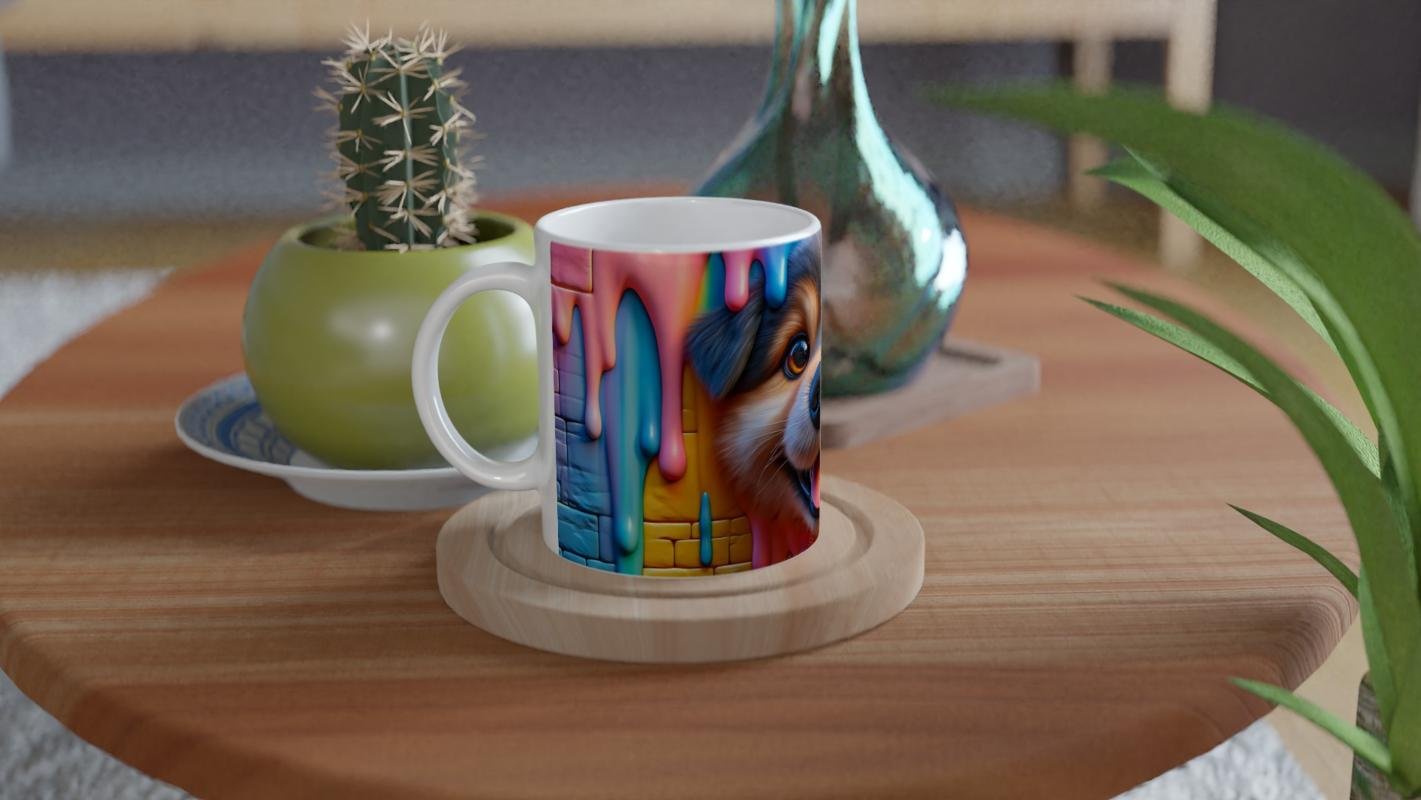 Renkli boya damlalarıyla süslenmiş duvar arkasından gülümseyerek bakan neşeli köpek figürü, her yudumda keyifli bir atmosfer yaratır. Gününüze neşe katacak bu canlı tasarım, köpek severler için hem dekoratif hem de kullanışlı bir hediye seçeneği sunar.