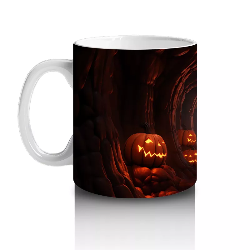 Dolambaçlı bir tünelde sevimli bir şekilde gülümseyen balkabakları, bu Cadılar Bayramı baskılı kupayı eğlenceli kılıyor. Mizahi ve tematik bir hediyelik kahve kupası alternatifidir.