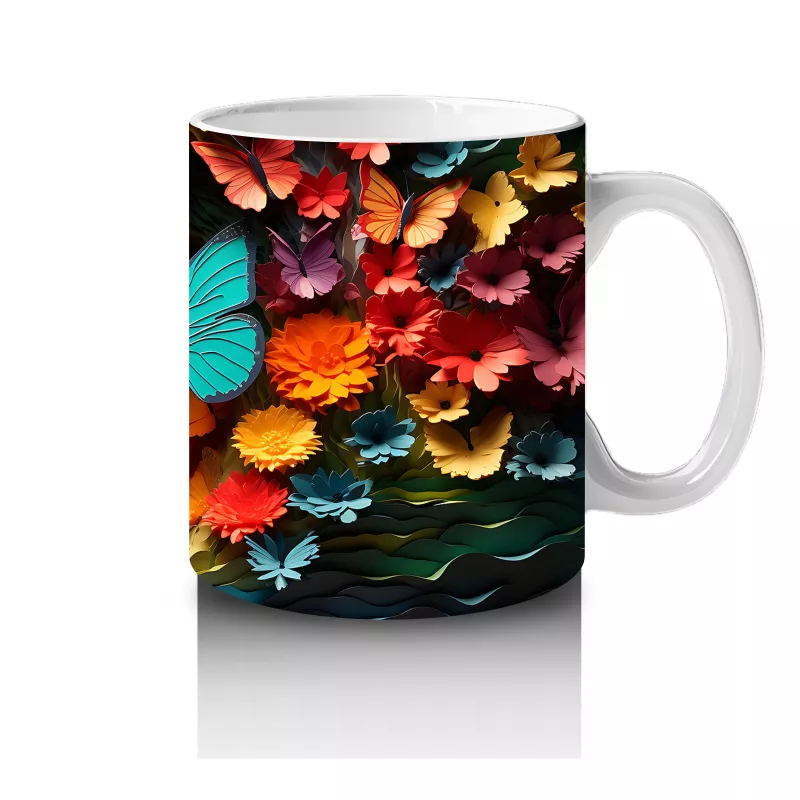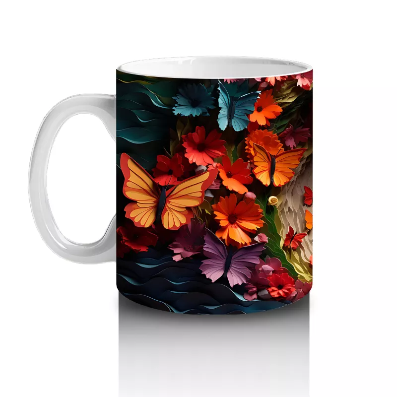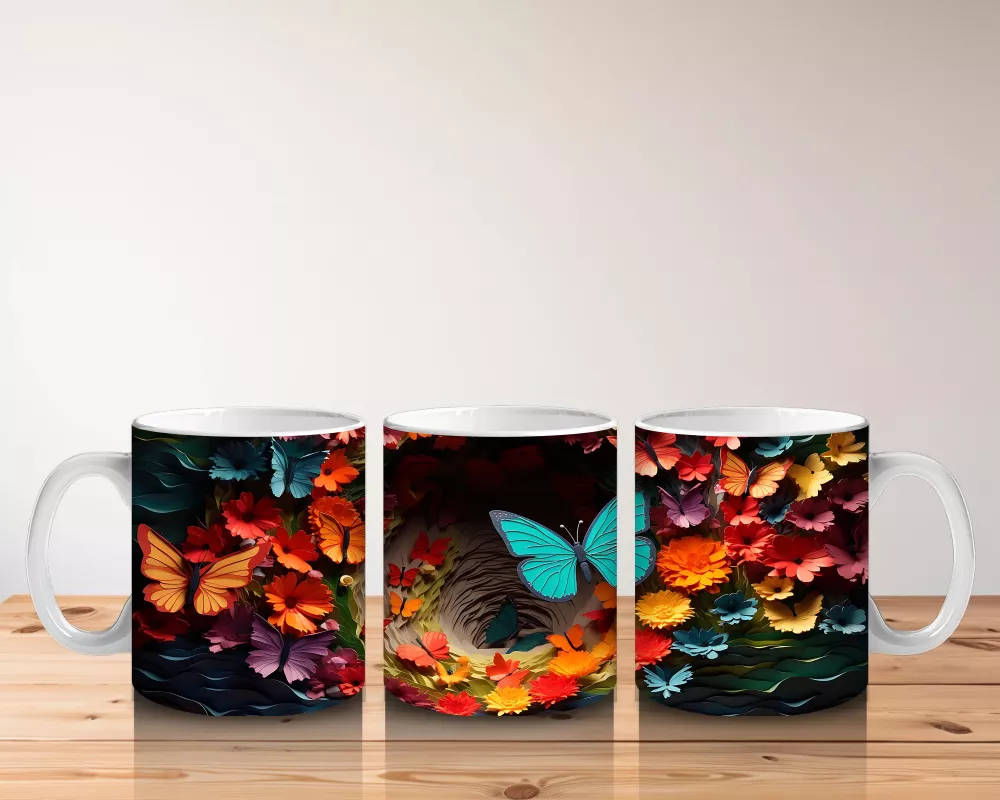 Doğal Çiçekler Arasında Turkuaz Kelebek – Baskılı Kahve Kupası