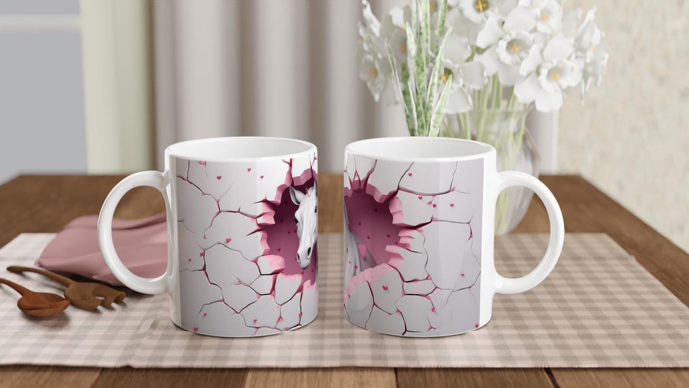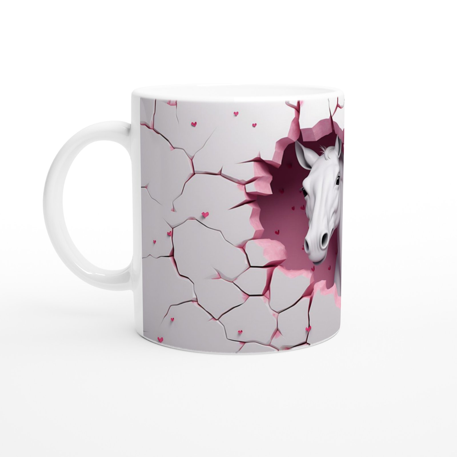 Duvarı kırarak çıkan beyaz at figürü, pembe tonların hâkim olduğu arka planla birleşerek romantik ve güçlü bir atmosfer yaratıyor. Bu özel tasarım, hem hayvanseverlerin hem de at tutkunlarının favorisi olmaya aday.