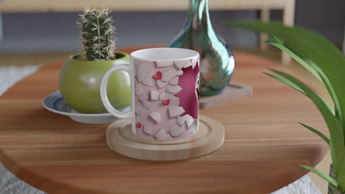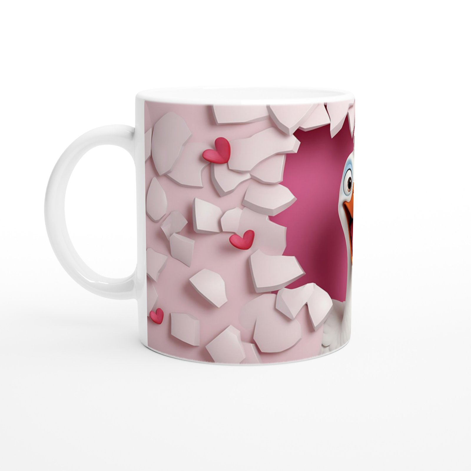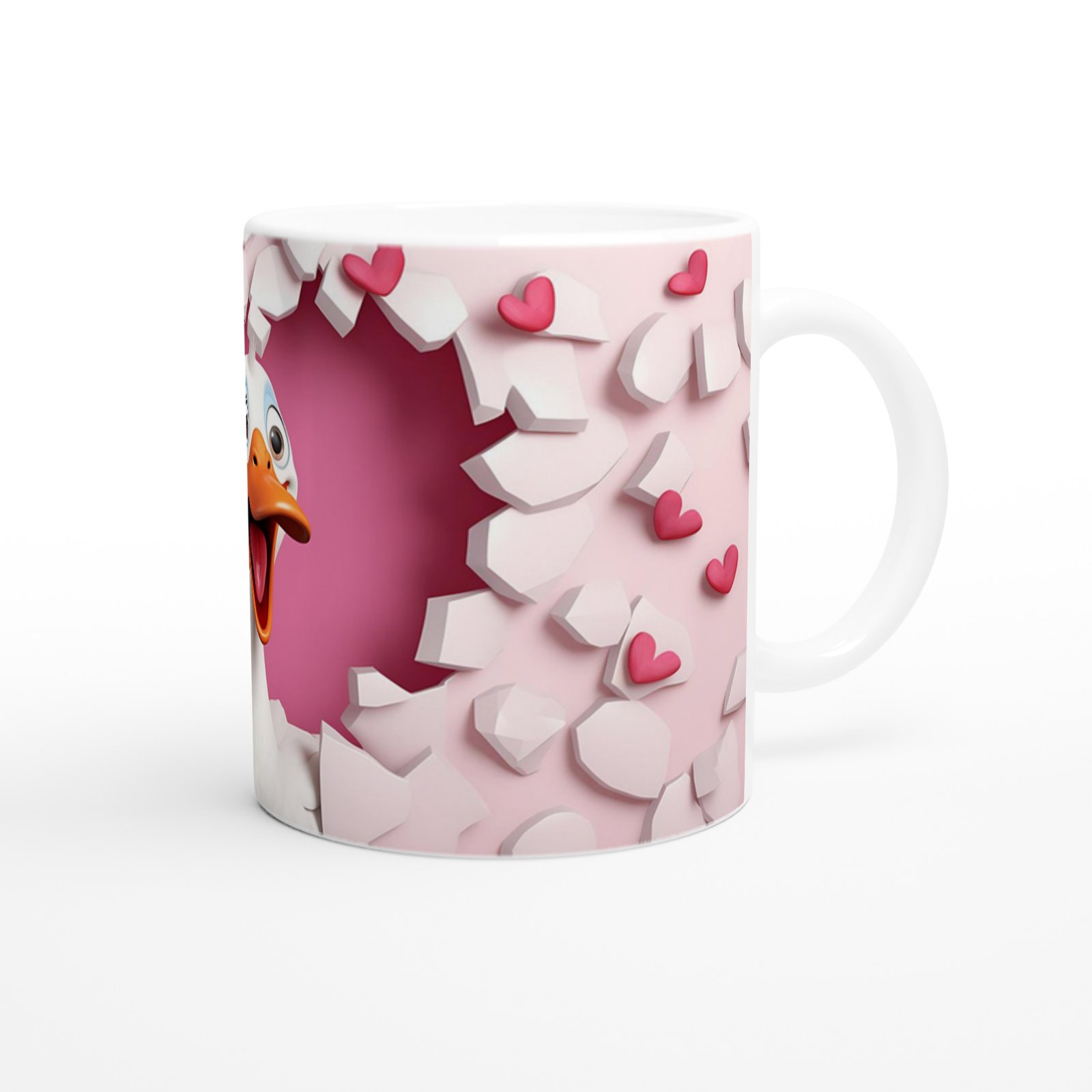 Kalp şeklinde kırılmış pembe duvarın ardından bakan komik kaz figürü, renkli kalp detaylarıyla birleşerek hem çocuklara hem de içindeki çocuğu yaşatanlara hitap ediyor.