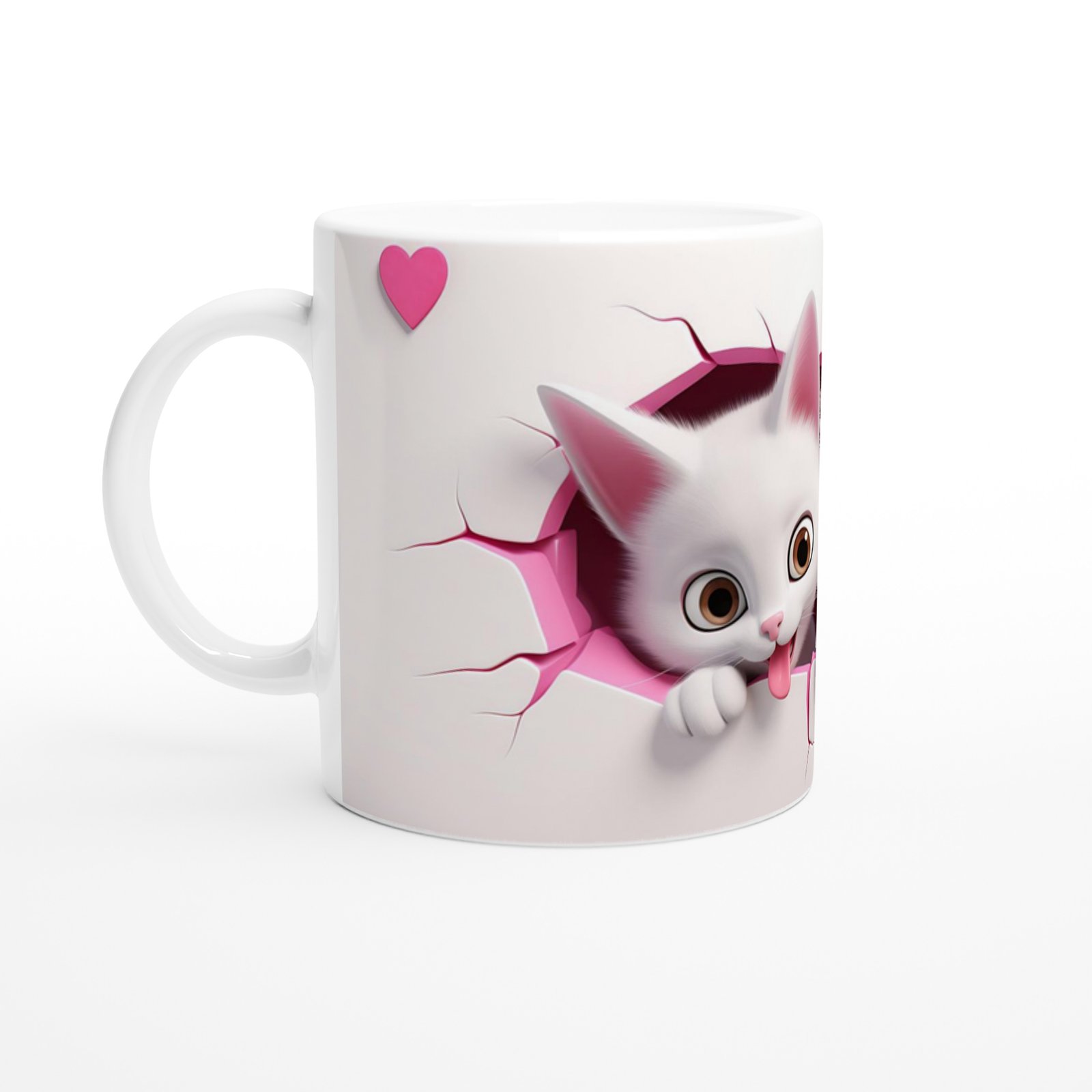 Pembemsi çatlak efektli duvarın içinden çıkan bembeyaz iki minik kedi, meraklı bakışları ve dışarı sarkan patileriyle bu kupayı eğlenceli bir hale getiriyor. Sevimlilik dolu bu tasarım, kedi tutkunları için sıcak içecek molalarını keyifli bir deneyime dönüştürüyor.
