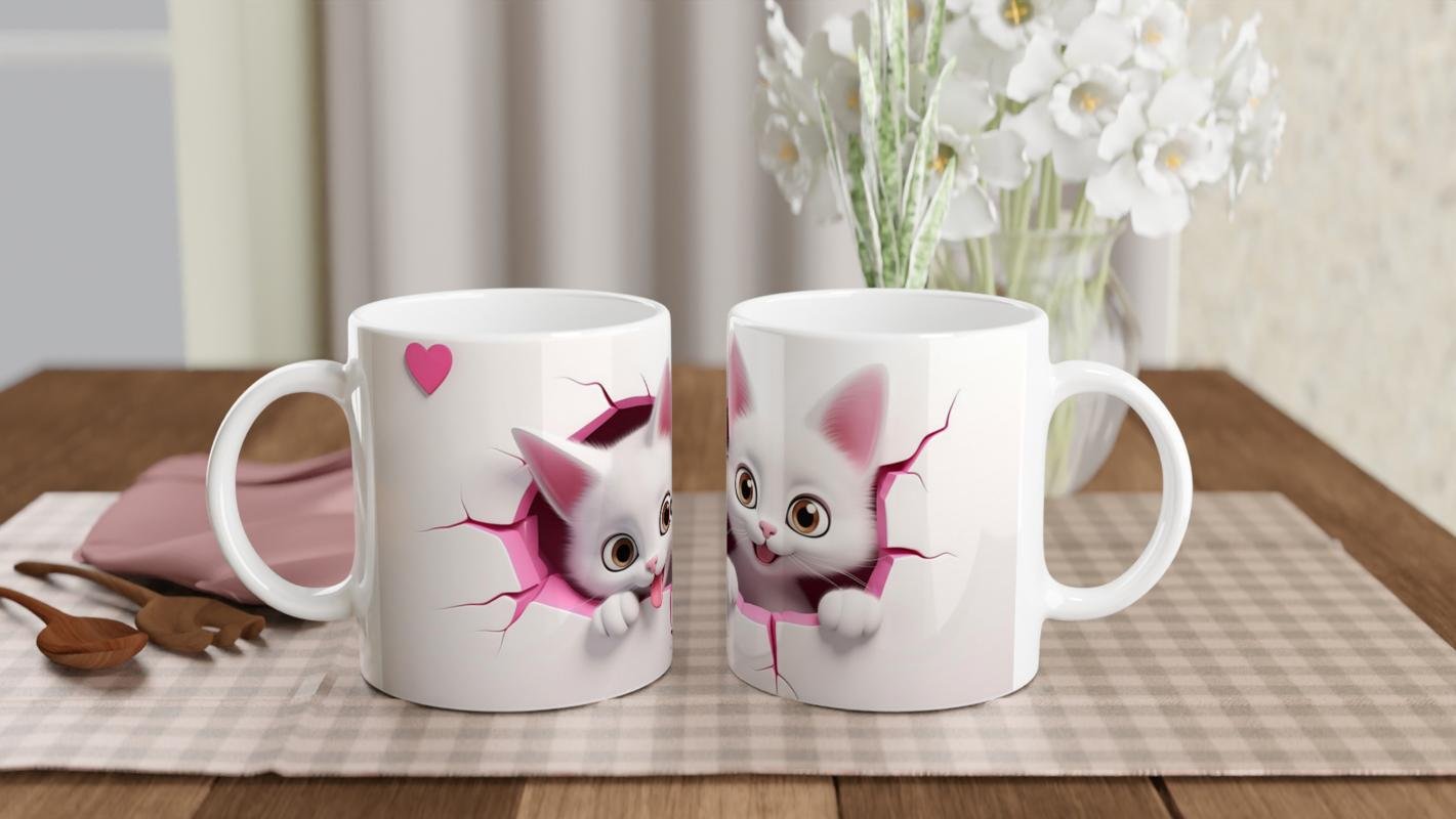 Kedi baskılı kupa, duvarın arkasından çıkan iki tatlı yavrunun neşeli halleriyle gününüze pozitif enerji katıyor.