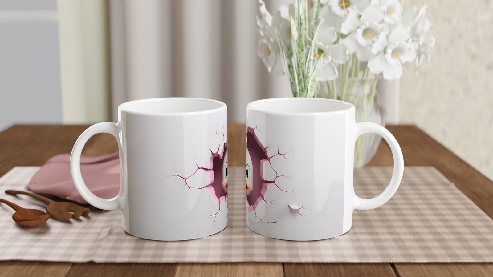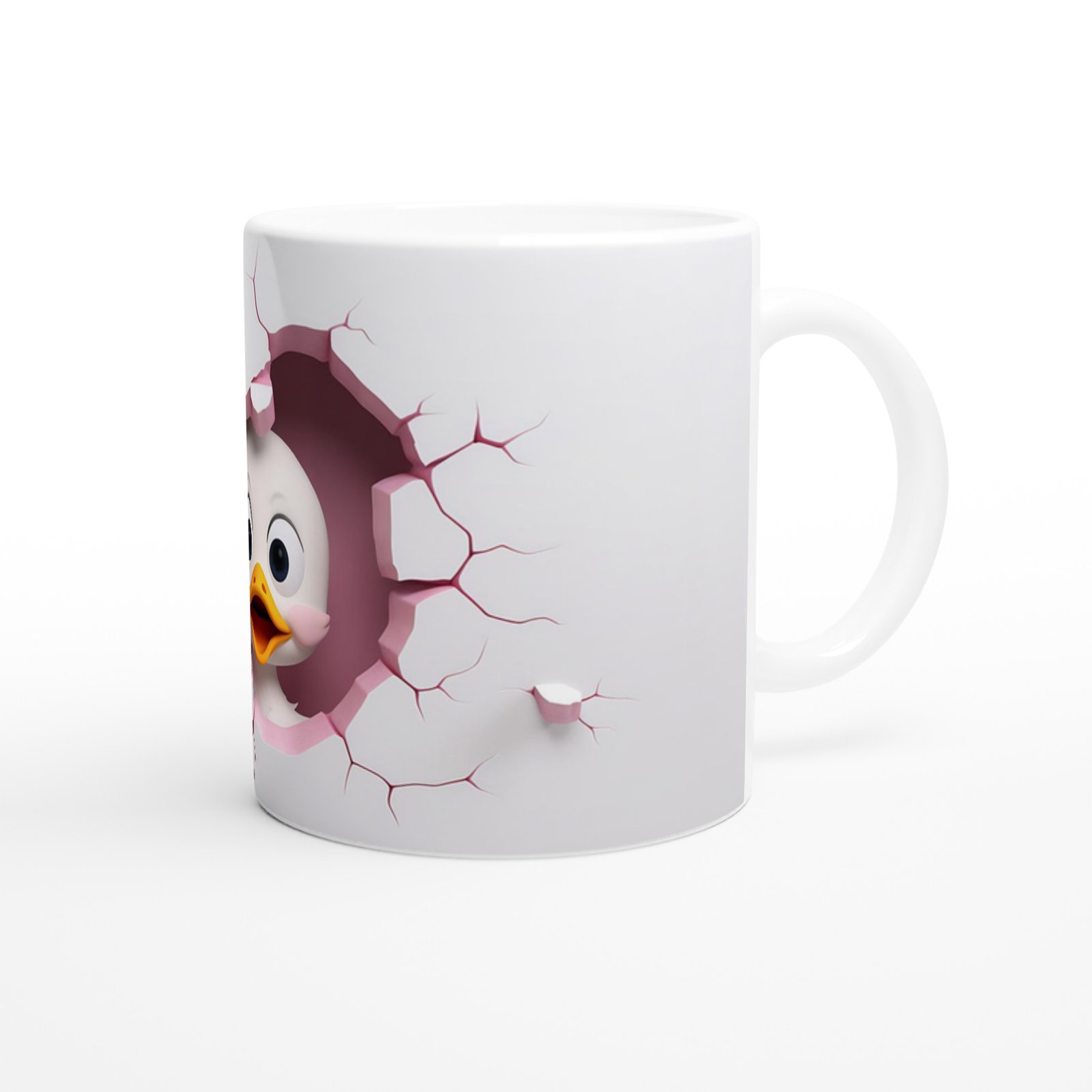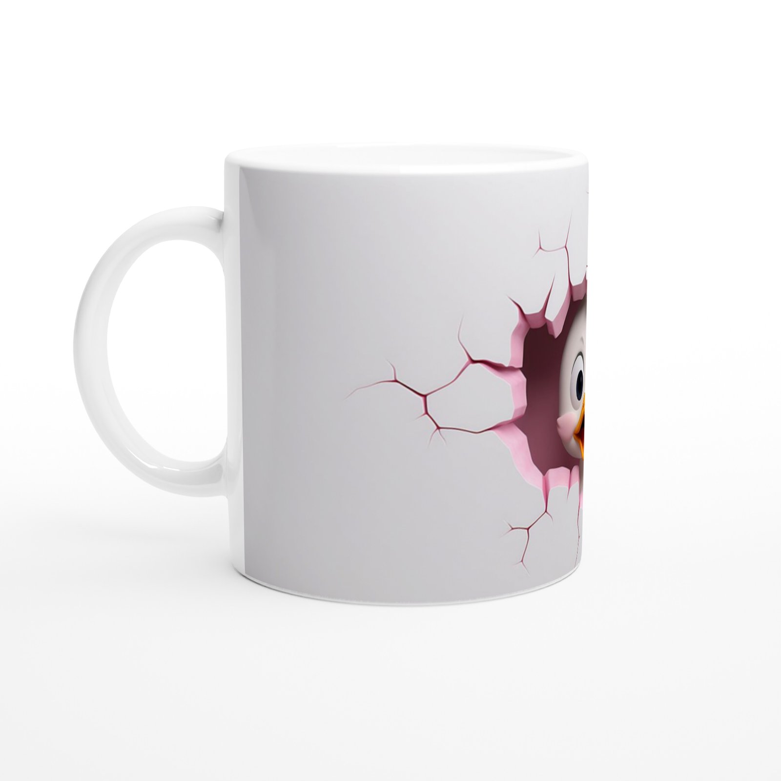 Duvarı Delen Sevimli Ördek Temalı Baskılı Kupa Bardak, çatlamış beyaz arka planın ortasından çıkan sevimli sarı gagalı ördeğiyle dikkat çekiyor. Neşeli tasarımıyla çocuklar ve içindeki çocuğu yaşatanlar için mükemmel bir seçim.