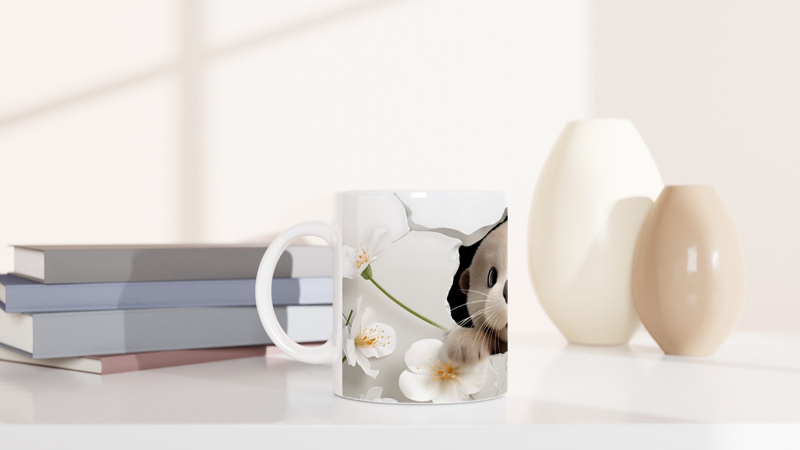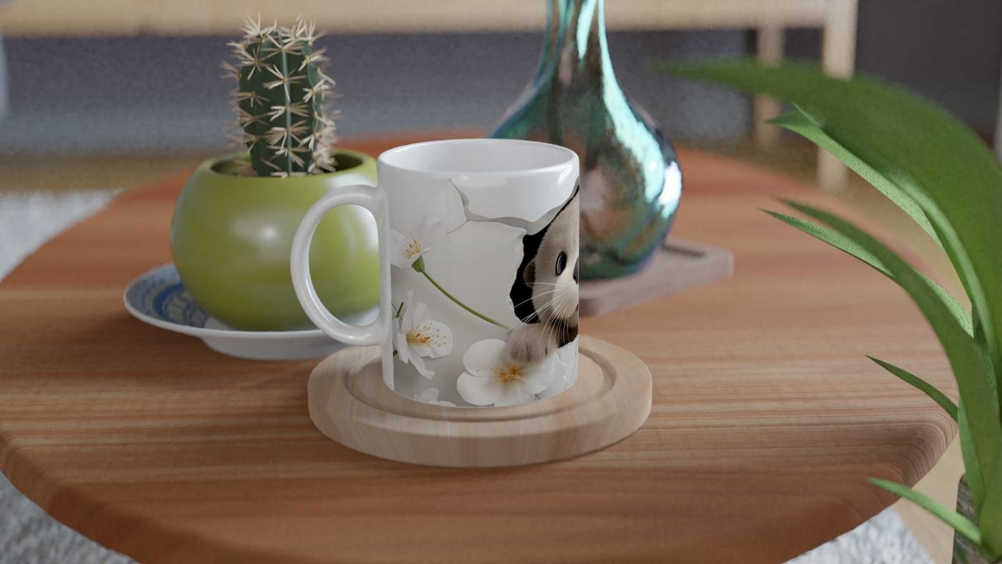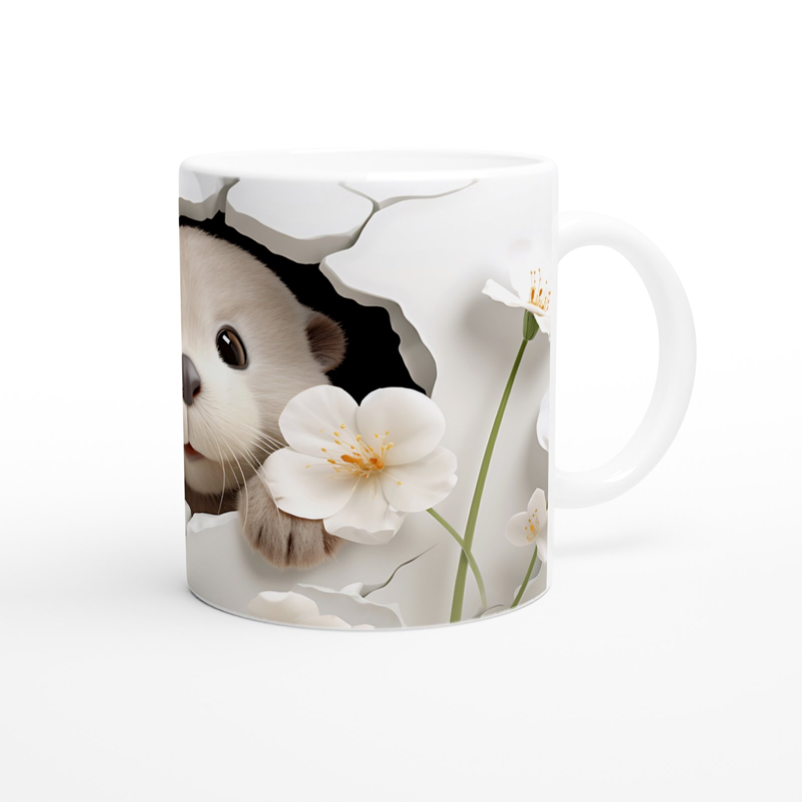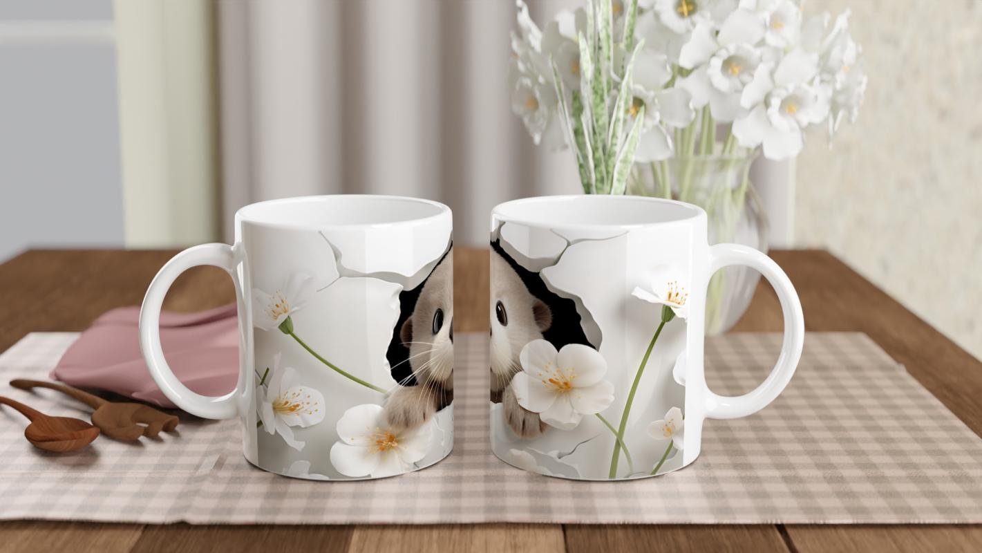 Su samuru baskılı kupa, bembeyaz çiçekler ve yumuşak tonlarla harmanlanmış sevimli bir tasarım sunuyor.