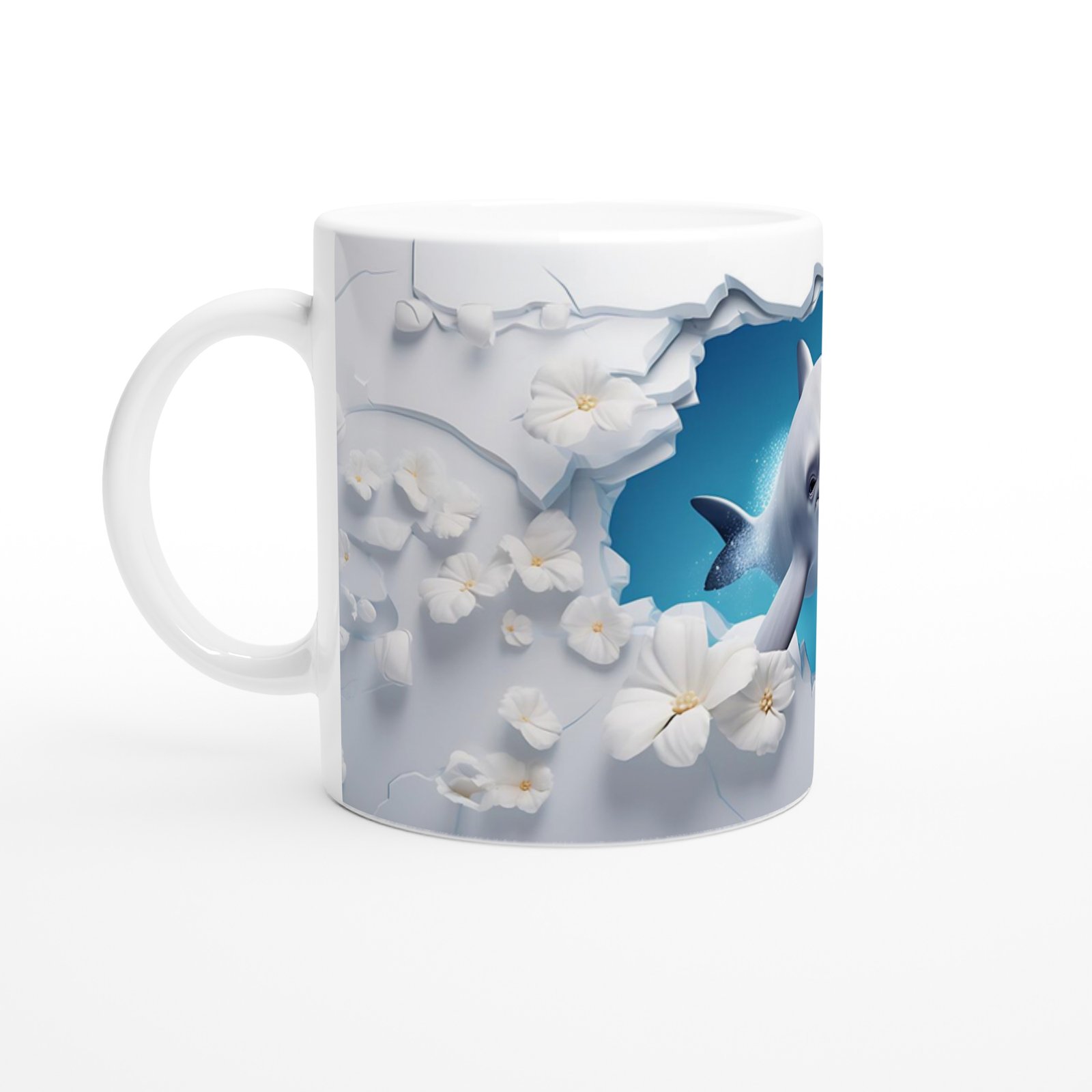 Çatlak Duvardan Bakan Sevimli Yunus Temalı Baskılı Kupa Bardak, beyaz çiçeklerle süslenmiş çatlak duvar efekti ve canlı mavi tonlarıyla pozitif bir atmosfer sunar. Her yudumda deniz esintisini hissettiren, enerji dolu bir tasarım.
