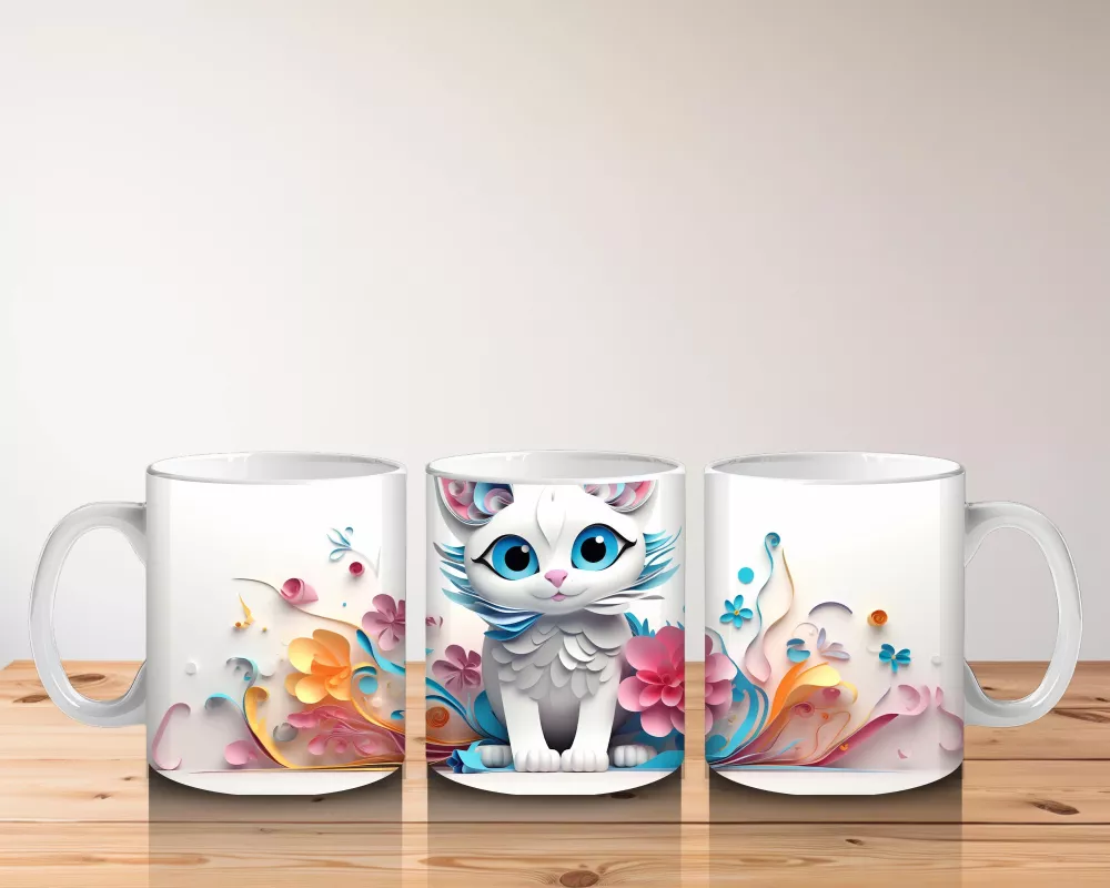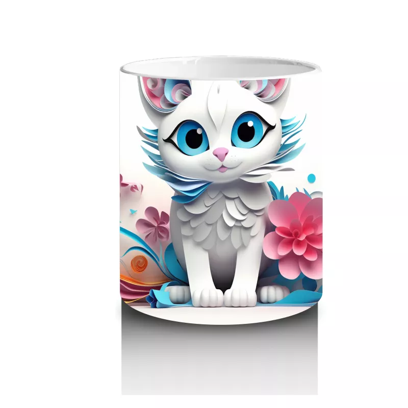 Canlı çiçeklerle çevrili, mavi gözleriyle büyüleyen bu fantastik kedi tasarımı, gerçeküstü bir atmosfer yaratıyor. Sanatsal ve etkileyici bir kupa modeli arayanlara özel.