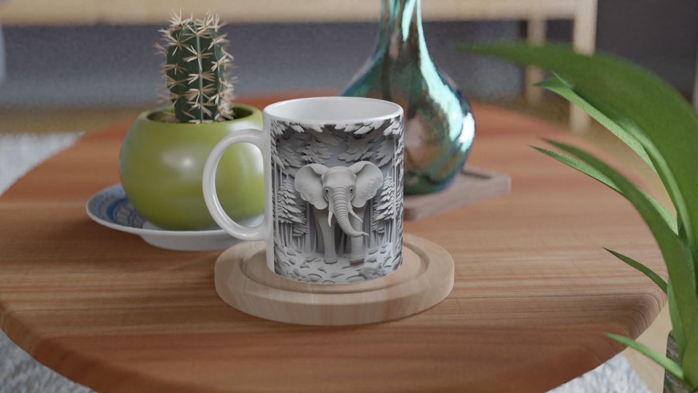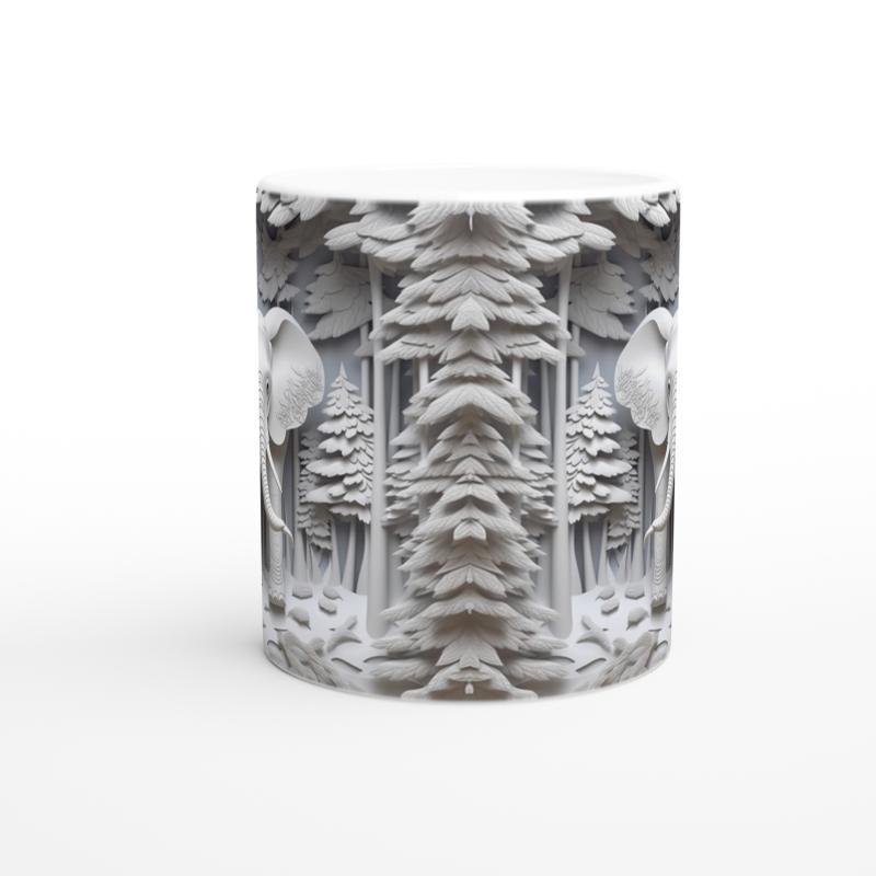 Ormanda Beliren Fil Silueti Temalı Baskılı Kupa Bardak, beyaz tonlarda hazırlanmış orman fonu ve göz alıcı fil figürüyle minimalist estetiği ve vahşi doğanın gücünü bir araya getiriyor.