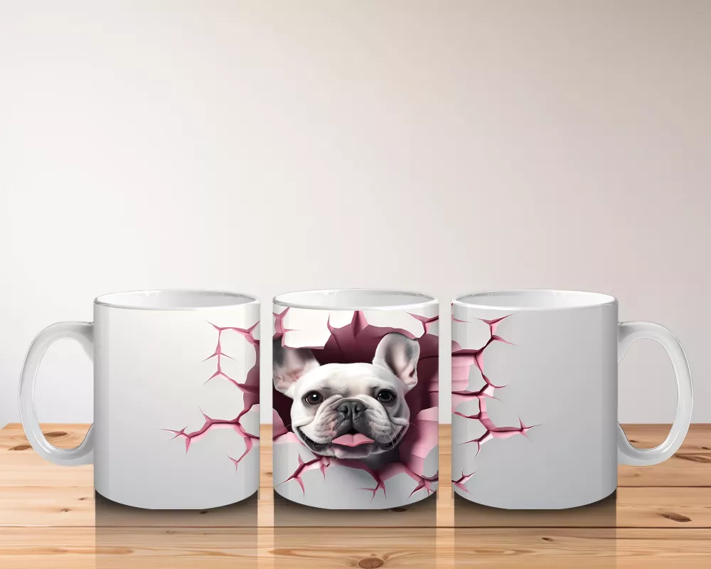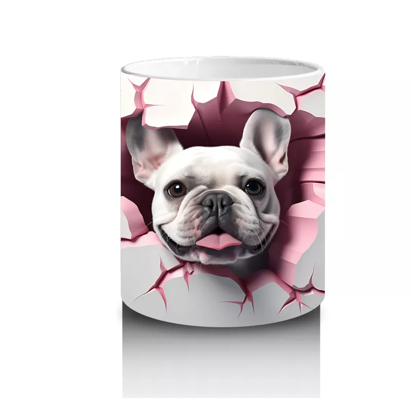Çatlak duvarın arasından çıkan bu Fransız Bulldog, meraklı bakışları ve sempatik duruşuyla dikkat çekiyor. Hem sevimli hem karakter sahibi bir tasarım arayanlar için keyifli bir kupa.