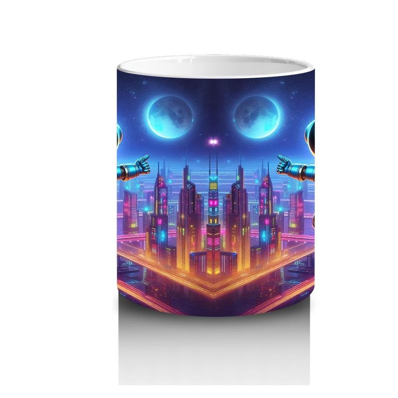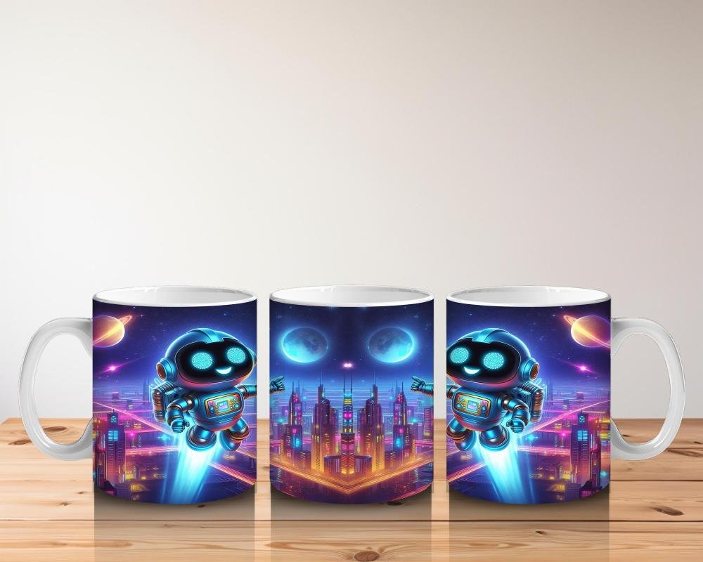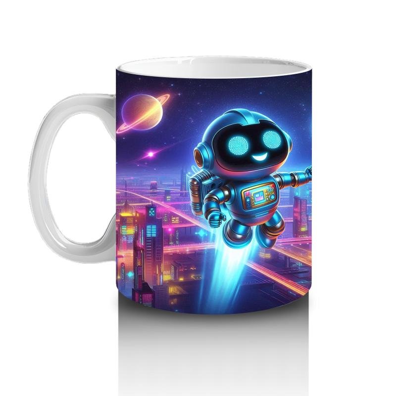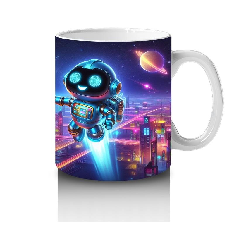 Çocuklara Sütü Sevdiren Gece Şehrinde Uçan Neşeli Robot Desenli Kupa Bardak