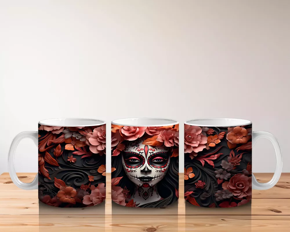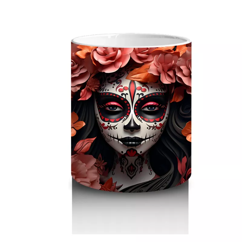 Siyah arka planla birleşen gül tacı detayları, bu Cadılar Bayramı baskılı kupaya gotik bir zarafet katıyor. Karanlık estetiği sevenler için şık bir hediyelik kahve kupası alternatifi.
