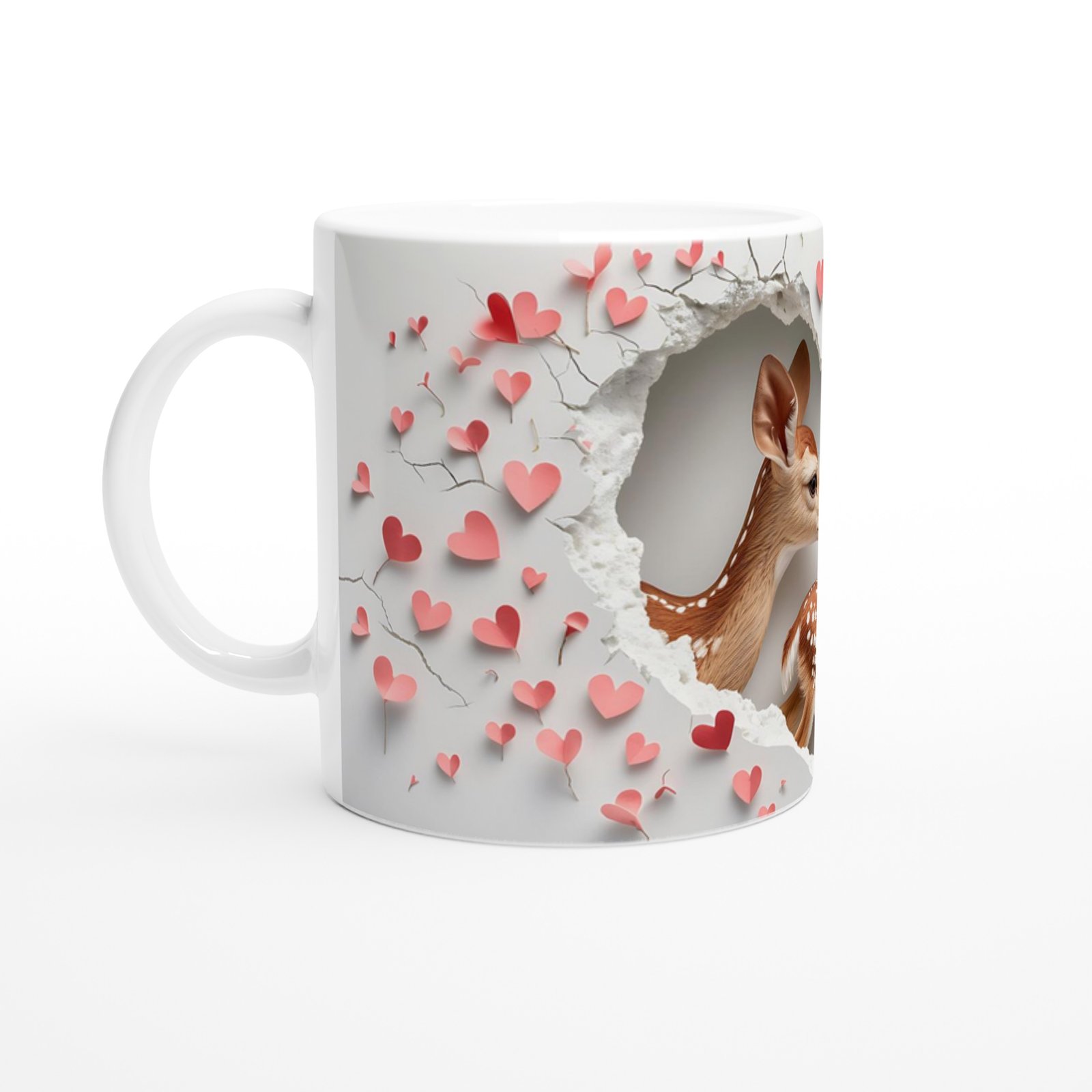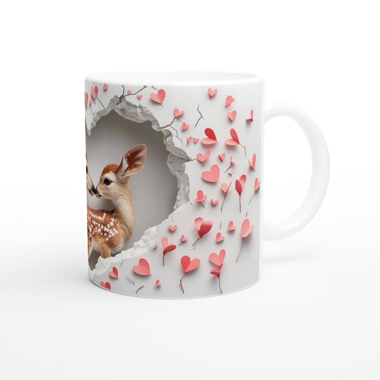 Kalp şeklinde çatlamış duvardan birbirine sevgiyle yaklaşan iki sevimli geyik figürüyle tasarlanmış bu kupa bardak, özellikle çiftler için anlamlı bir hediye alternatifi sunuyor. Doğanın içtenliğiyle aşkın naifliğini bir arada taşıyor.
