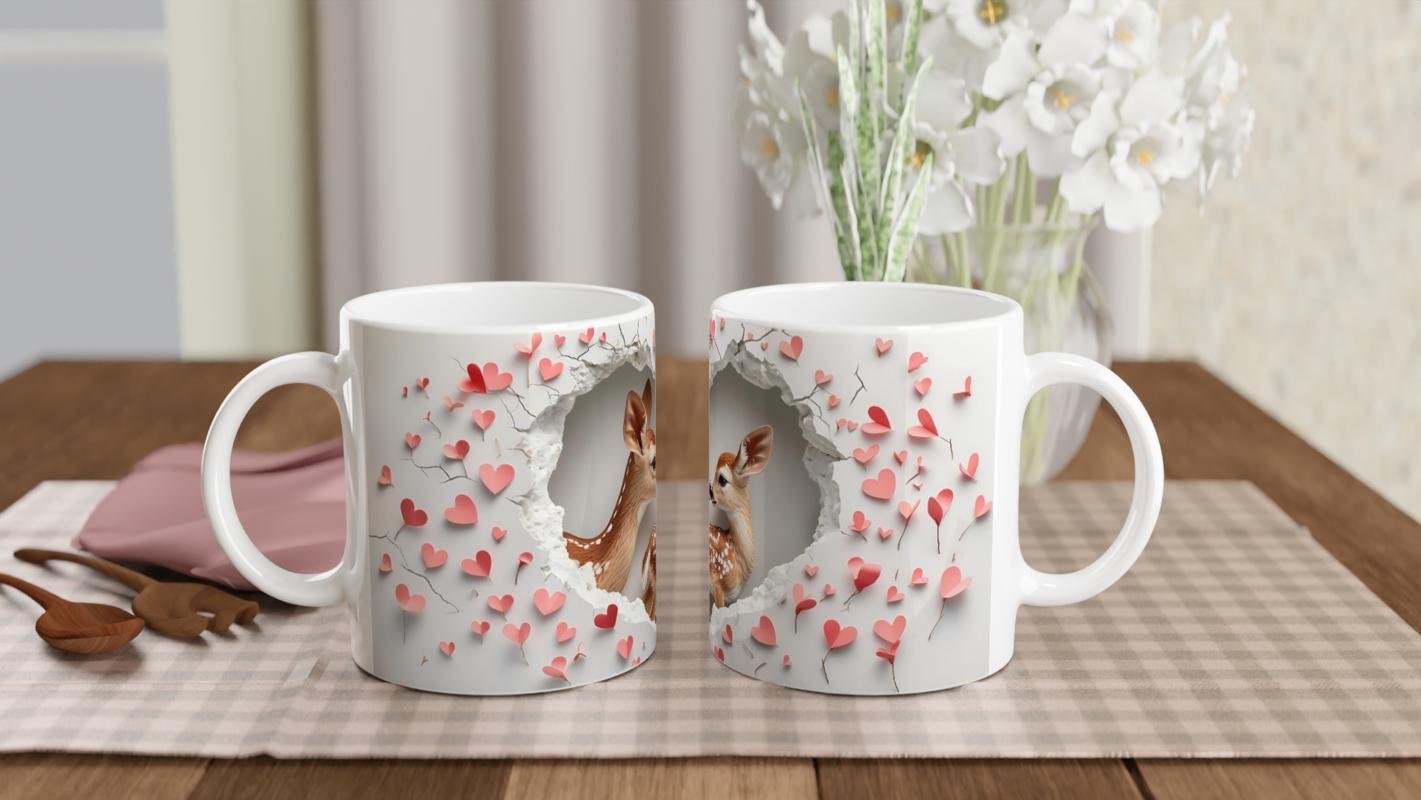 Geyik temalı aşk kupası, zarif duruşlu iki minik geyiğin sevecen bakışlarıyla romantizmi yansıtıyor.