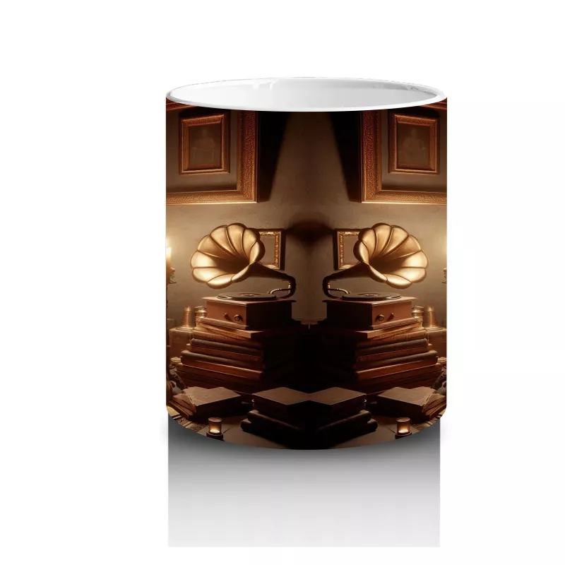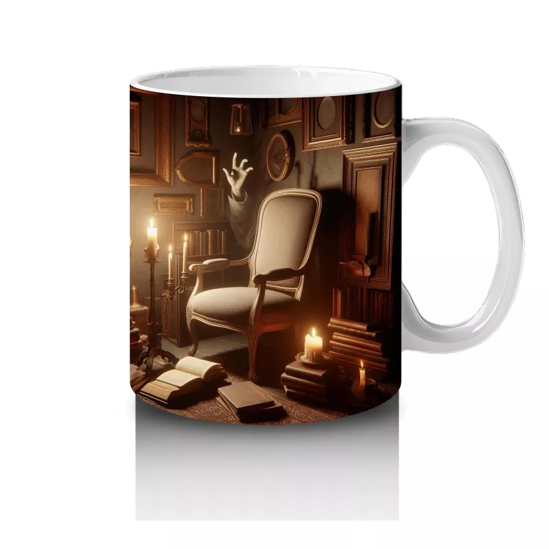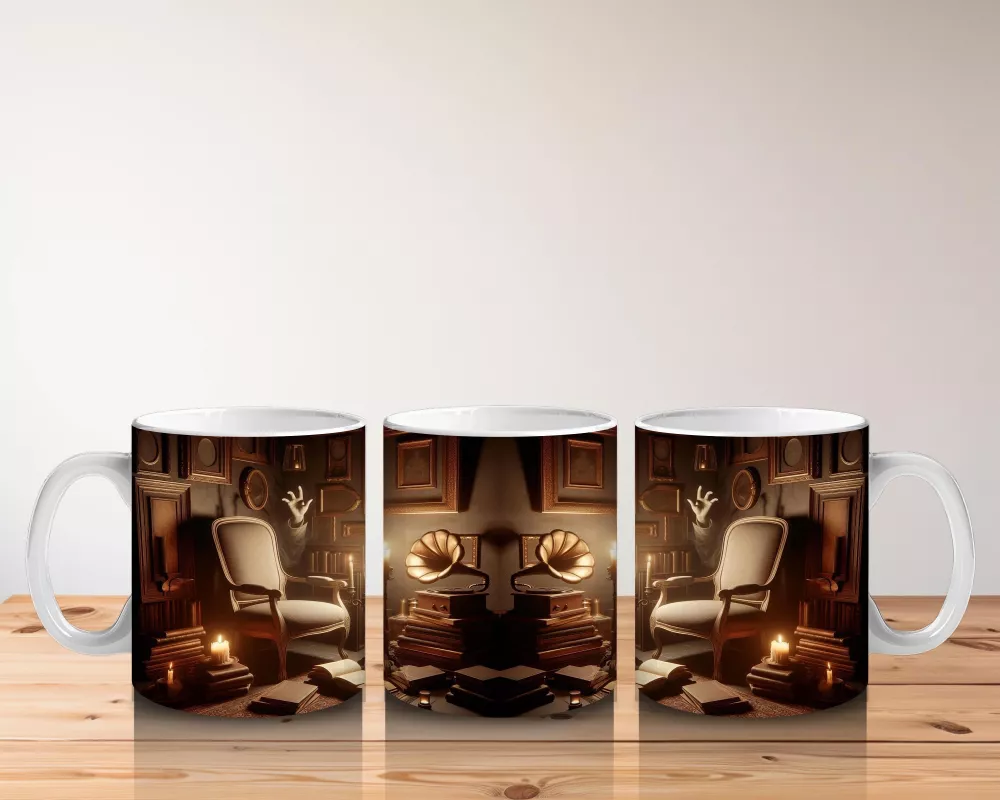 Mum ışığı ve kitaplarla süslenmiş gotik cadı masası temalı bu kupa bardak, Cadılar Bayramı’na mistik ve etkileyici bir hava katar.