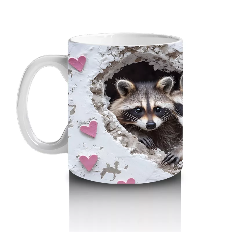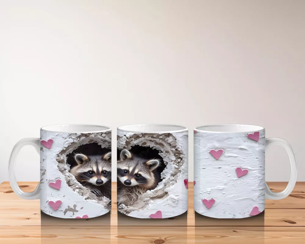 Gri Kürklü Rakun ve Kalpler – Baskılı Kahve Kupası