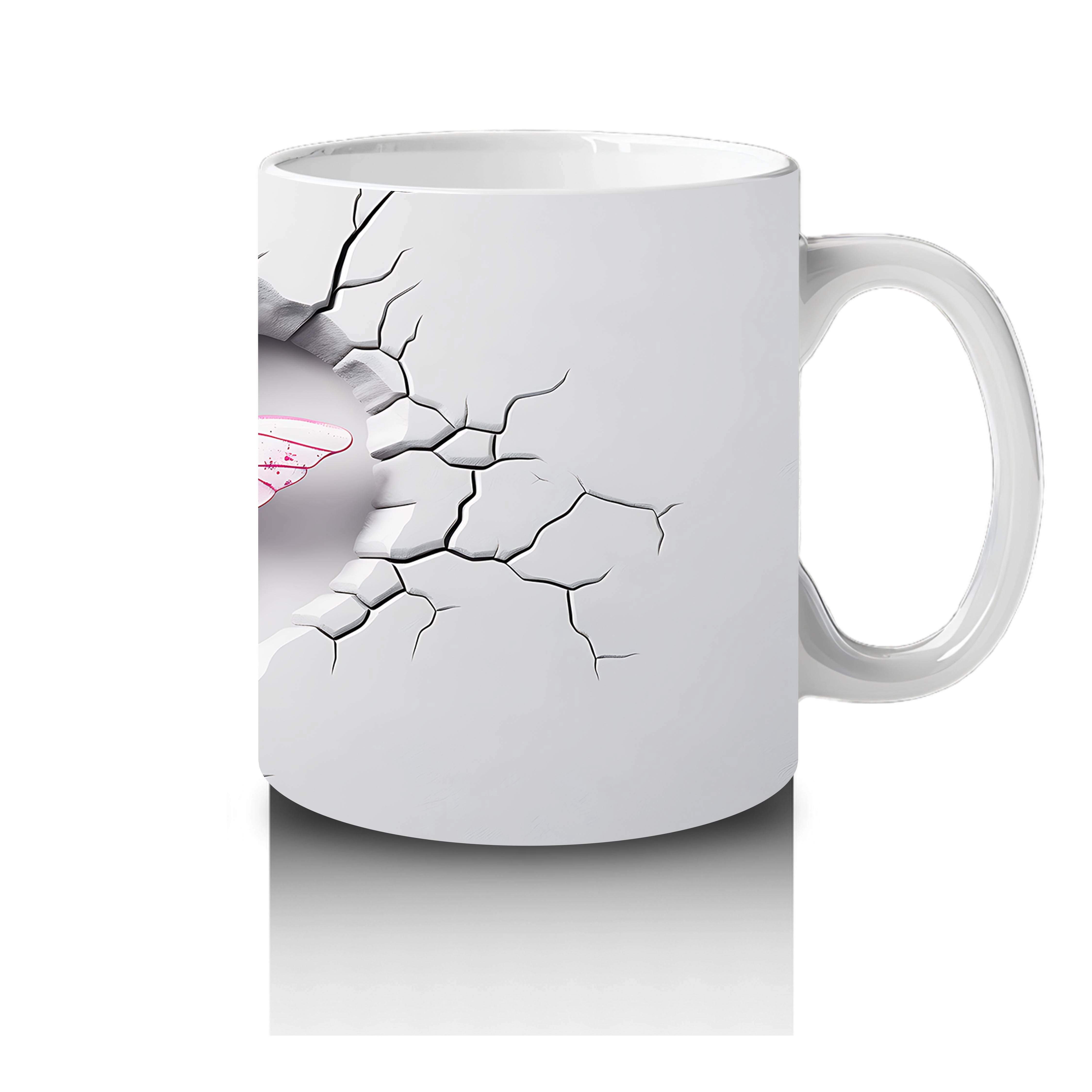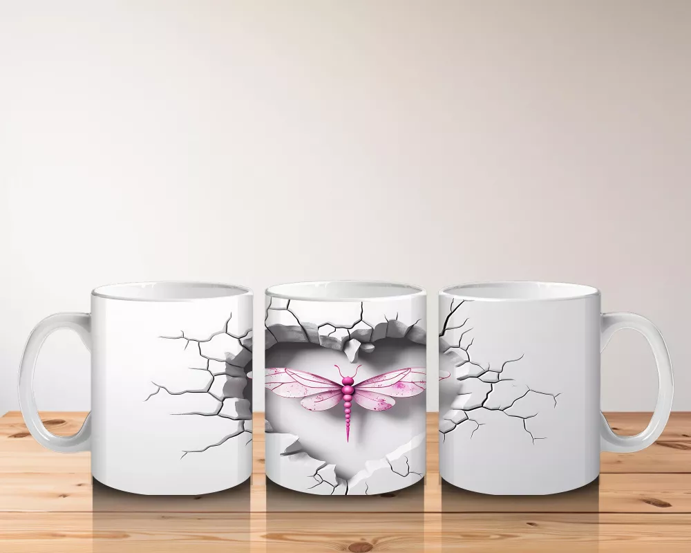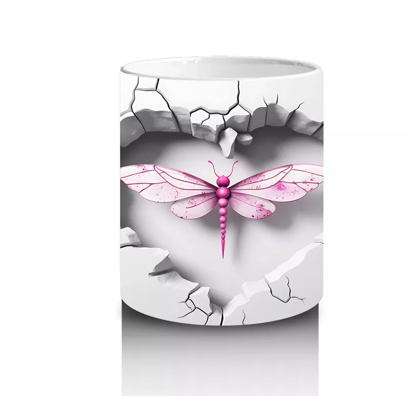 Gri çatlak zemin üzerine yerleşmiş kalp formundaki pembe yusufçuk, sade ama etkileyici bir tasarım sunuyor. Minimalist detayları sevenler için romantik ve zarif bir kupa seçeneği.