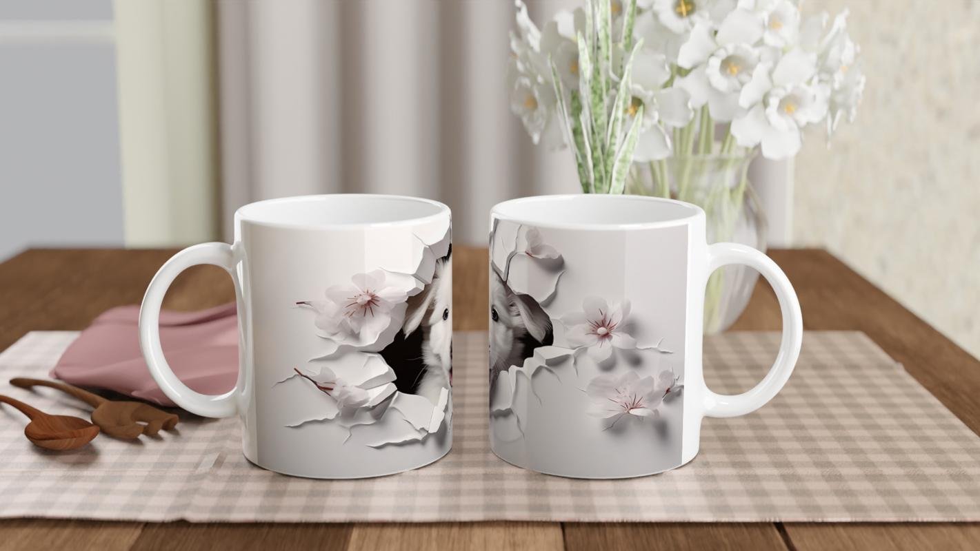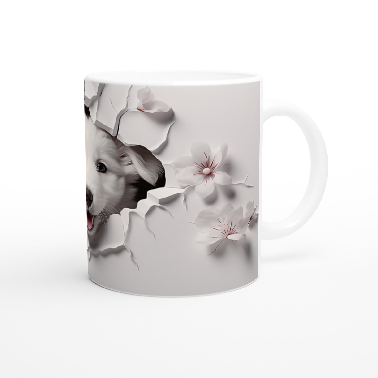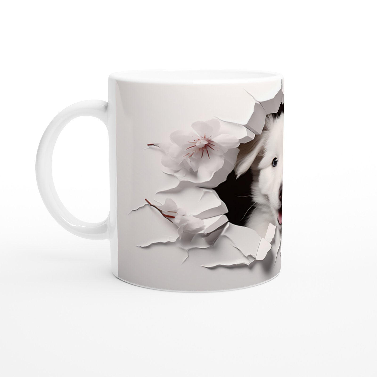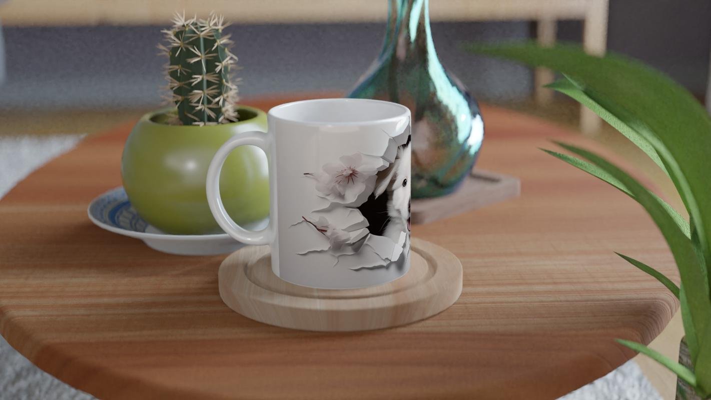 Gülümseyen Beyaz Yavru Köpek ve Kiraz Çiçekleri Baskılı Kupa Bardak, hem sevimliliğiyle gülümsetiyor hem de zarif detaylarıyla her ortama uyum sağlıyor.