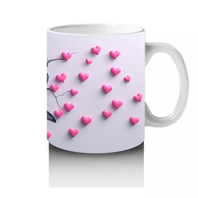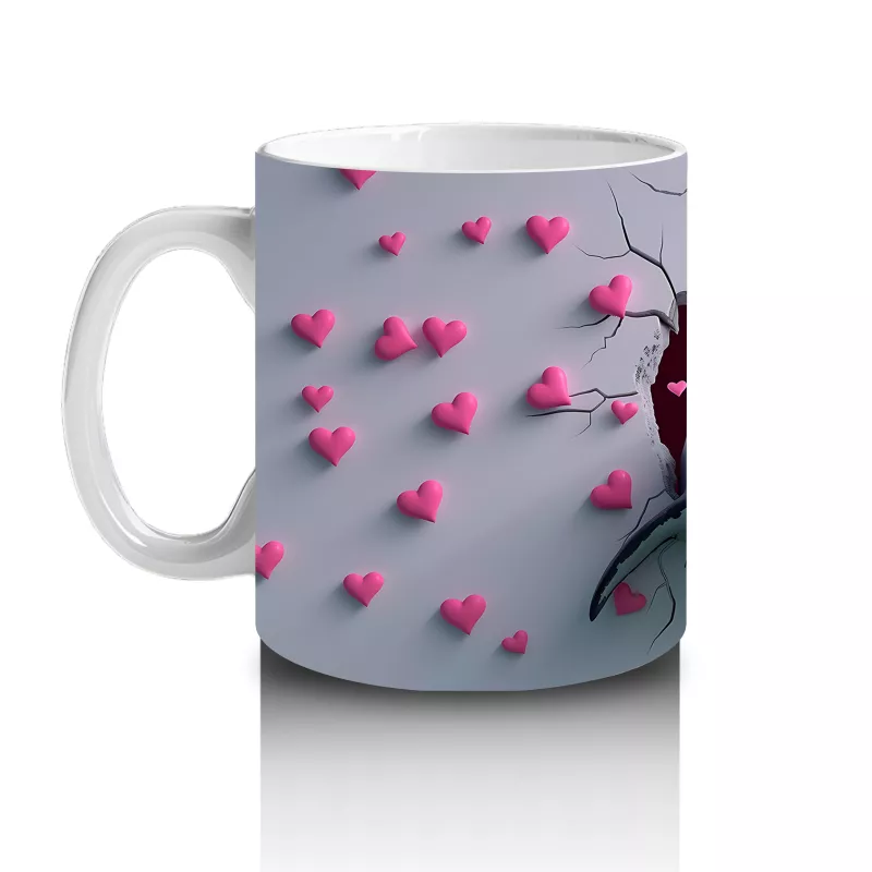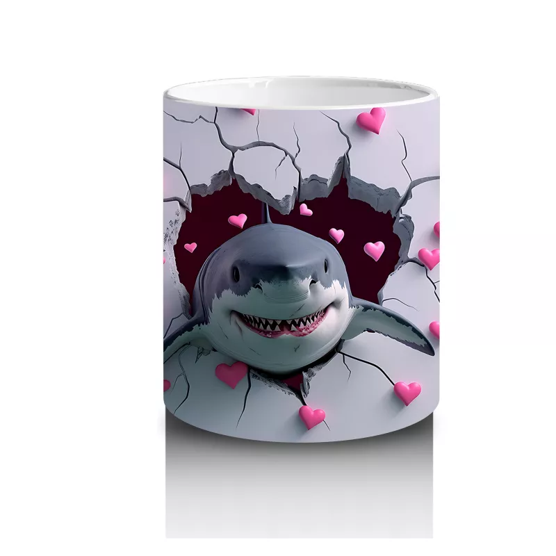 Kalplerle Çevrili Çatlak Zeminden Fırlayan Gülümseyen Köpekbalığı – Baskılı Kahve Kupası