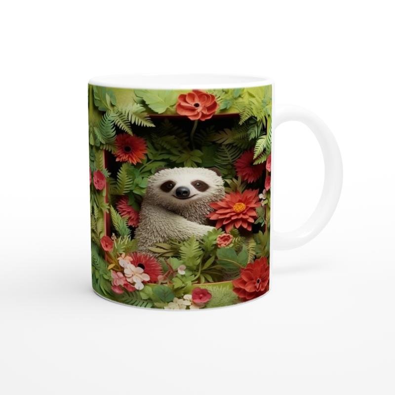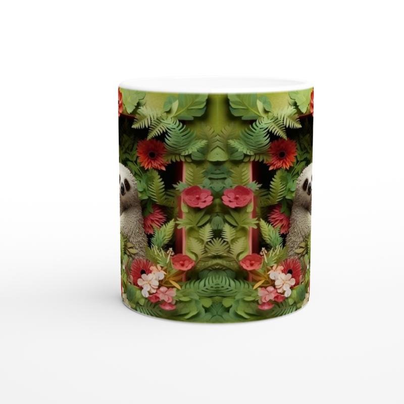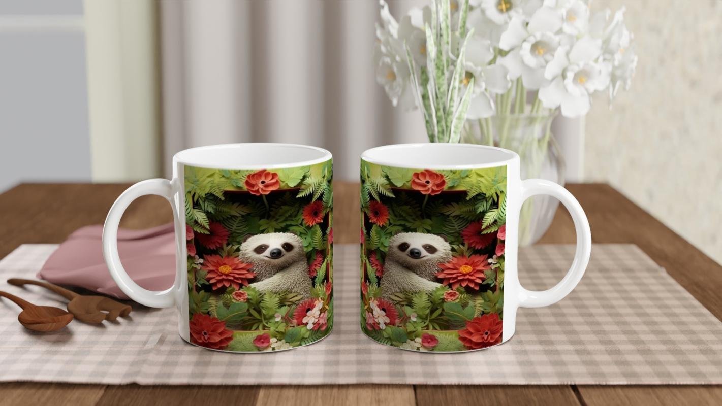 Çiçekler Arasında Gülümseyen Tembel Hayvan Temalı Baskılı Kupa Bardak, tropikal yapraklar ve canlı çiçeklerle çevrili tasarımıyla doğayı evinize taşır. Yavaş yaşamın keyfini çıkaranlara özel bir tercih.