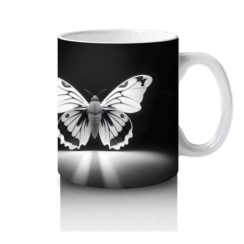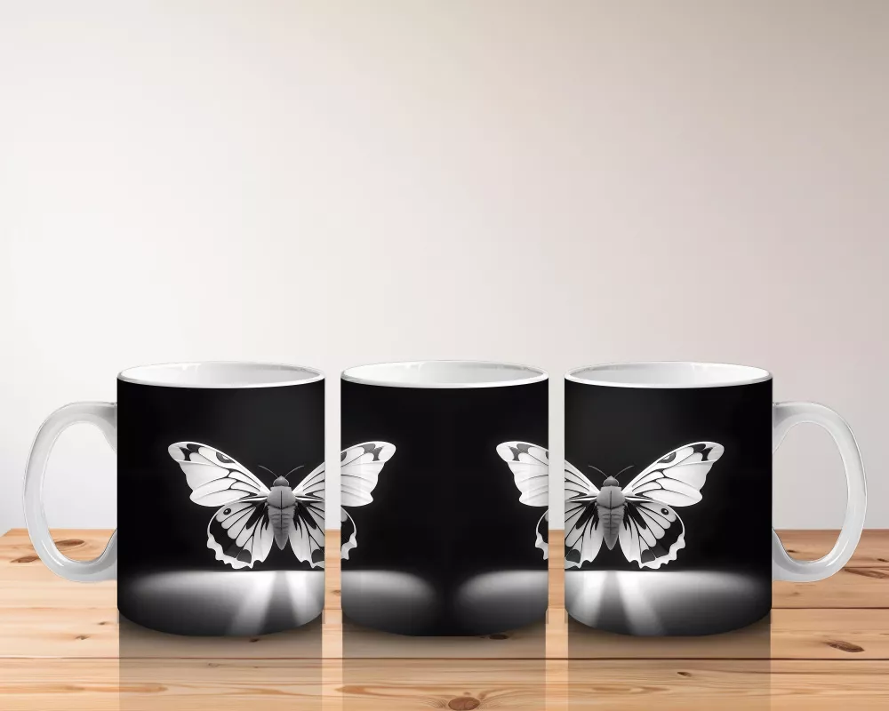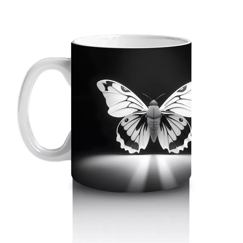 Siyah fon üzerinde parlayan gümüş kelebeklerin ayna yansıması, zarafet ve gizemi bir araya getiriyor. Modern ve sofistike tasarımları sevenler için iddialı bir kupa alternatifi.